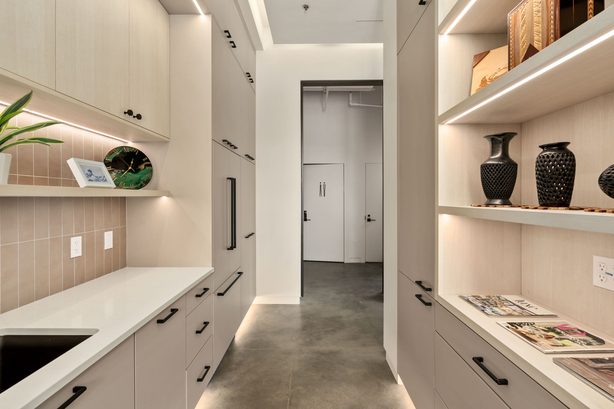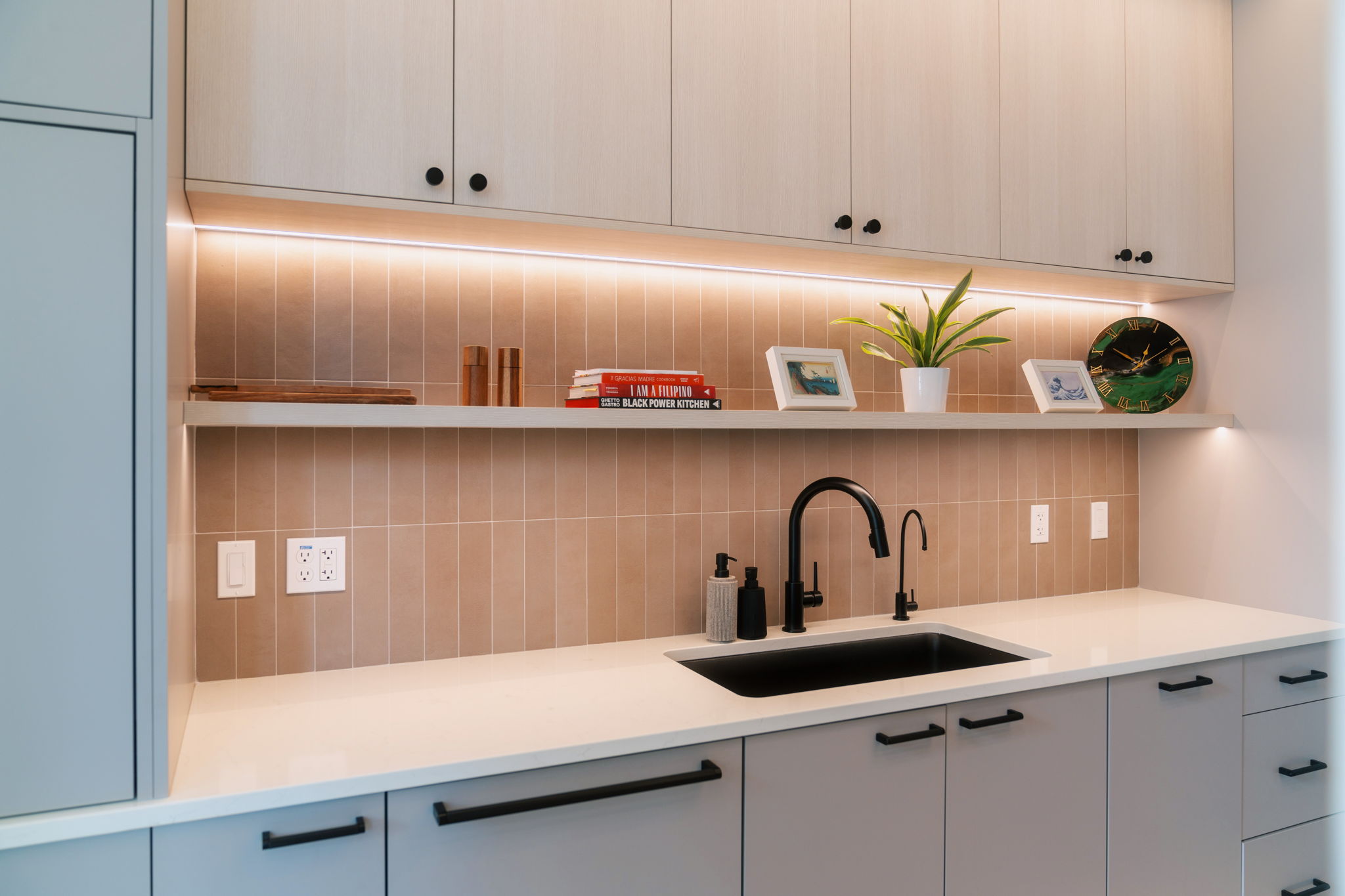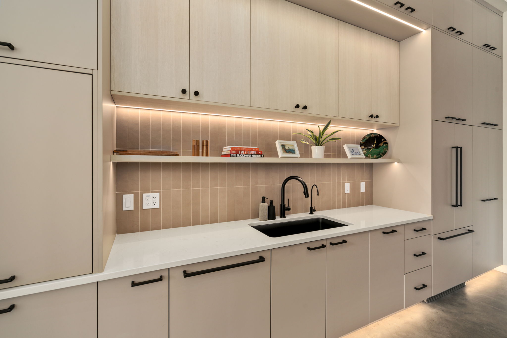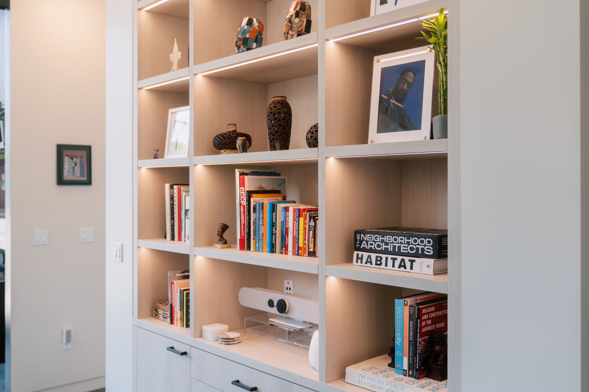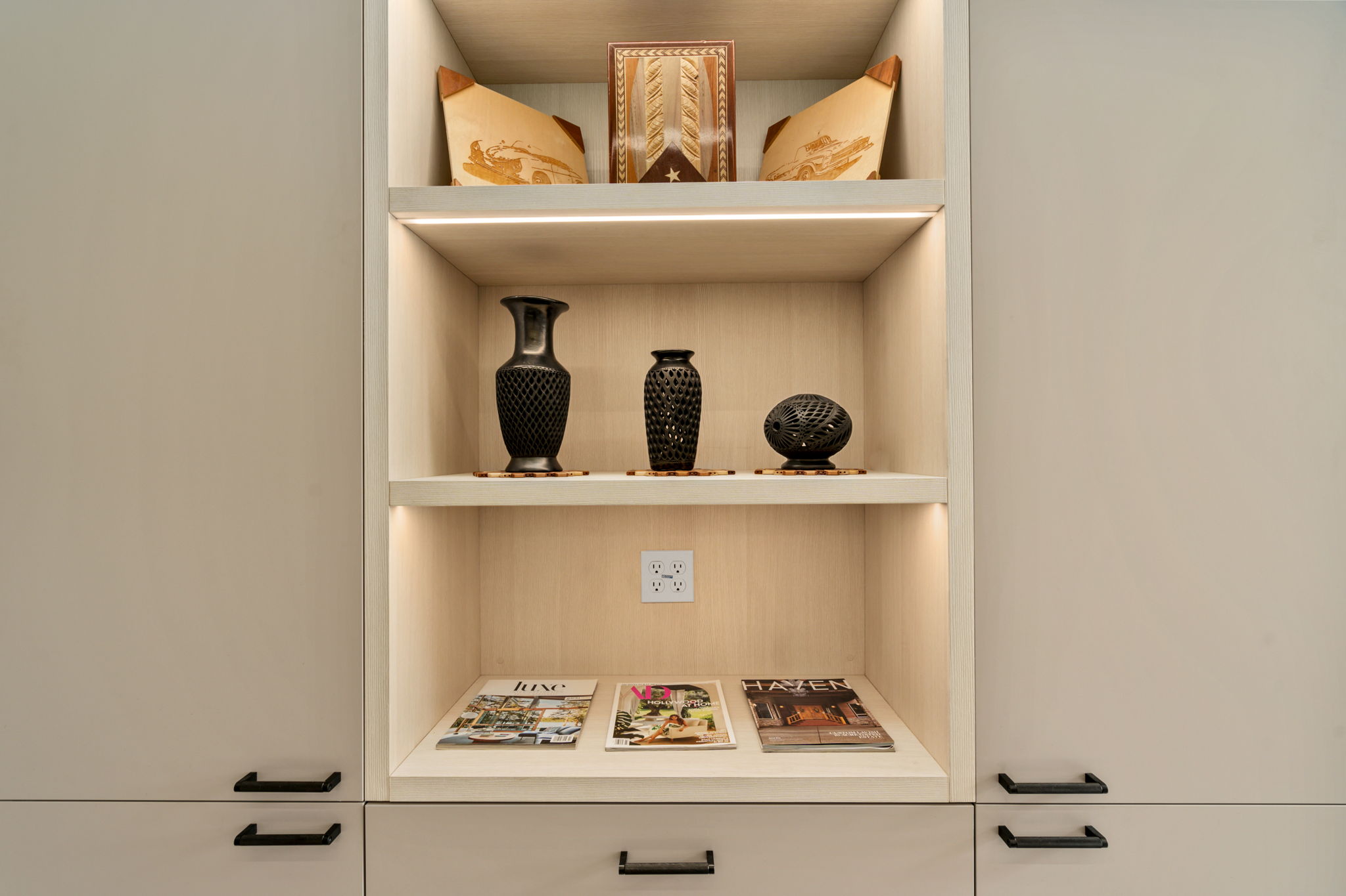 Clean lines, integrated open shelving, and thoughtful storage solutions elevate both form and function—creating a workspace that feels calm, organized, and effortlessly sophisticated. Paired with minimalist hardware, warm under-shelf lighting, and curated décor, the cabinetry becomes a seamless blend of modern design and everyday practicality.