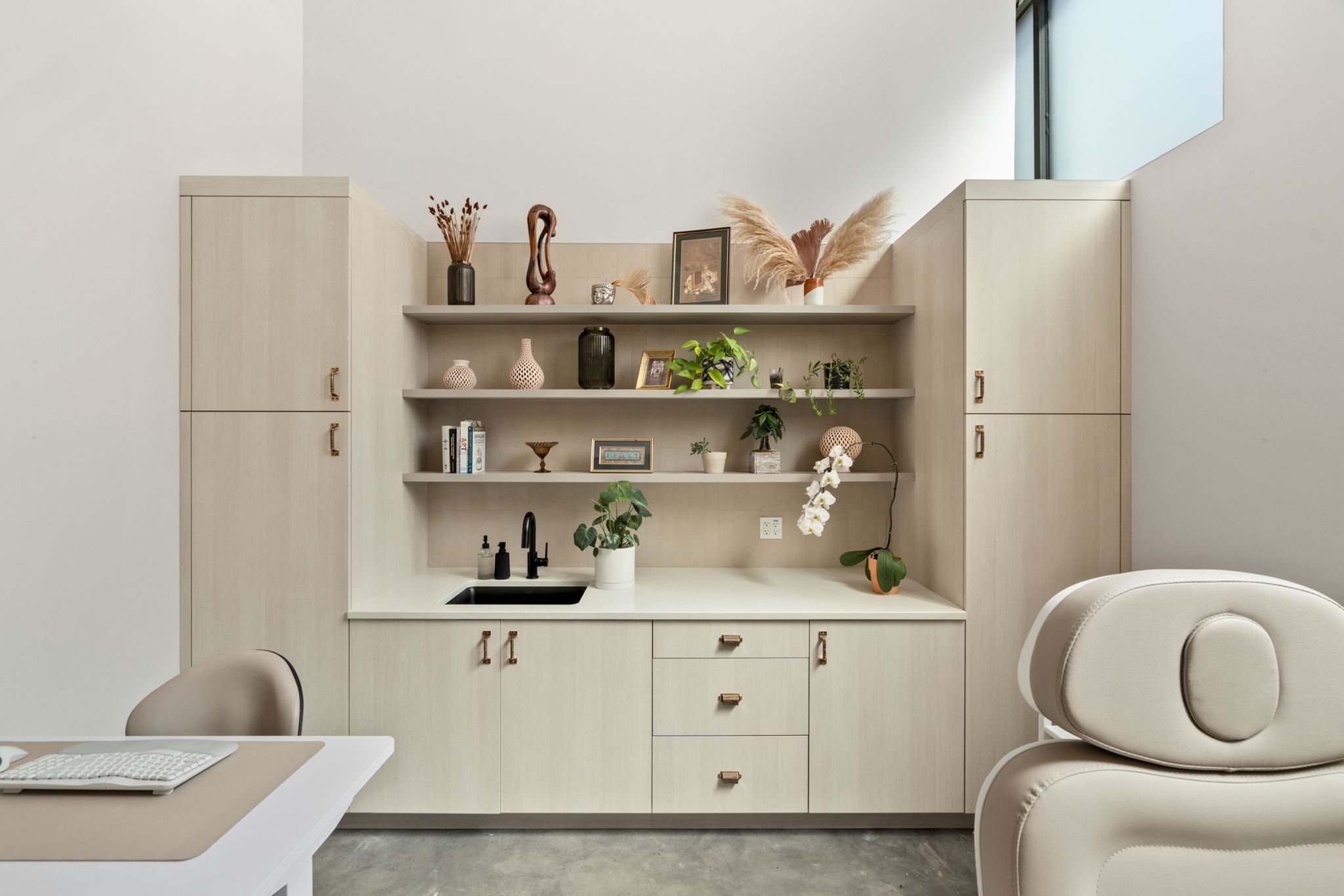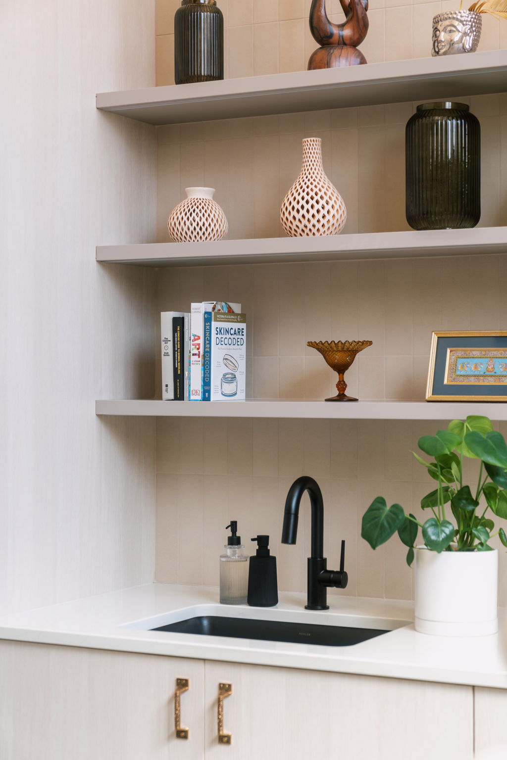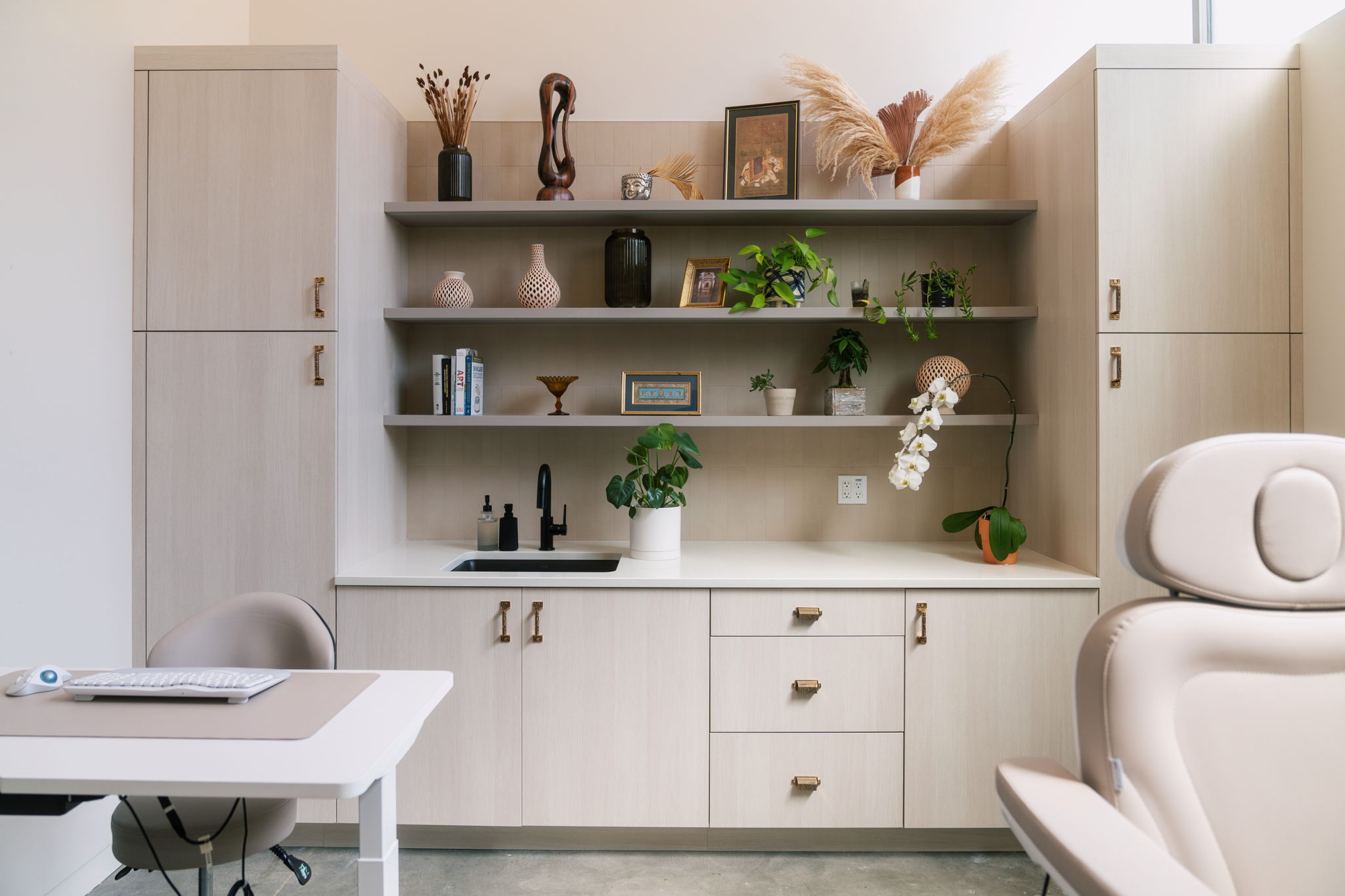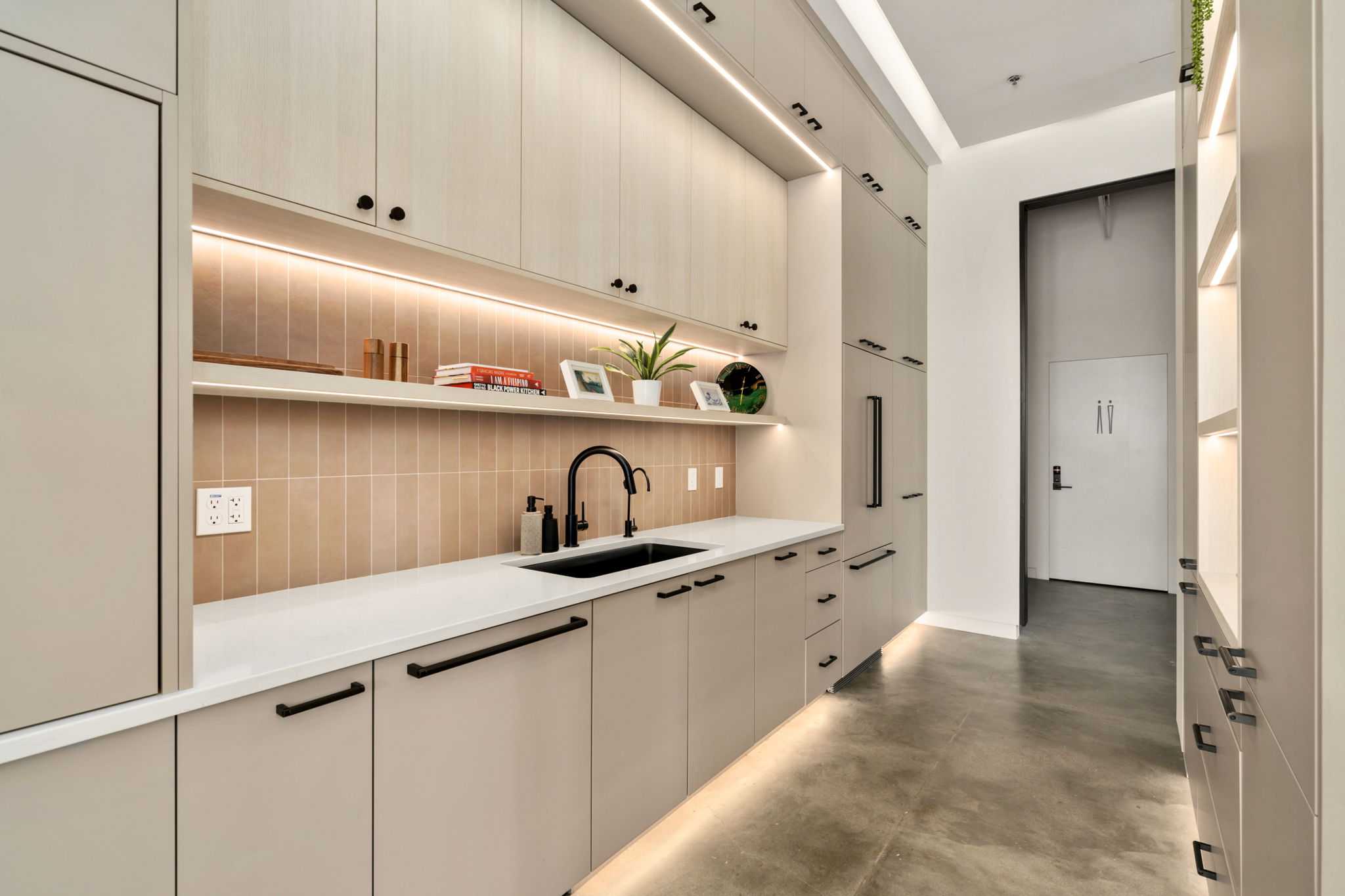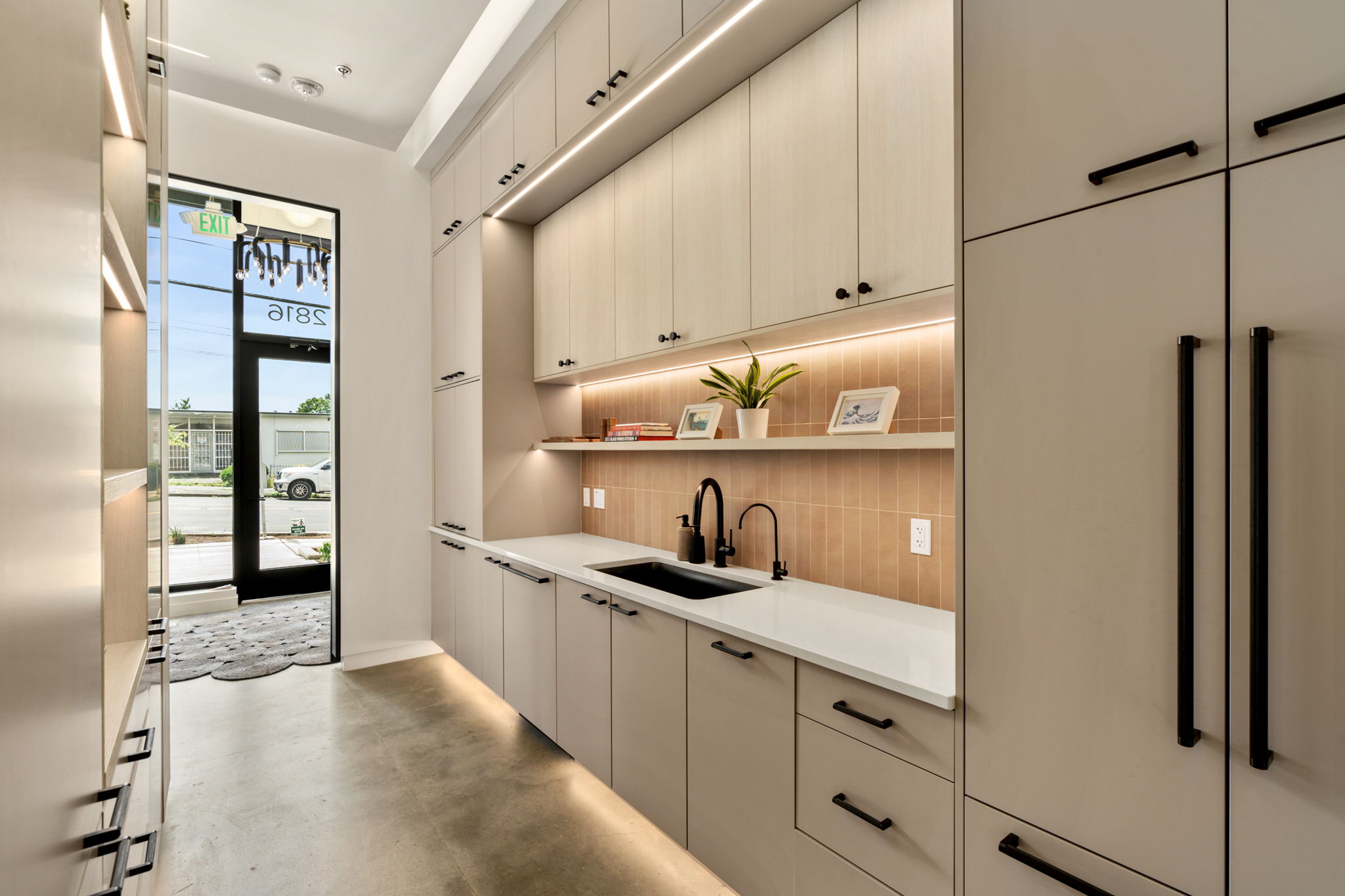 Clean lines, integrated open shelving, and thoughtful storage solutions elevate both form and function—creating a workspace that feels calm, organized, and effortlessly sophisticated. Paired with minimalist hardware, warm under-shelf lighting, and curated décor, the cabinetry becomes a seamless blend of modern design and everyday practicality.