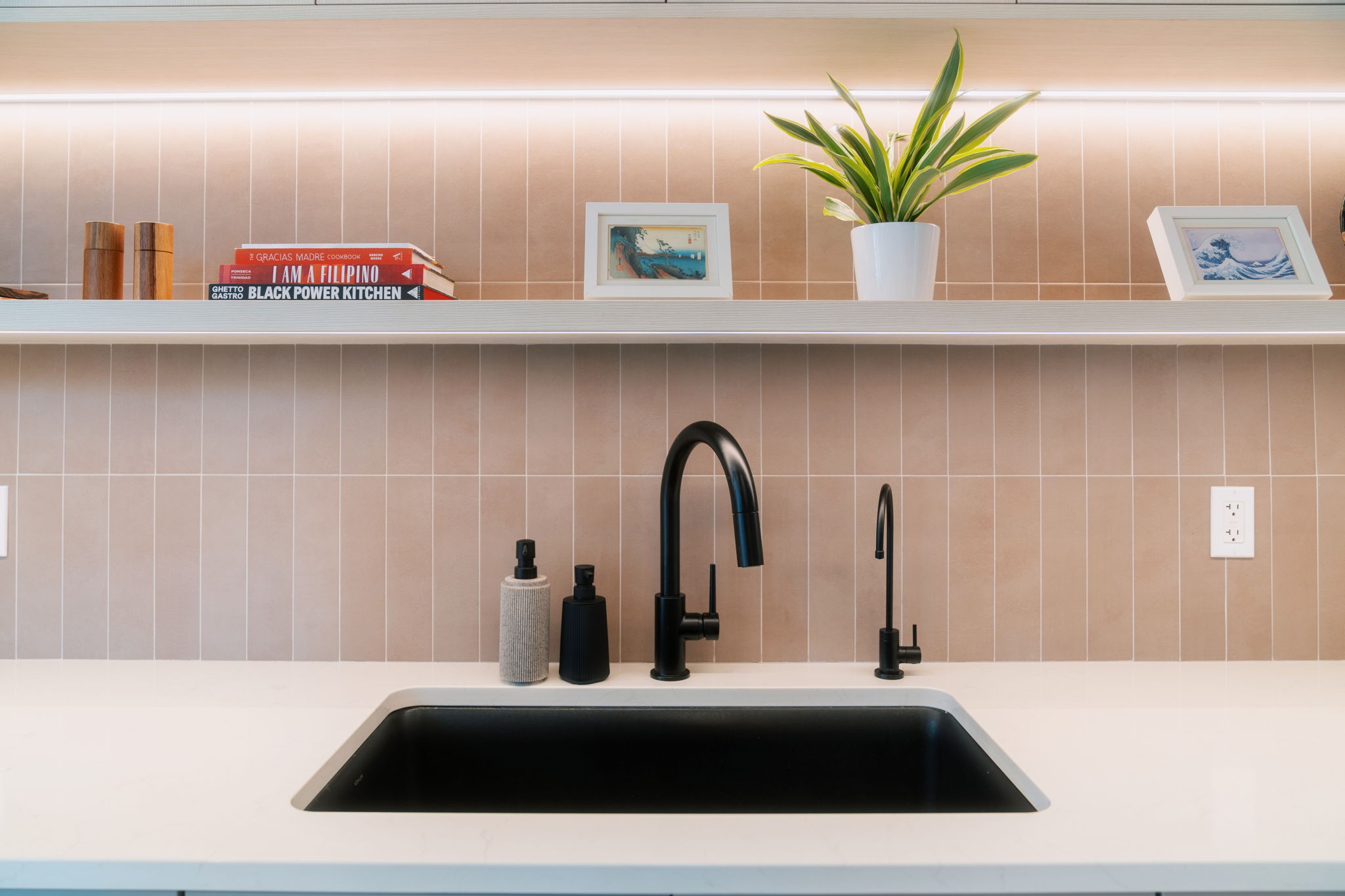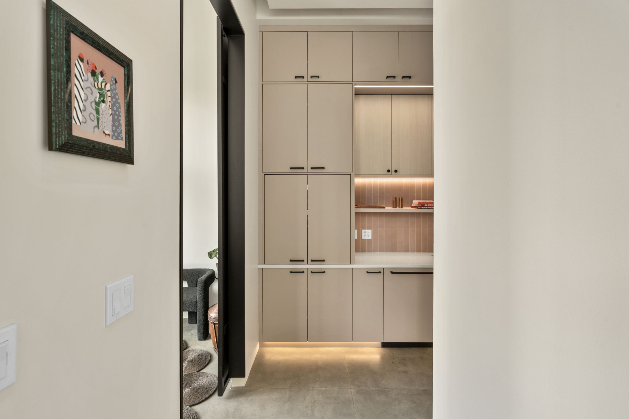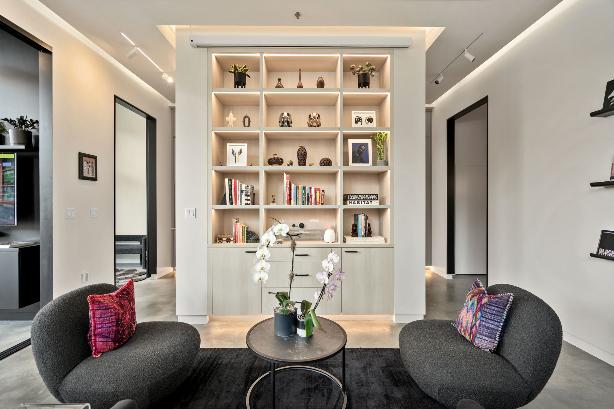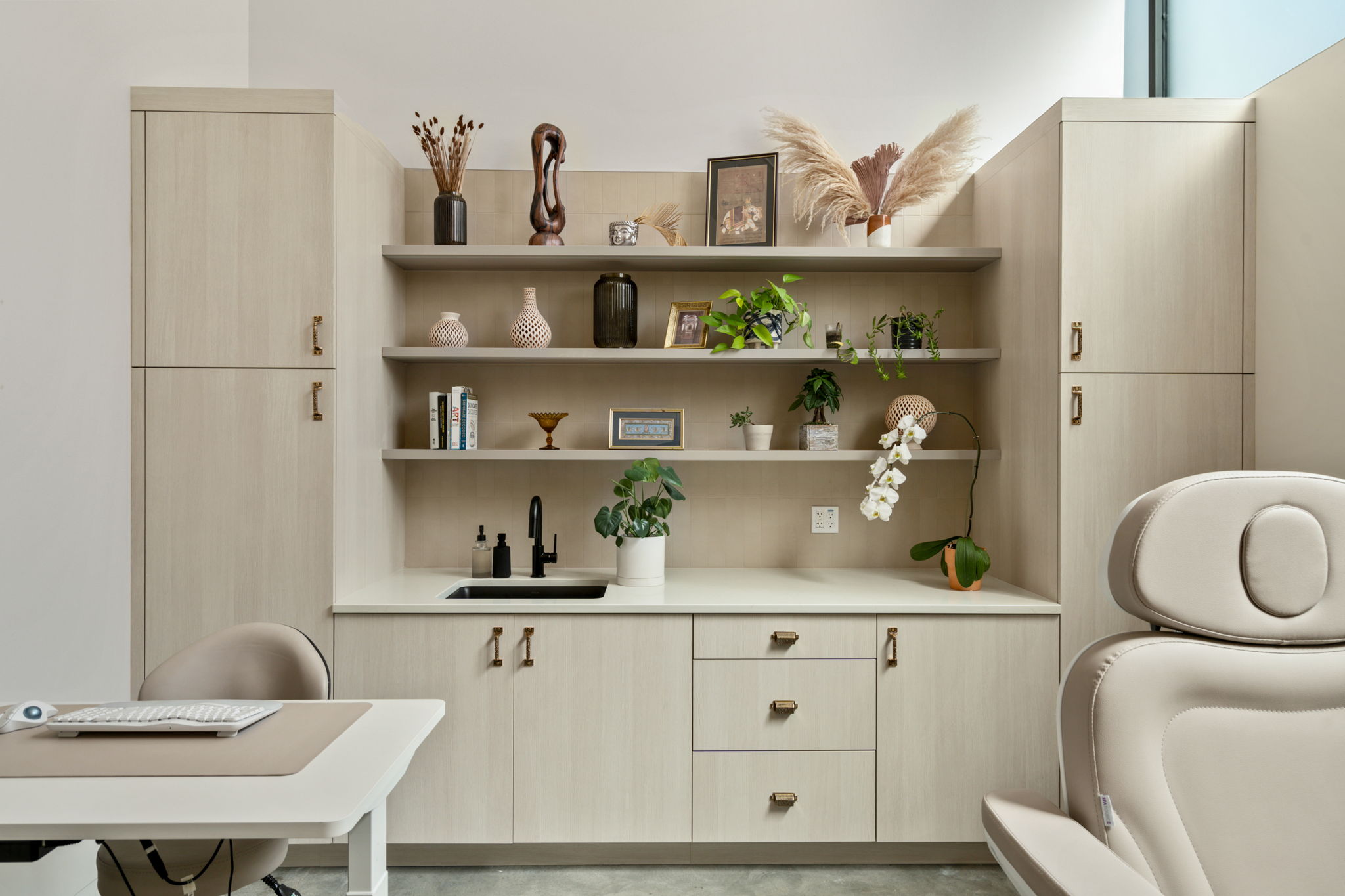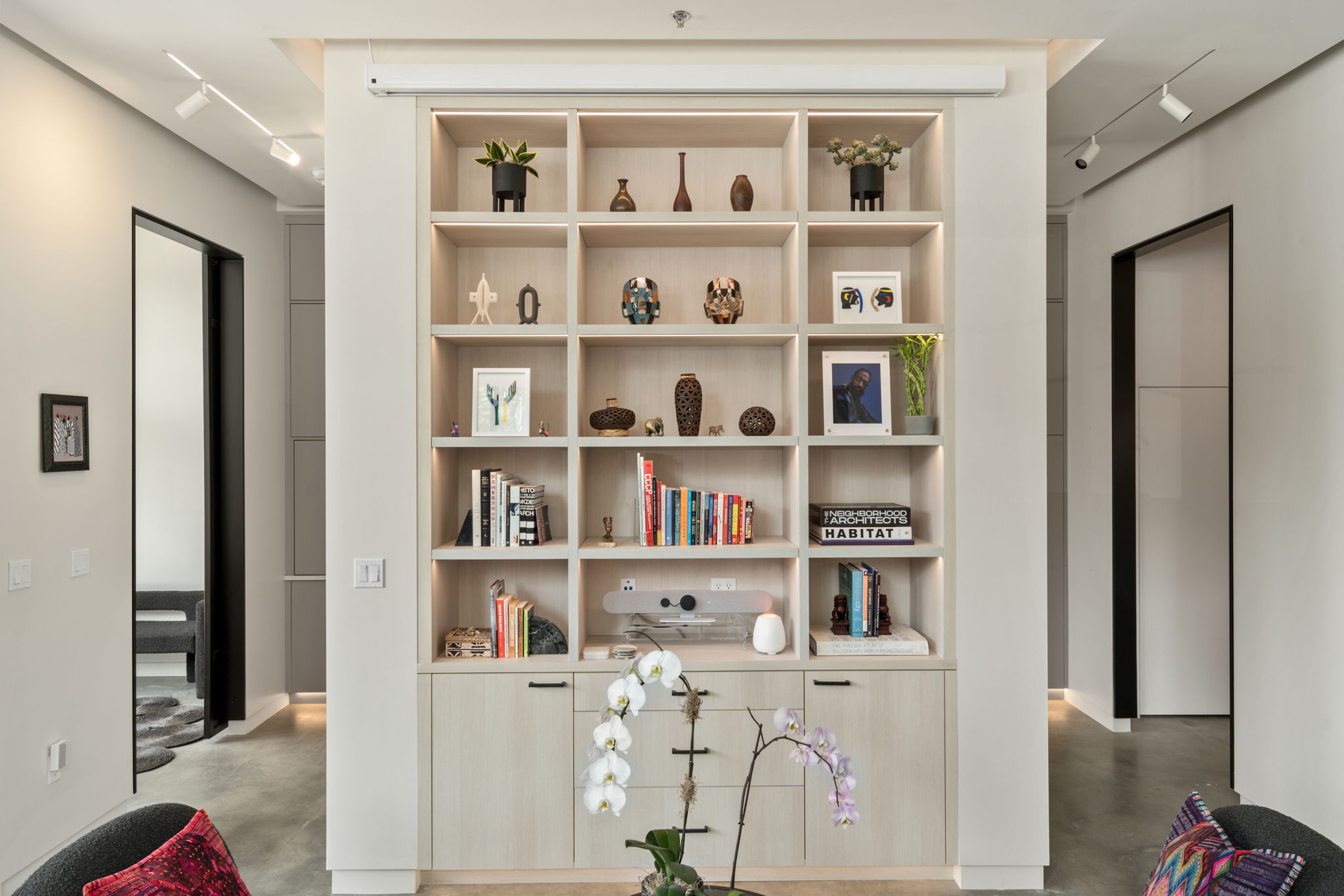 Clean lines, integrated open shelving, and thoughtful storage solutions elevate both form and function—creating a workspace that feels calm, organized, and effortlessly sophisticated. Paired with minimalist hardware, warm under-shelf lighting, and curated décor, the cabinetry becomes a seamless blend of modern design and everyday practicality.