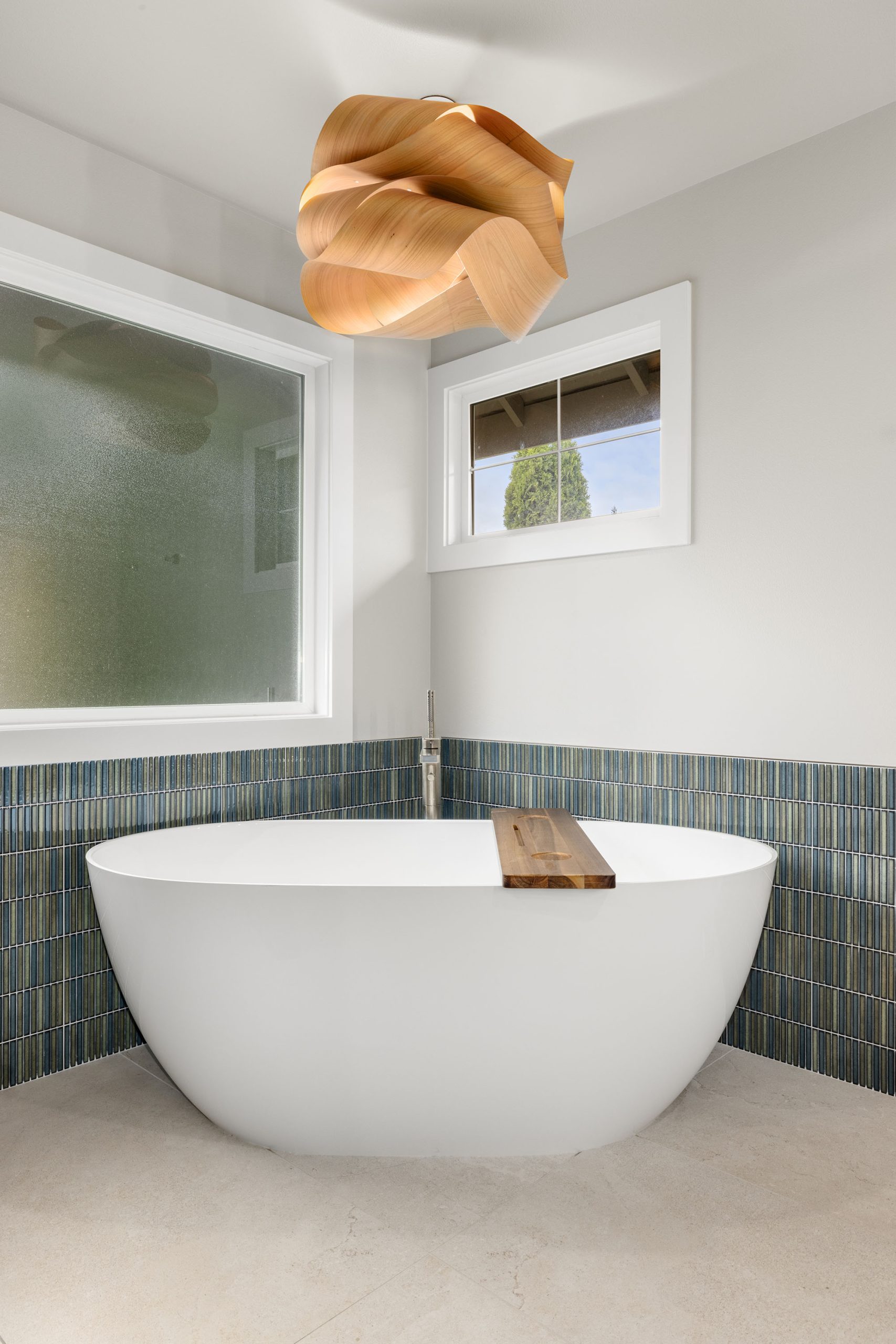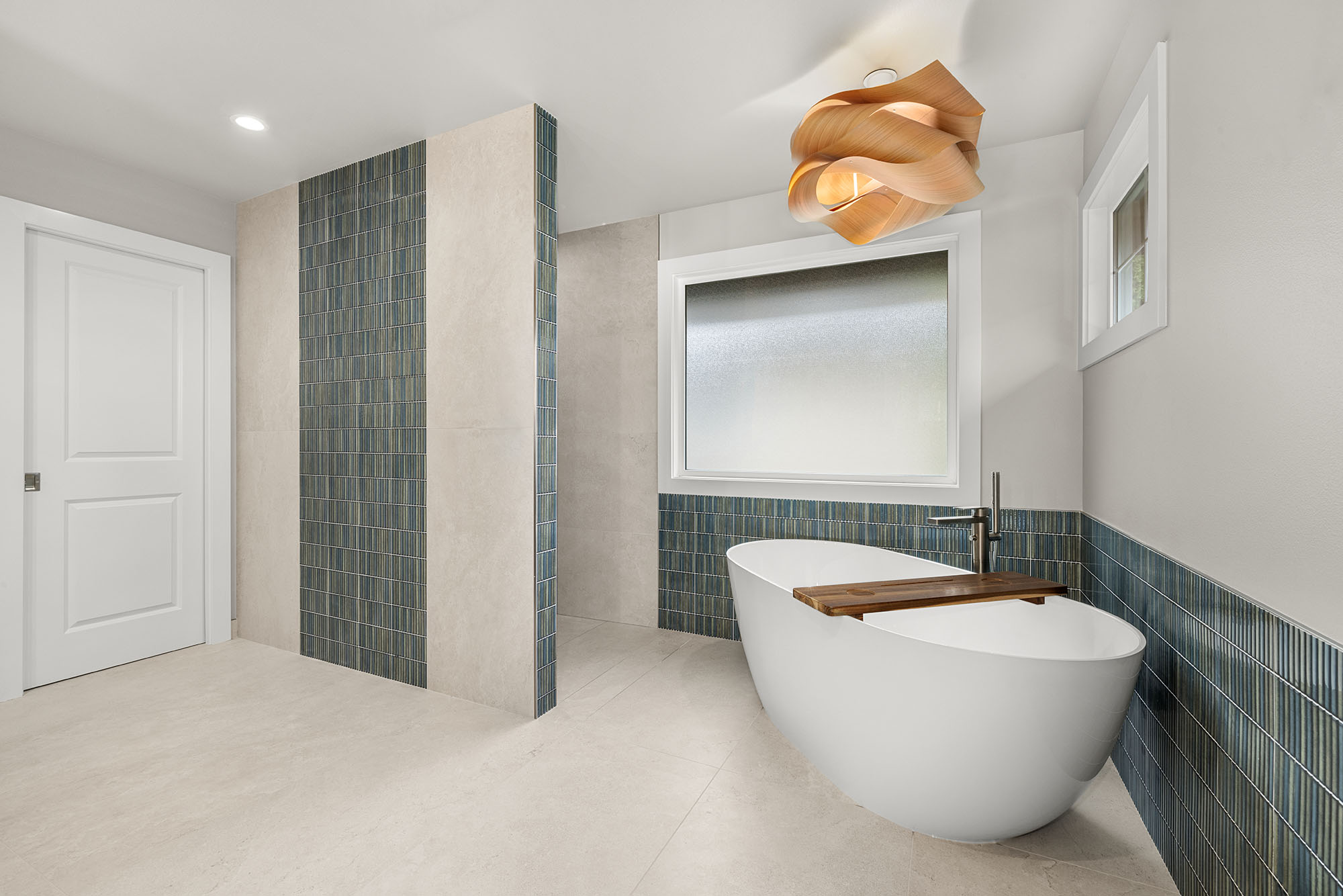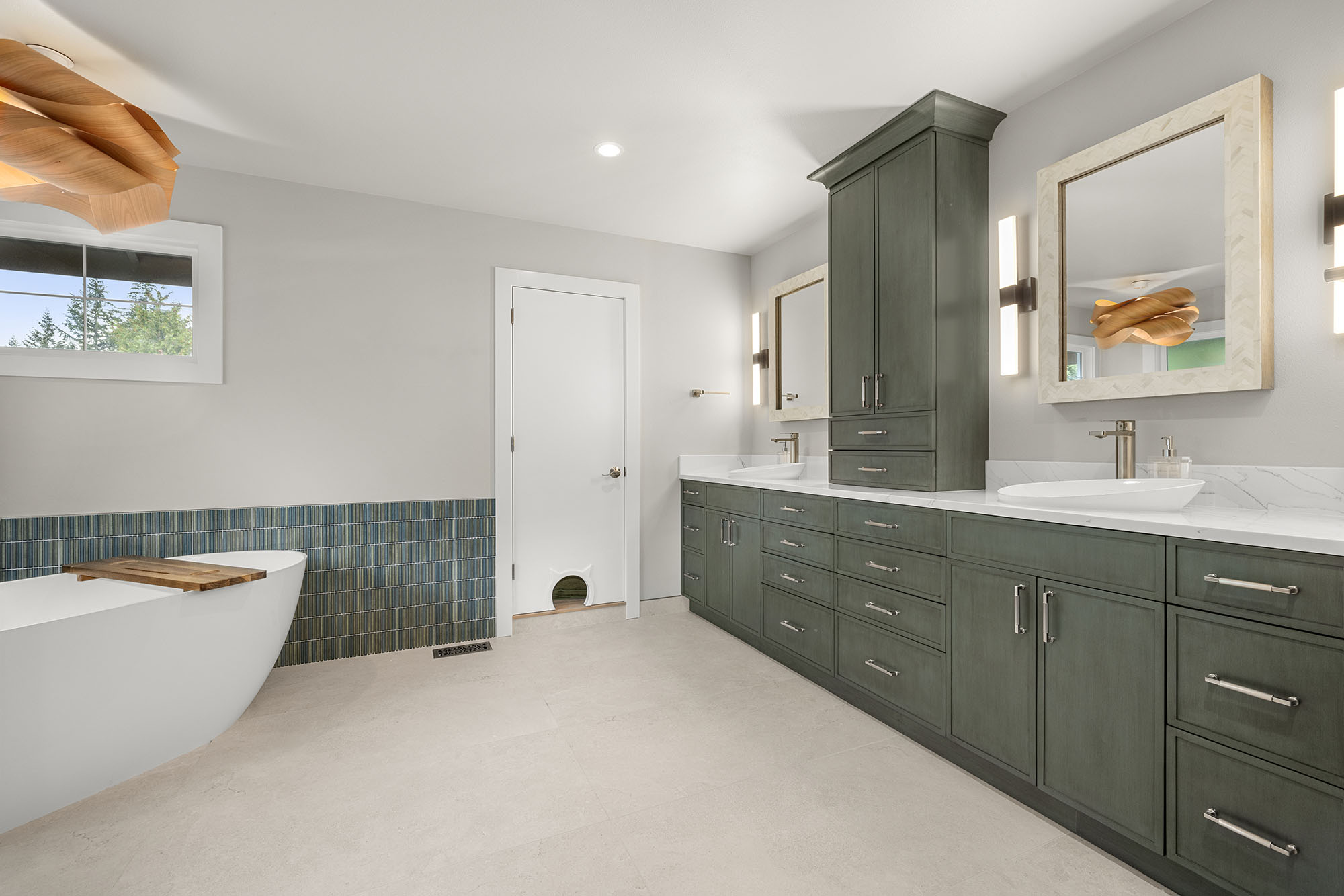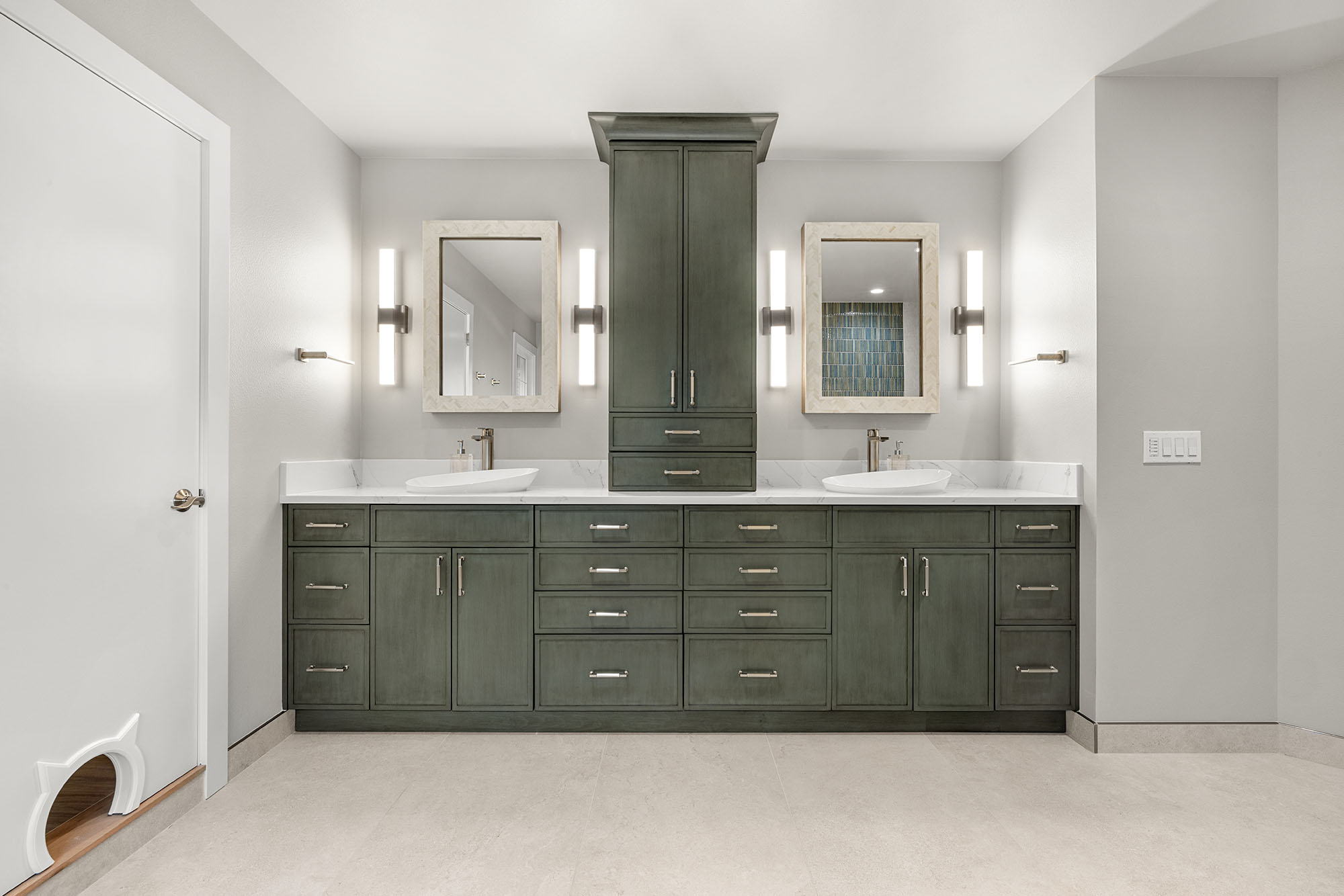 This bath addition remodel showcases timeless craftsmanship and natural warmth through beautifully detailed Sollera Cabinets in the Bradford door style. Finished in Clear Alder Cottage Green with Black Glaze, the cabinetry adds depth and sophistication, blending rustic charm with a modern edge.