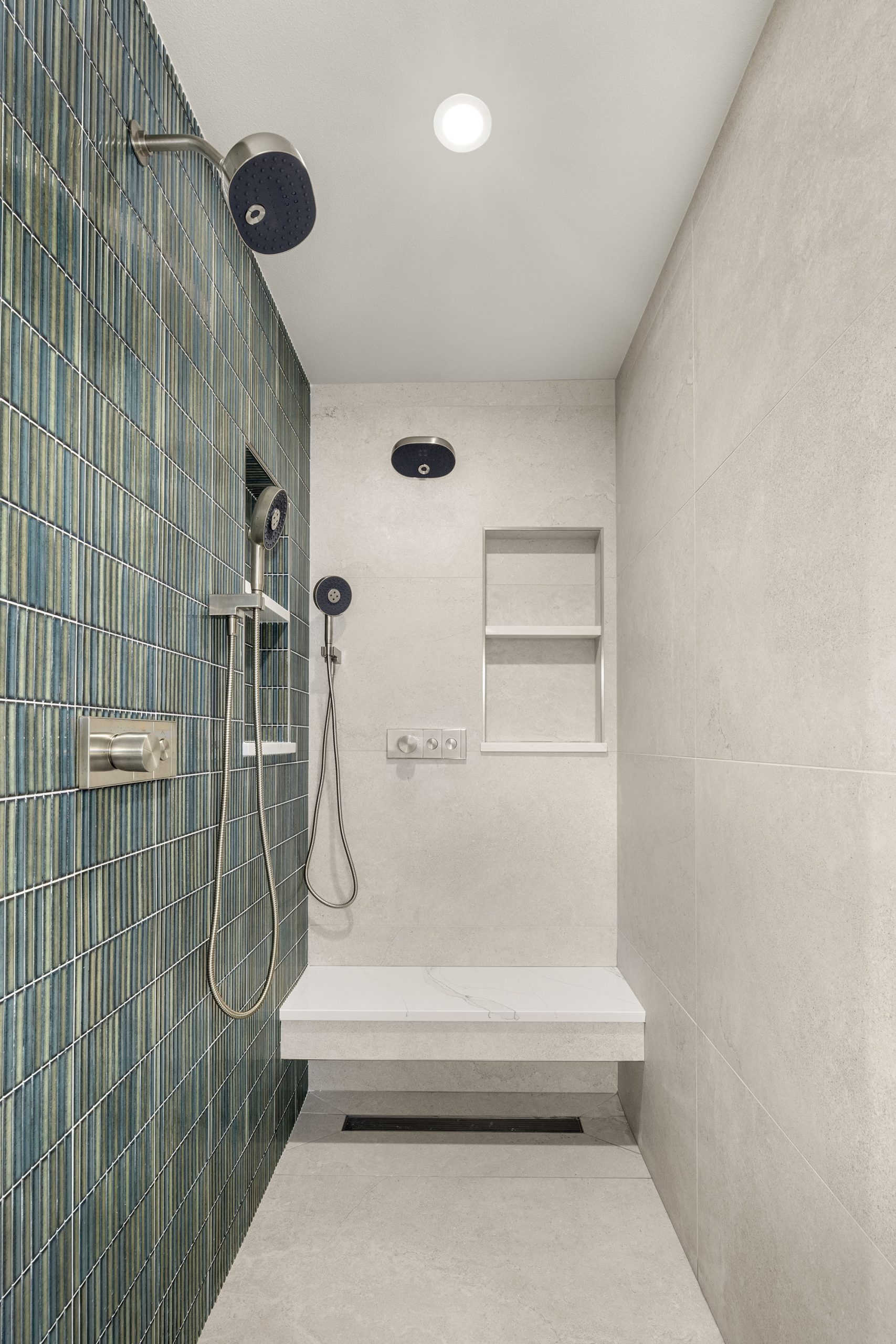 The symmetrical double vanity offers ample storage and balance, enhanced by sleek hardware and elegant lighting. Paired with soft neutral walls and marble-inspired countertops, this space feels calm, functional, and effortlessly stylish — a perfect harmony of design and detail.
