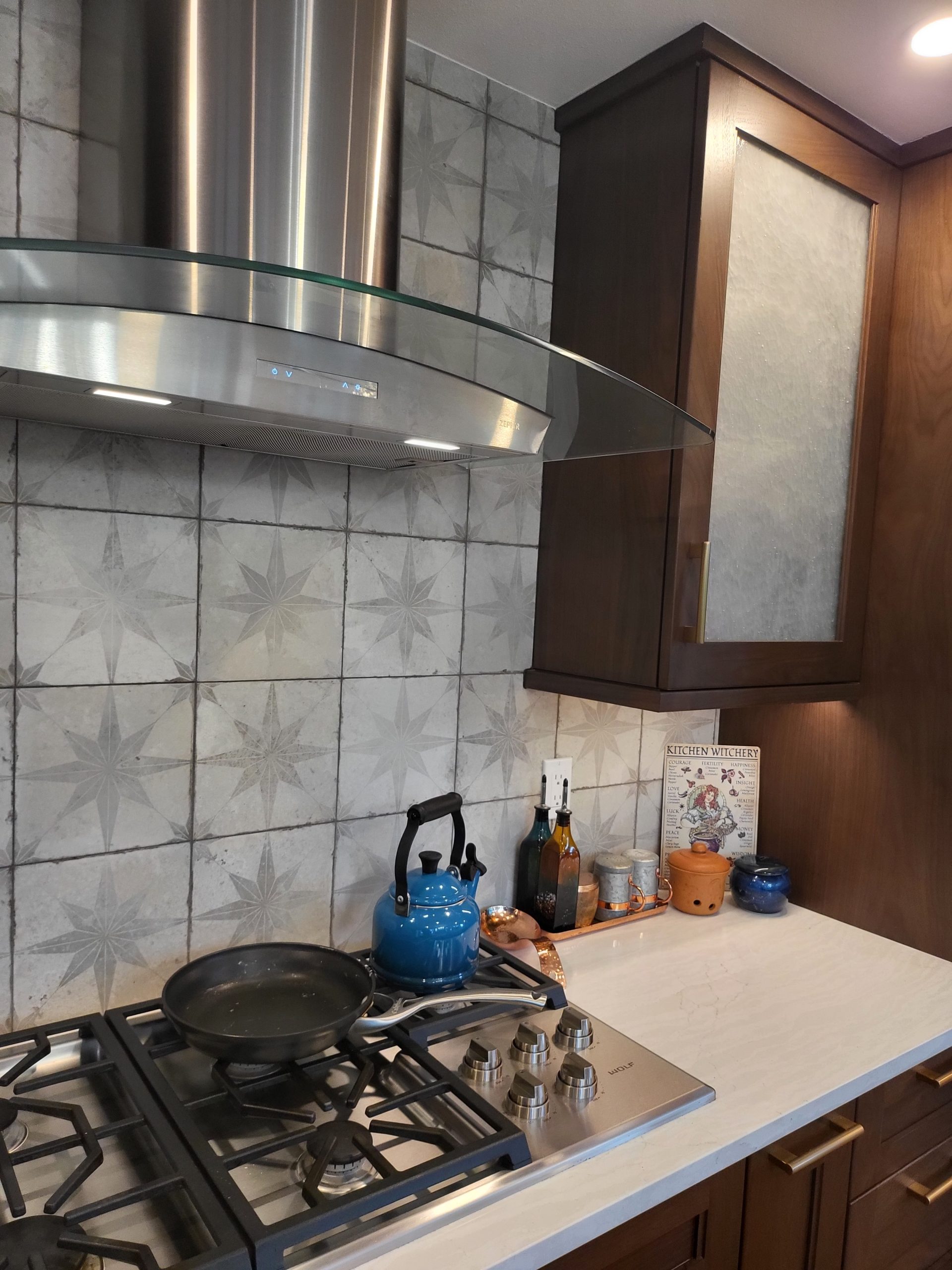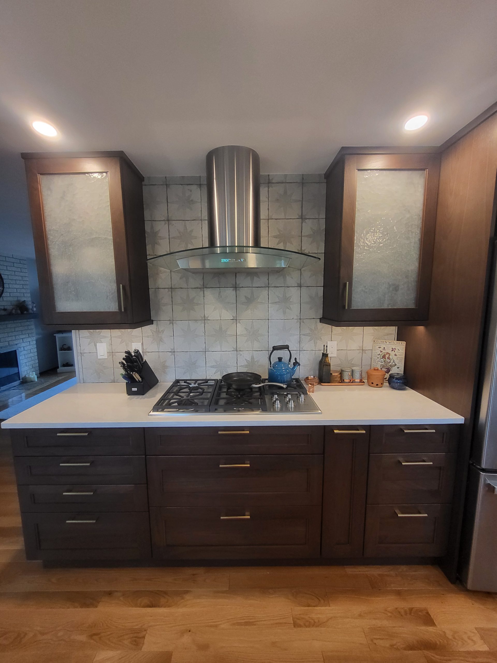 Expansive countertops provide generous workspace for cooking and entertaining, complemented by the sleek stainless steel appliances and a modern gas cooktop framed by eye-catching star-patterned tile. Frosted-glass upper cabinets add softness and visual interest, balancing openness with discreet storage.