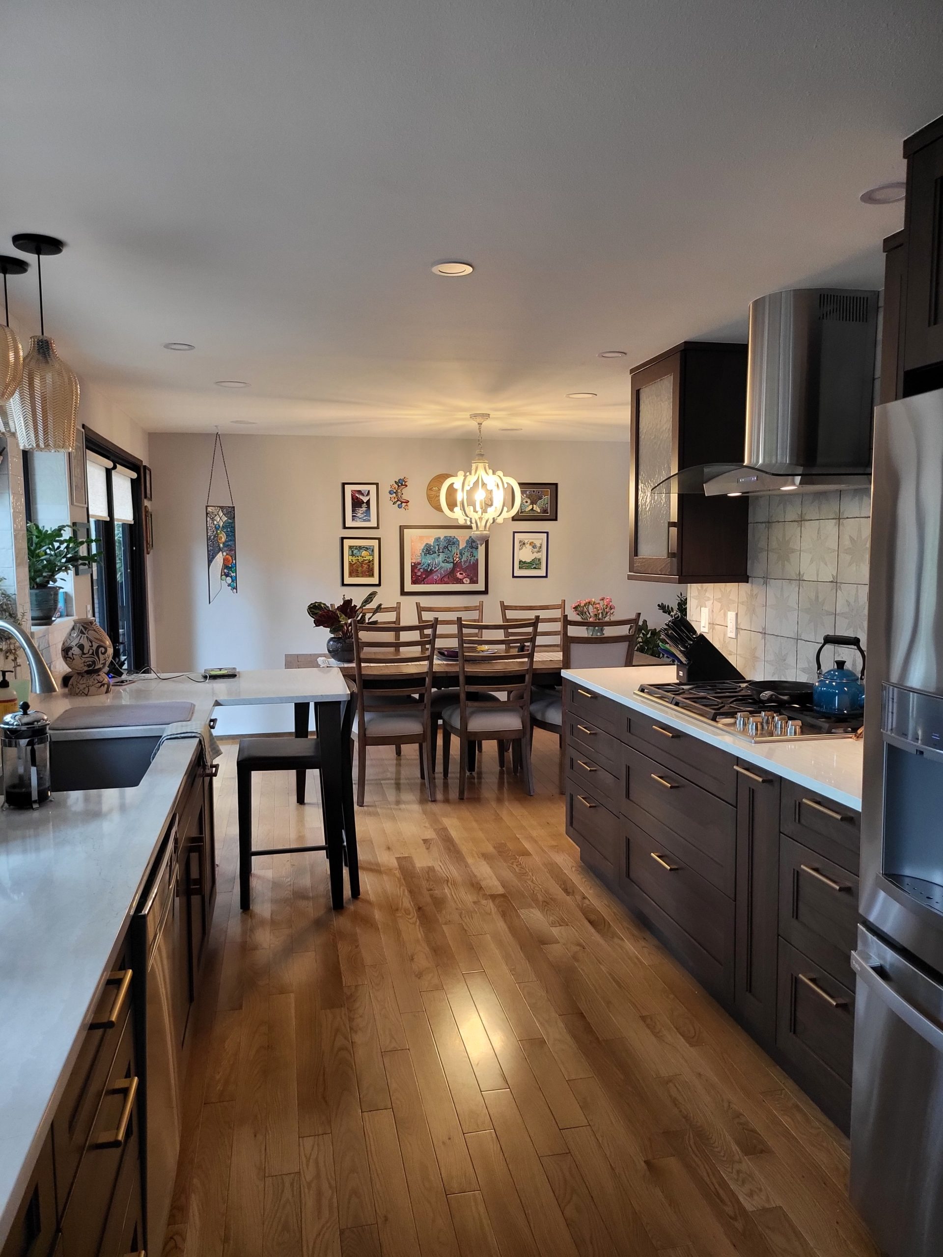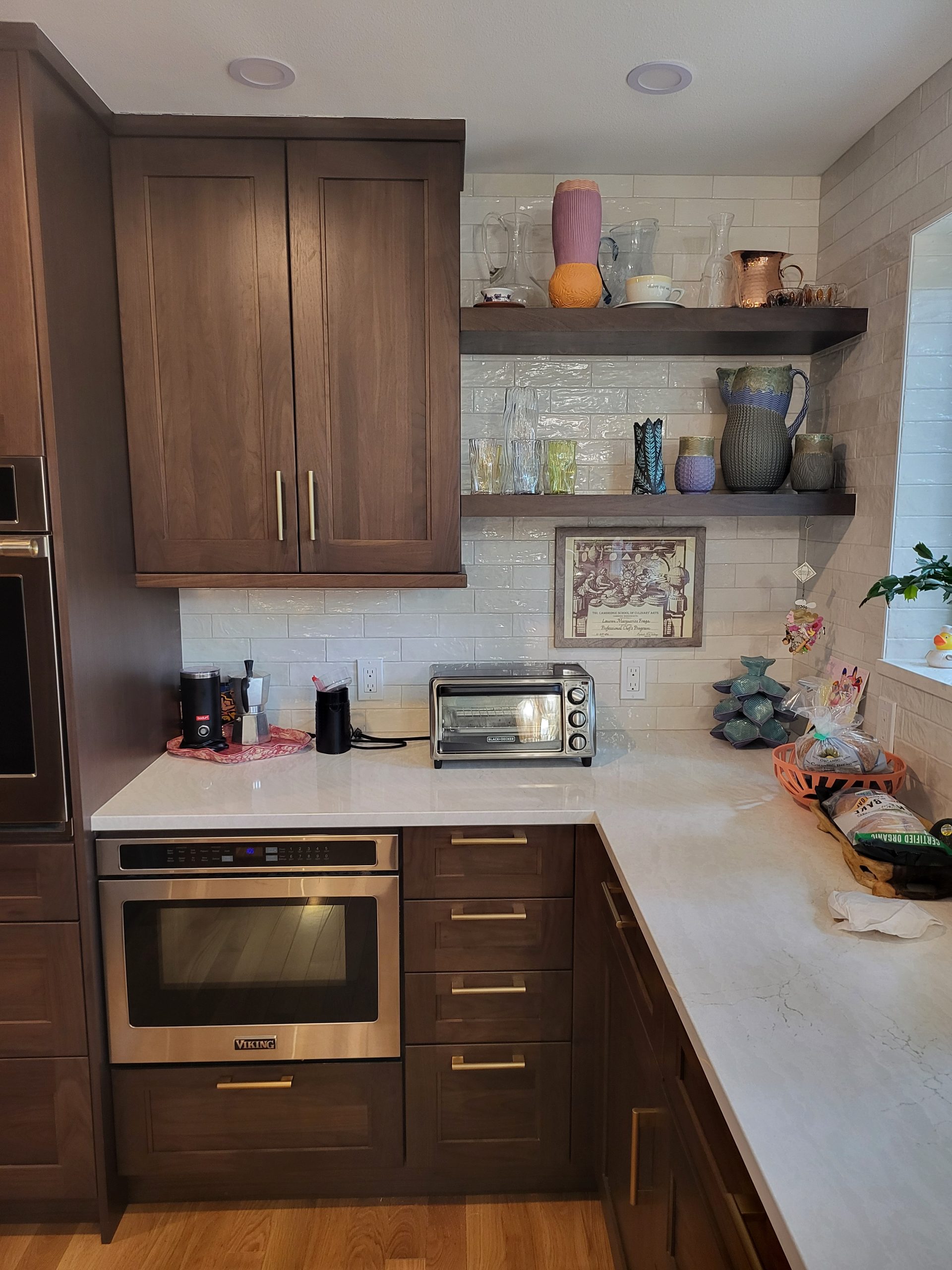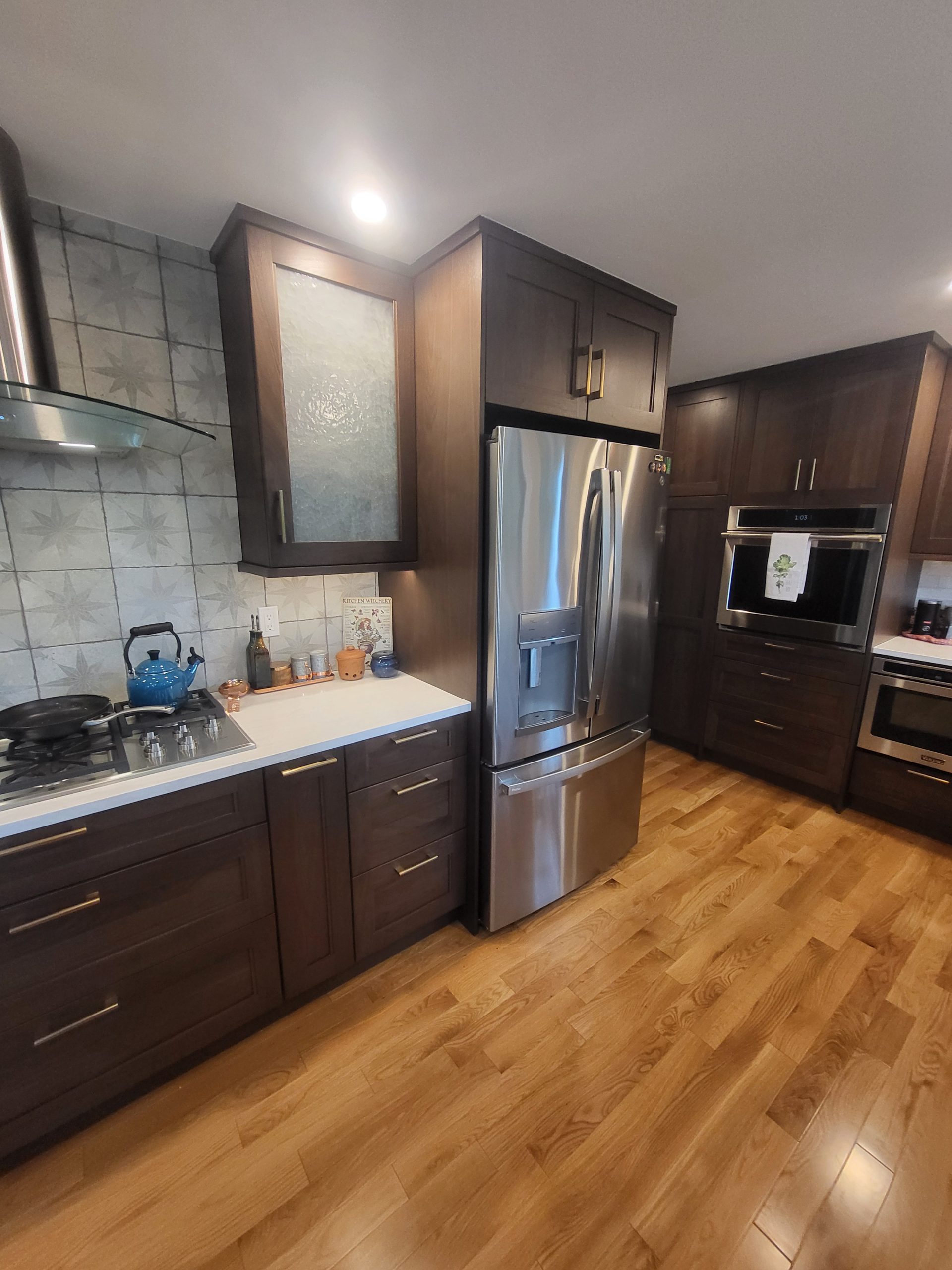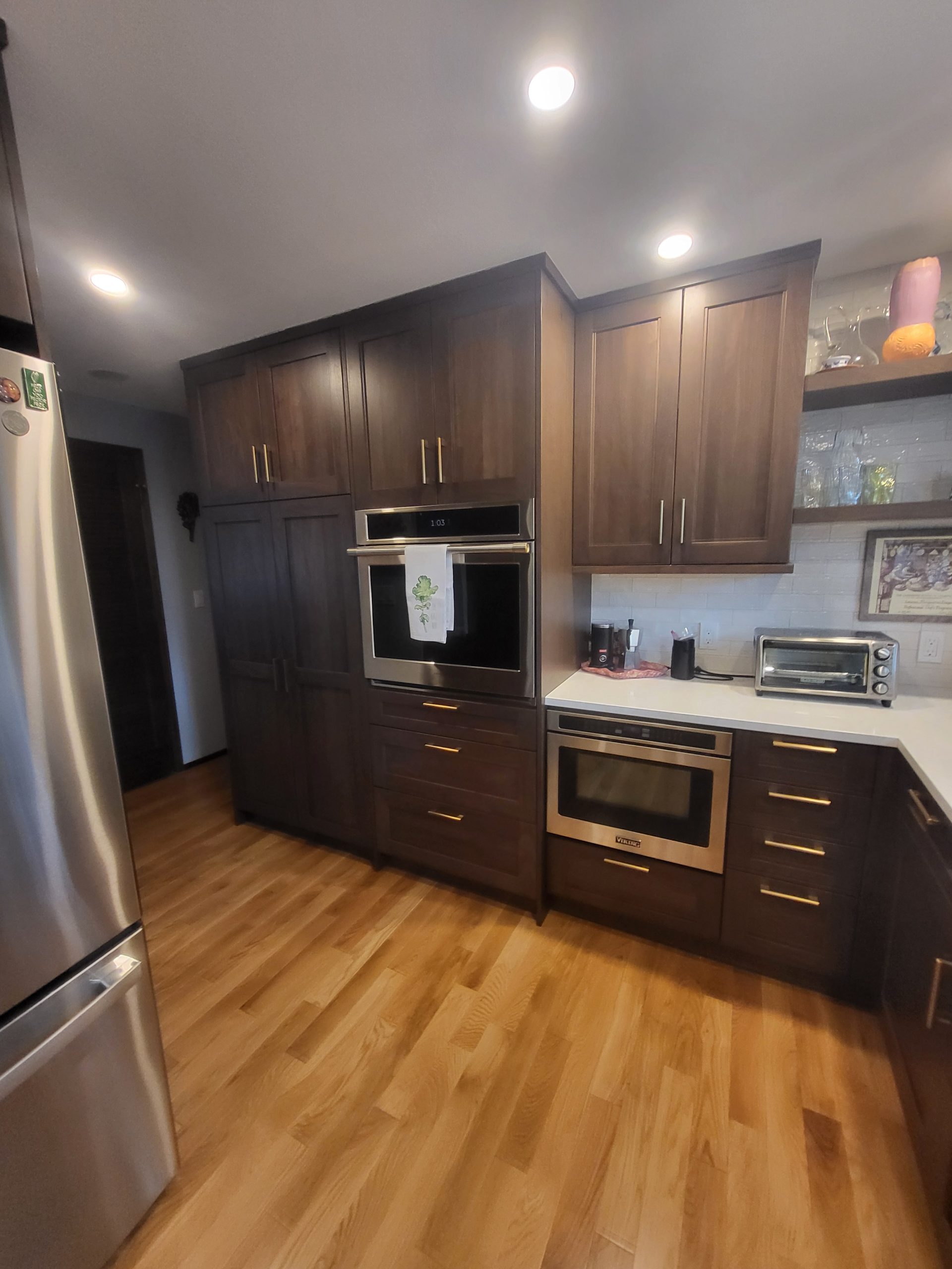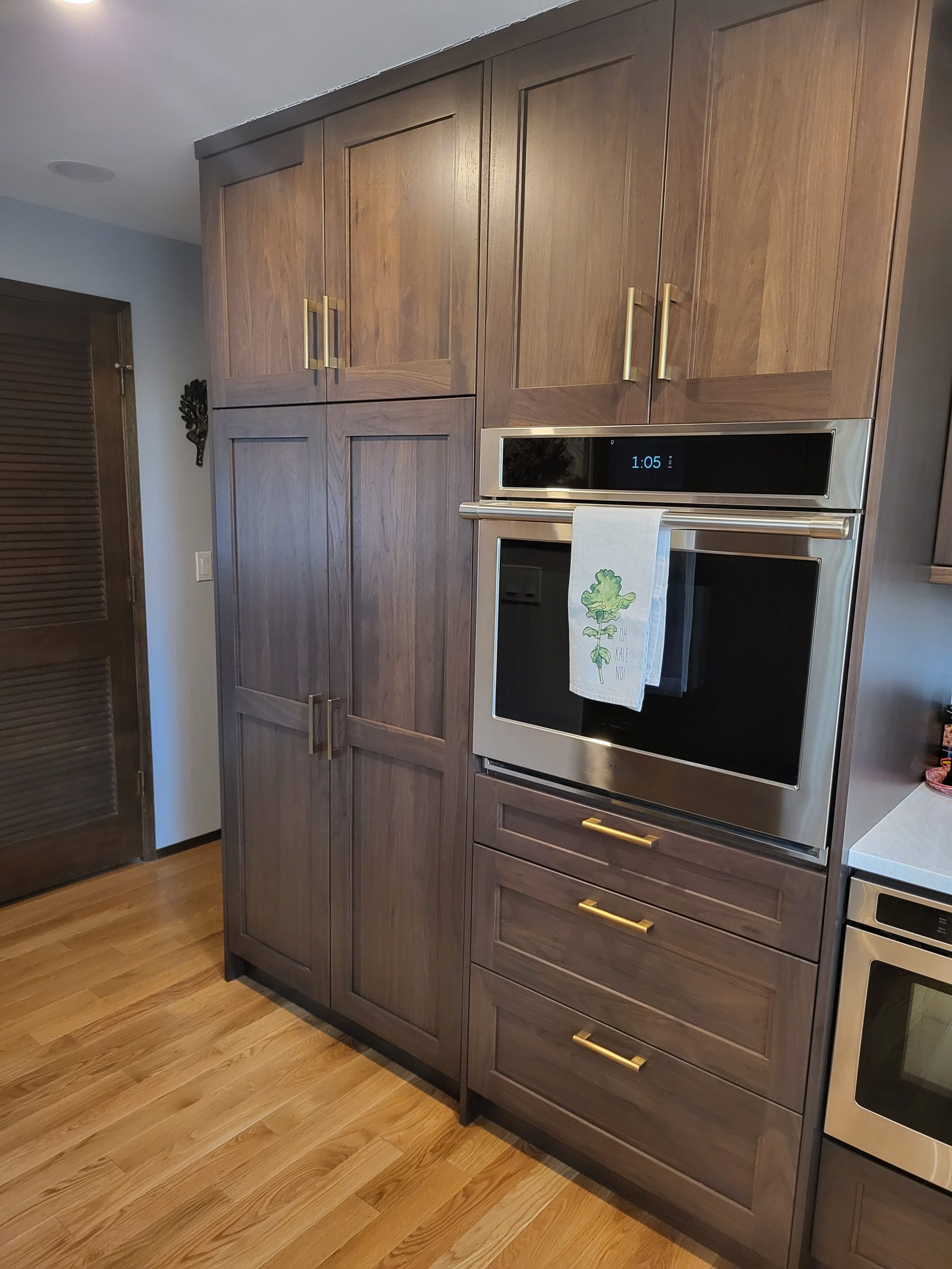 This beautifully renovated kitchen blends warmth, elegance, and contemporary function through a thoughtful redesign featuring Sollera Fine Cabinetry in Bristol Walnut Driftwood. The rich, walnut-toned cabinets create a grounded and inviting atmosphere, while their clean, transitional lines offer timeless appeal.