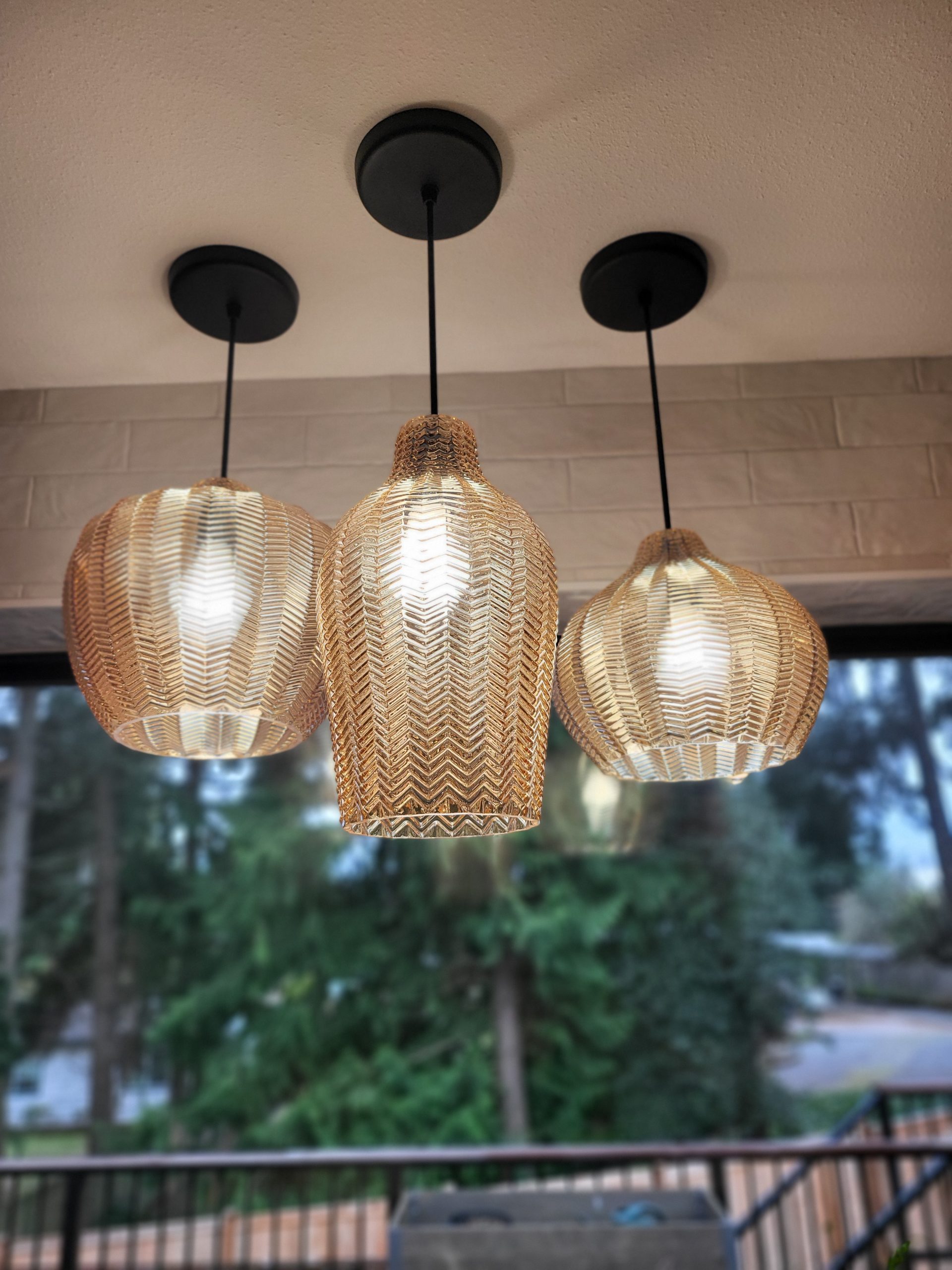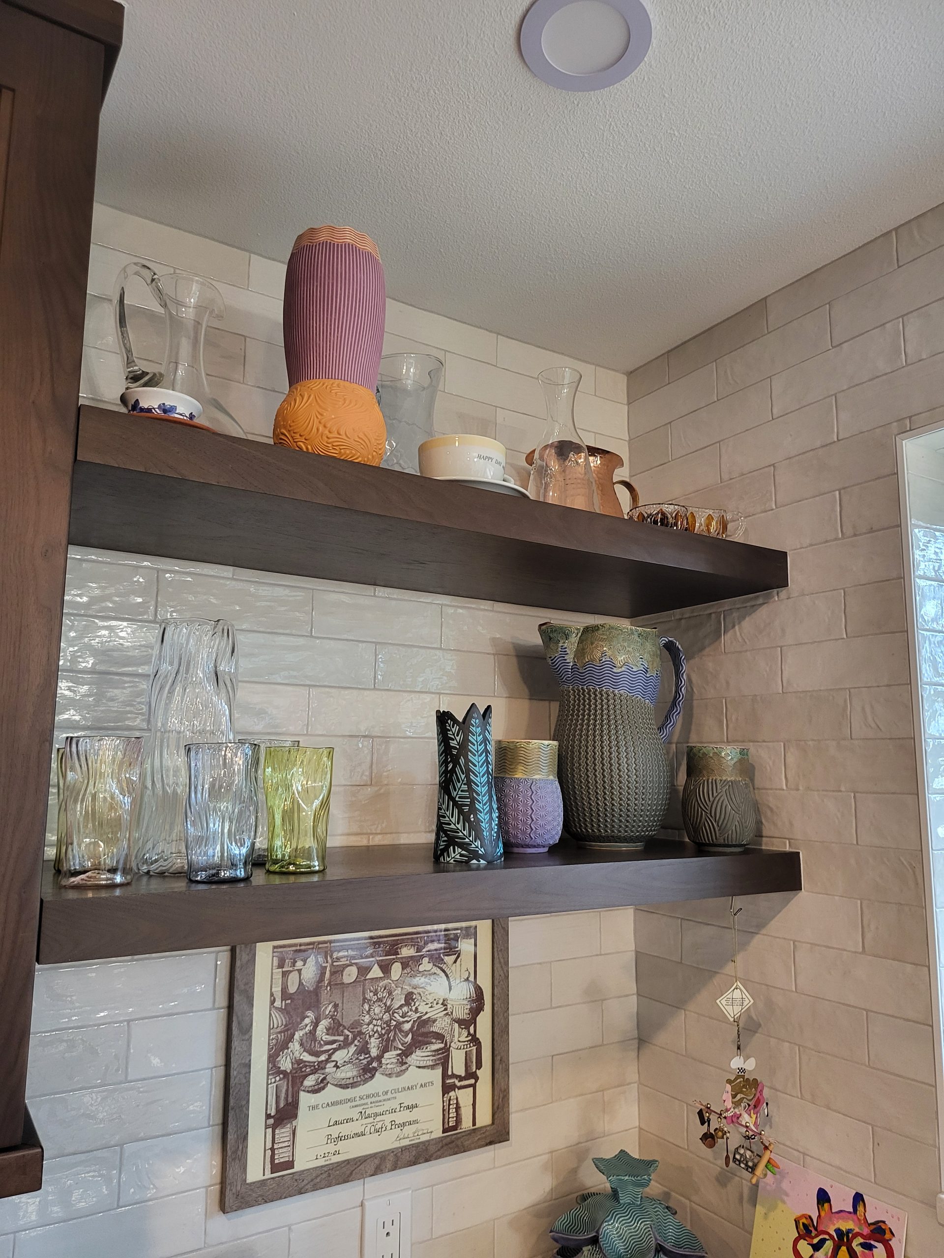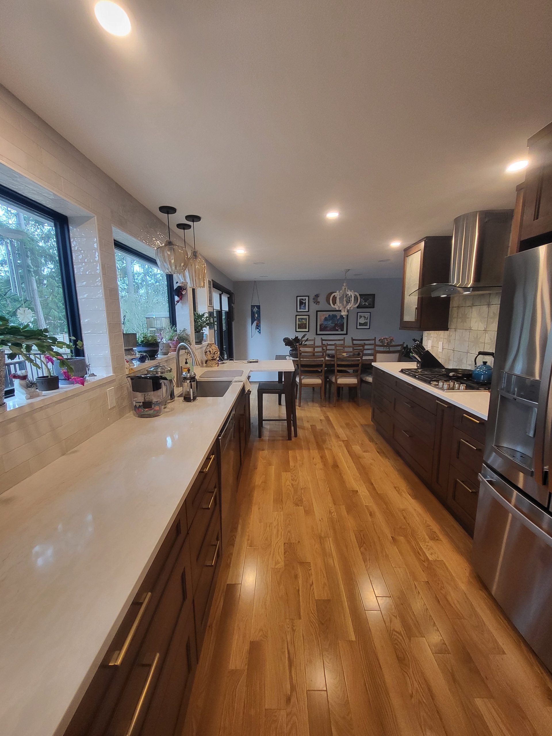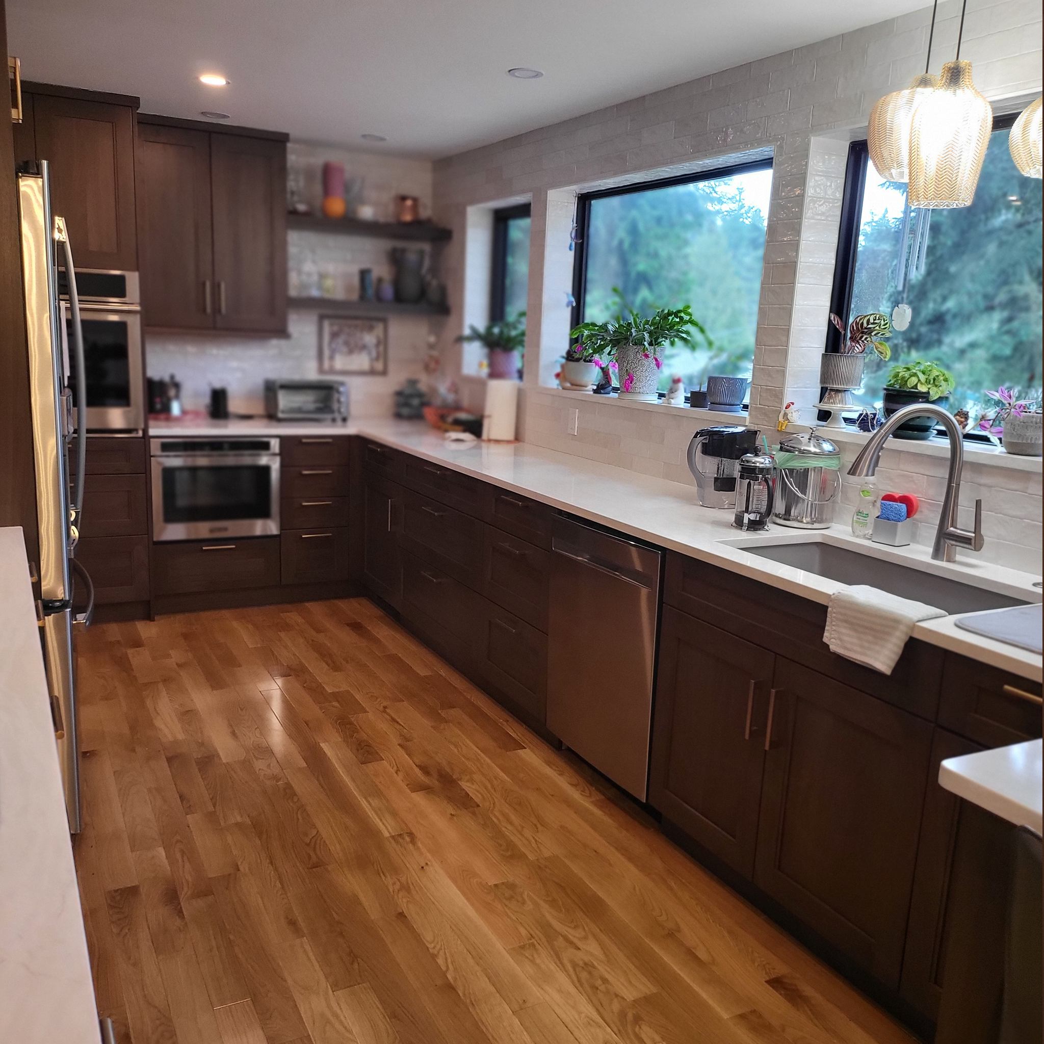 A long stretch of counter space runs beneath oversized windows, flooding the room with natural light and showcasing views of the surrounding greenery. Floating shelves add personality and display space without sacrificing the clean, streamlined aesthetic. The warm wood flooring ties the space together, enhancing the kitchen’s natural, organic feel.