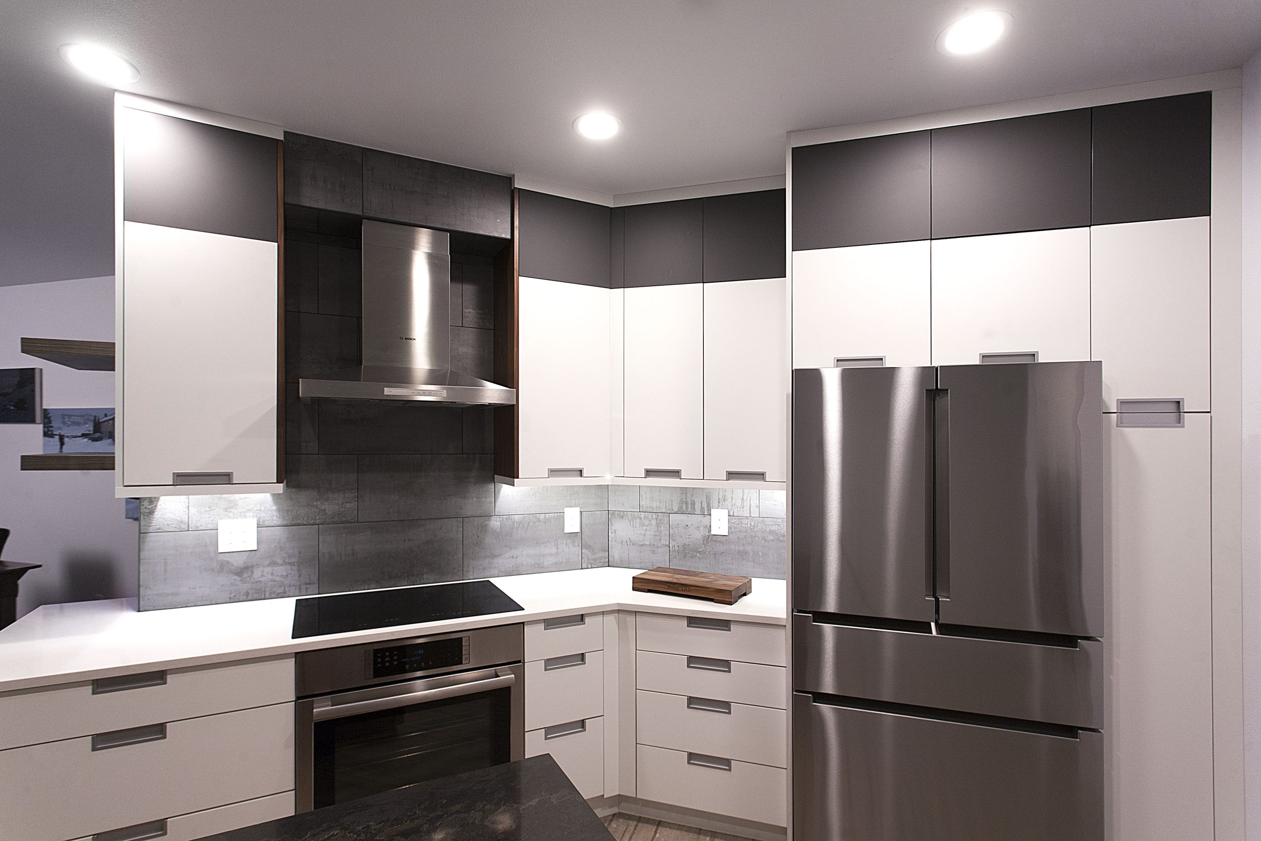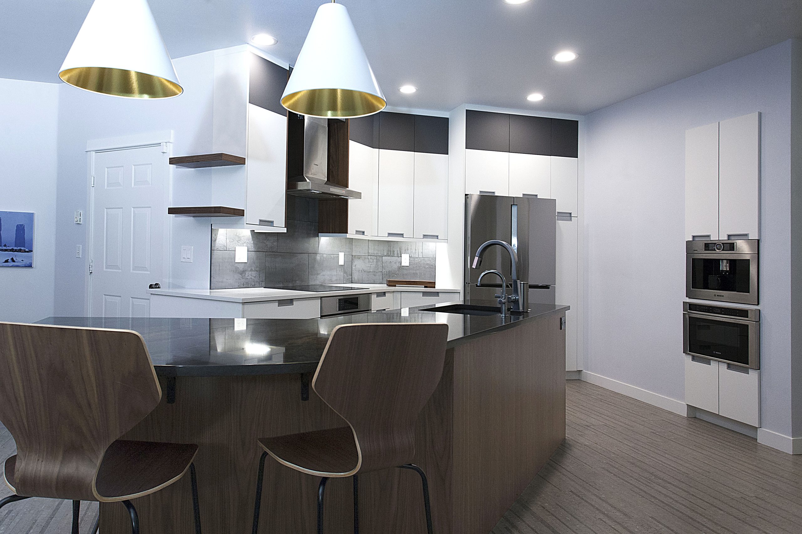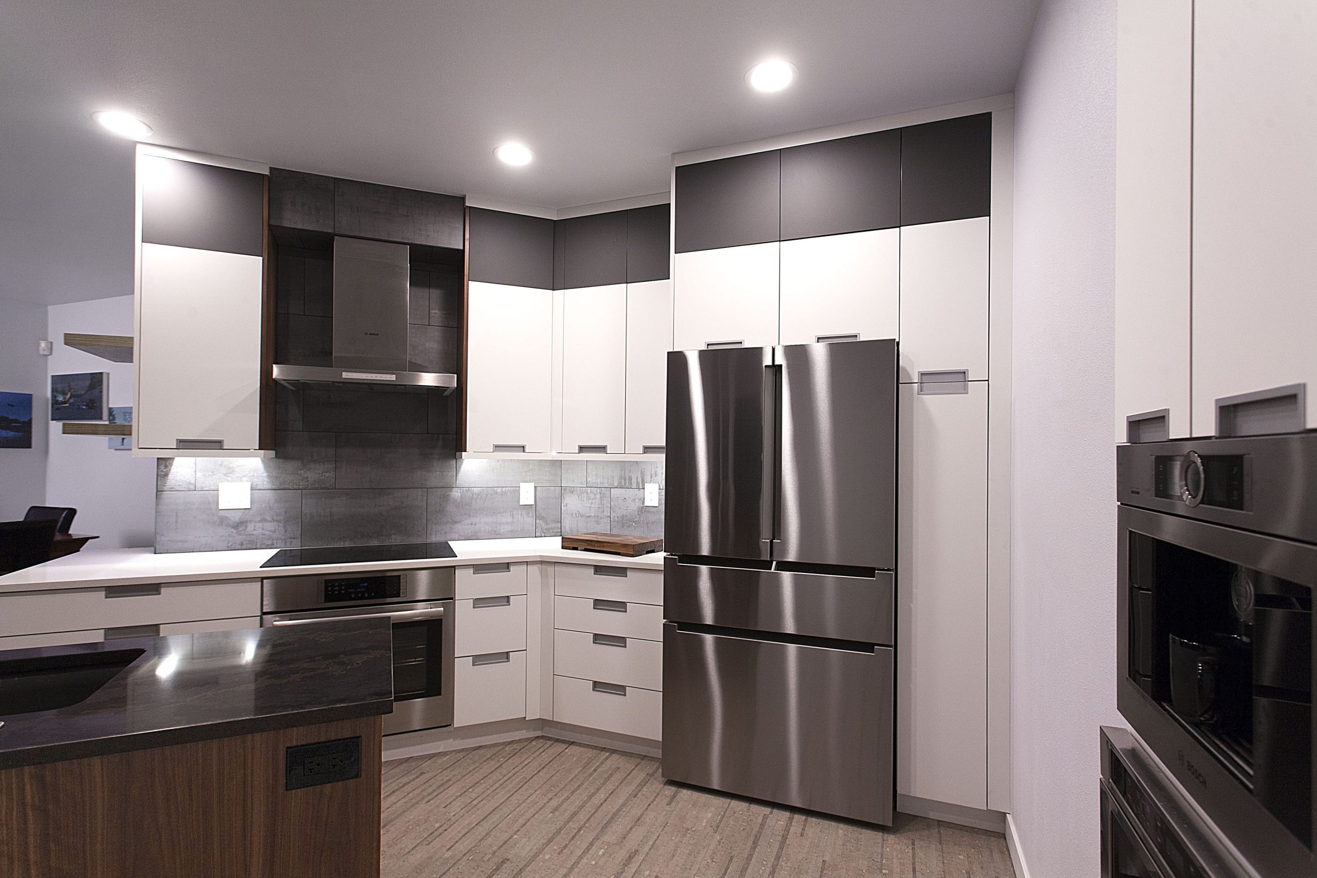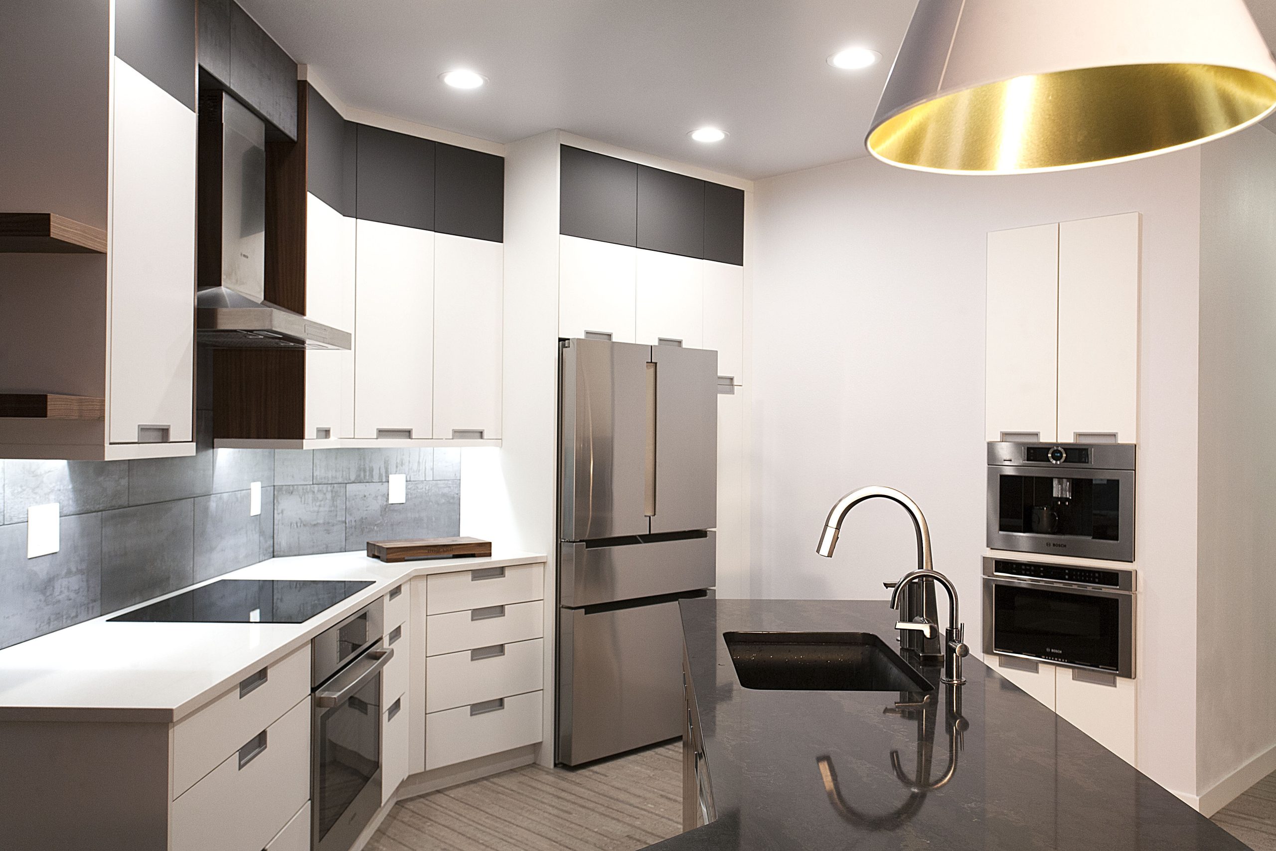 This stunning kitchen showcases a sleek, contemporary design with a sophisticated contrast of light and dark tones. The space features Sollera Fine Cabinets in the Dover door style, finished in a combination of Polaris White and Polaris Graphite. The crisp white perimeters create an airy, modern feel, while the rich graphite accents add depth and visual balance. The result is a beautifully coordinated kitchen that blends clean lines, refined finishes, and expert craftsmanship for a truly elevated space.