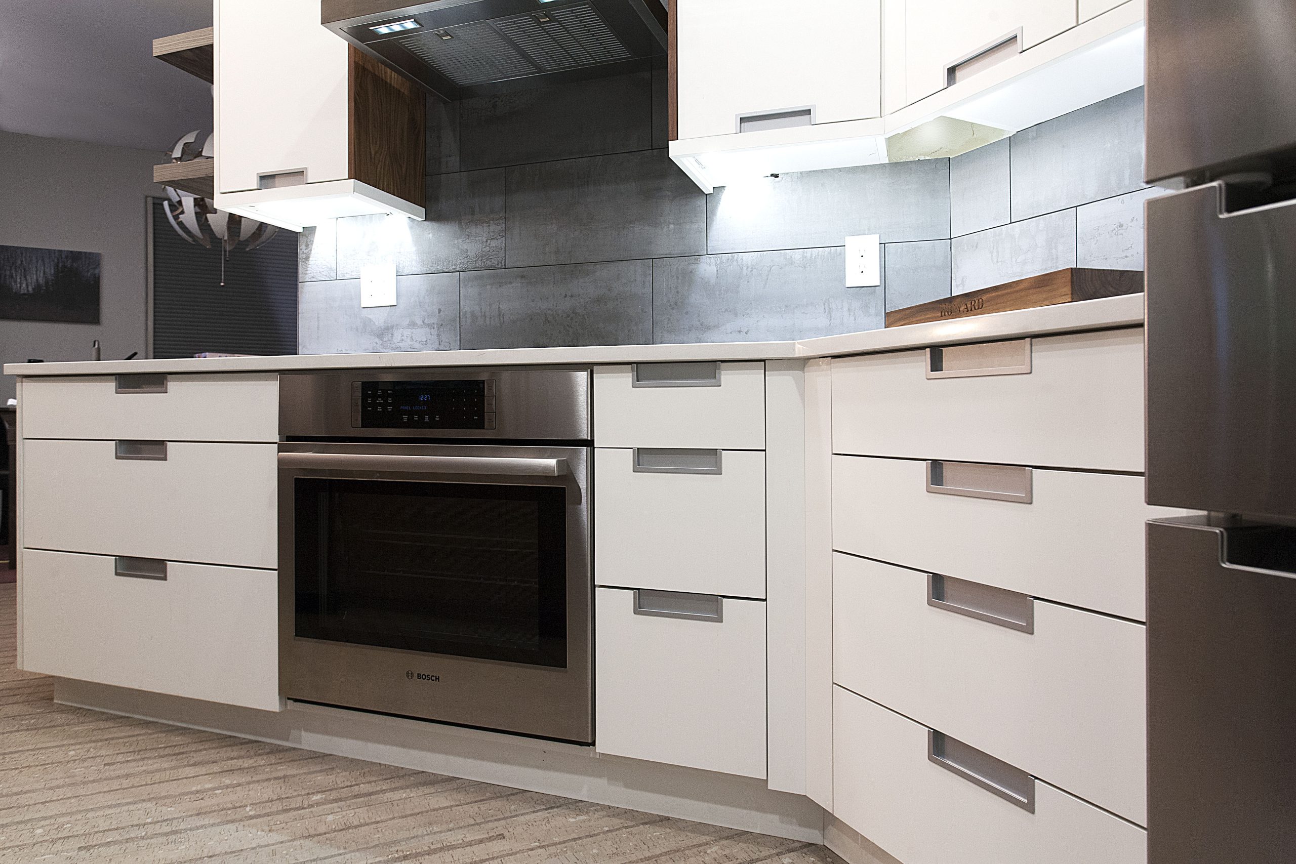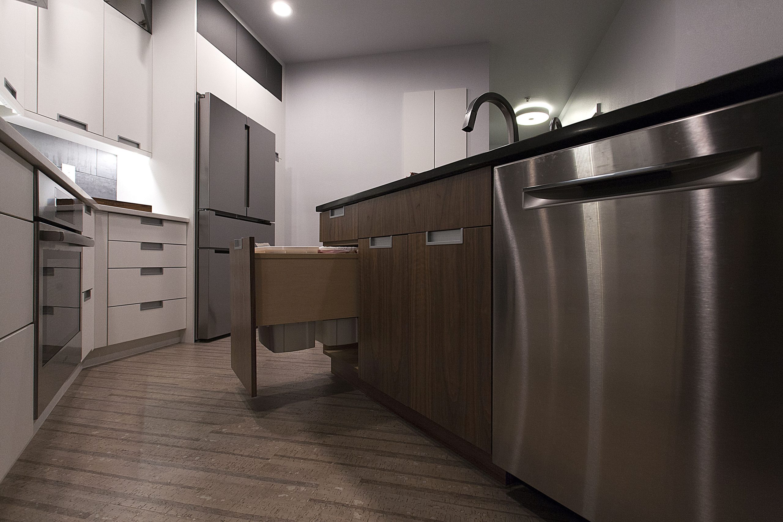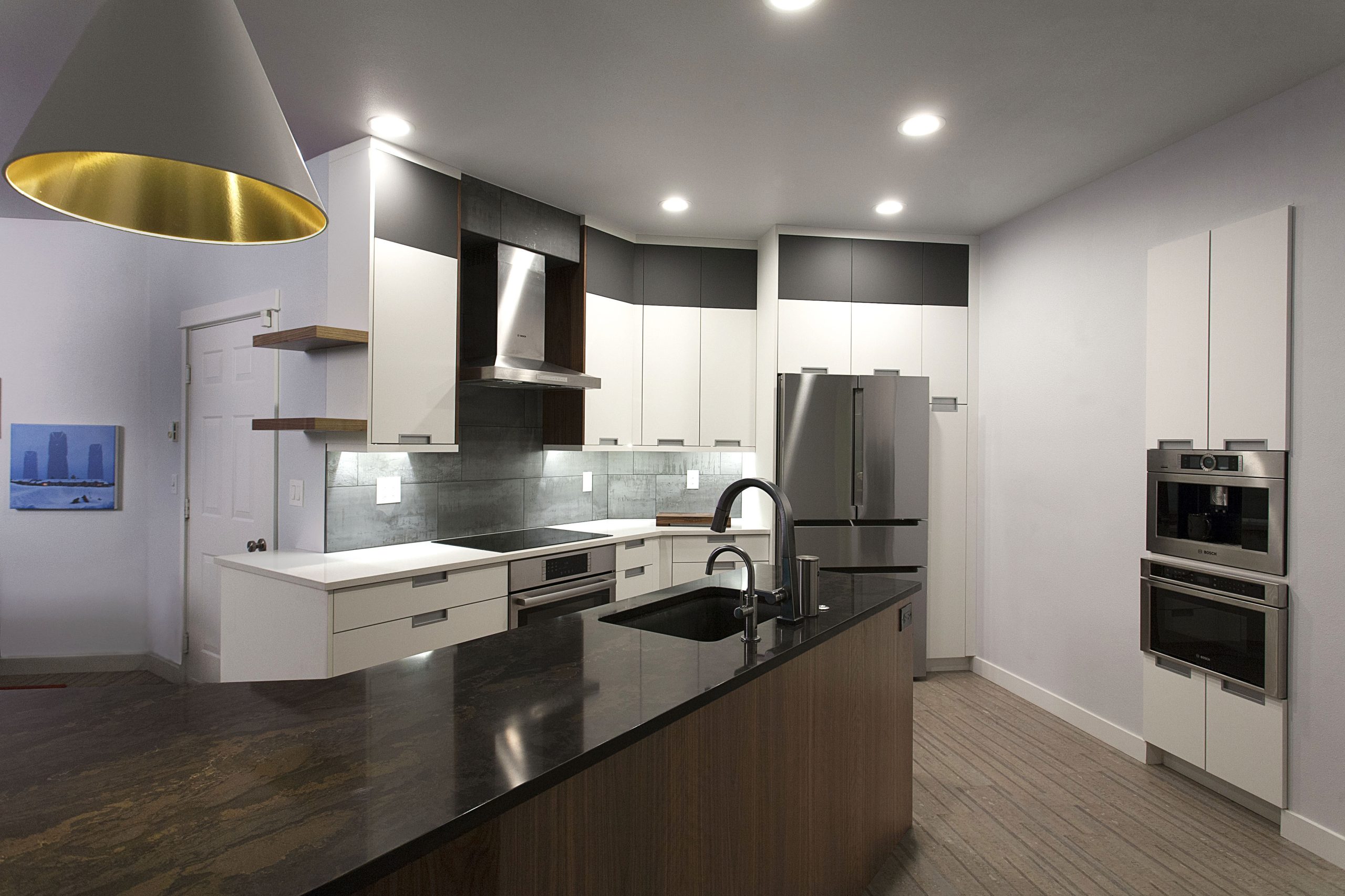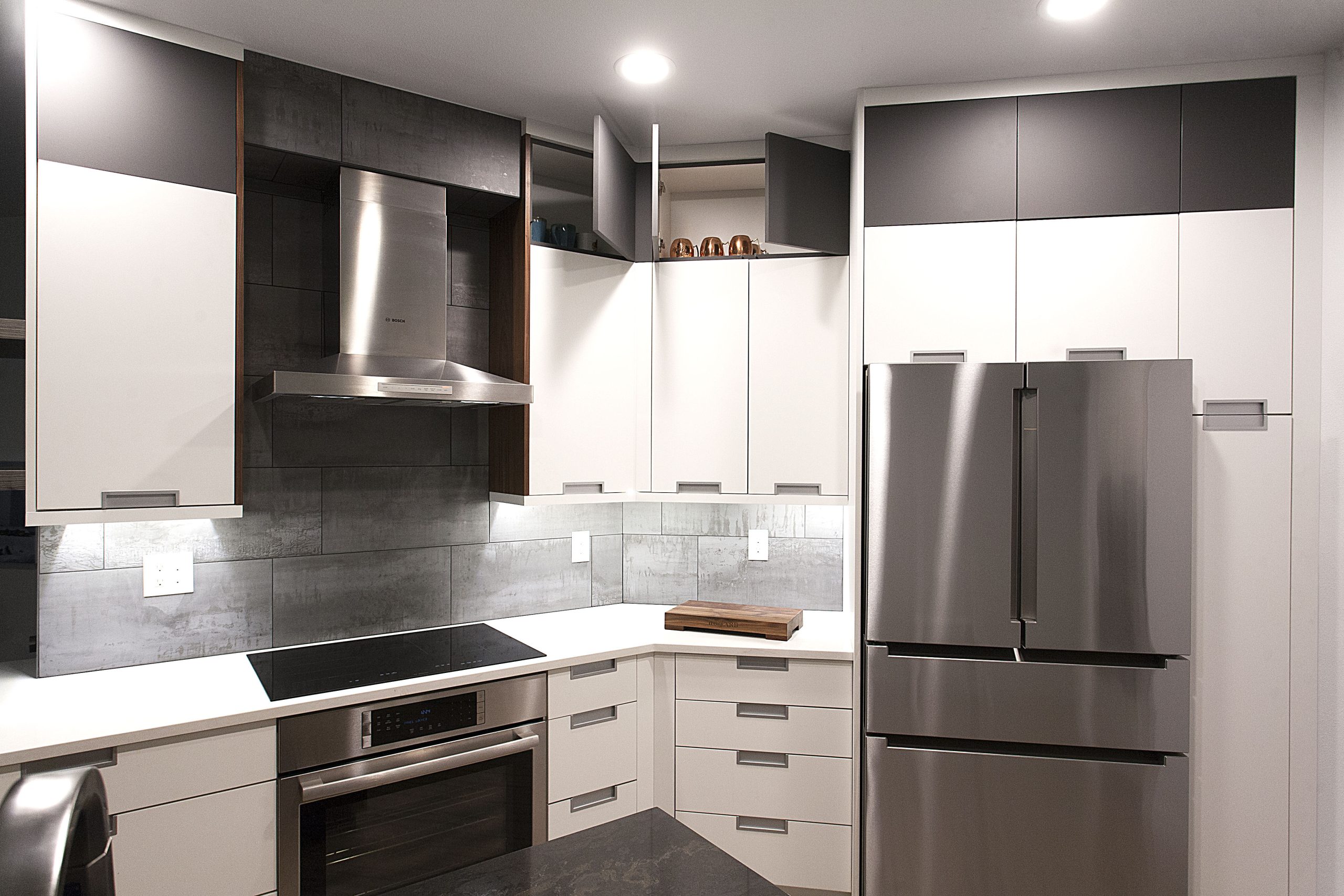 This stunning kitchen showcases a sleek, contemporary design with a sophisticated contrast of light and dark tones. The space features Sollera Fine Cabinets in the Dover door style, finished in a combination of Polaris White and Polaris Graphite. The crisp white perimeters create an airy, modern feel, while the rich graphite accents add depth and visual balance. The result is a beautifully coordinated kitchen that blends clean lines, refined finishes, and expert craftsmanship for a truly elevated space.