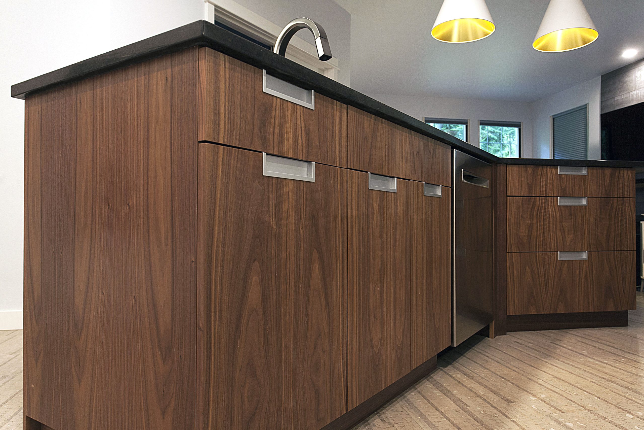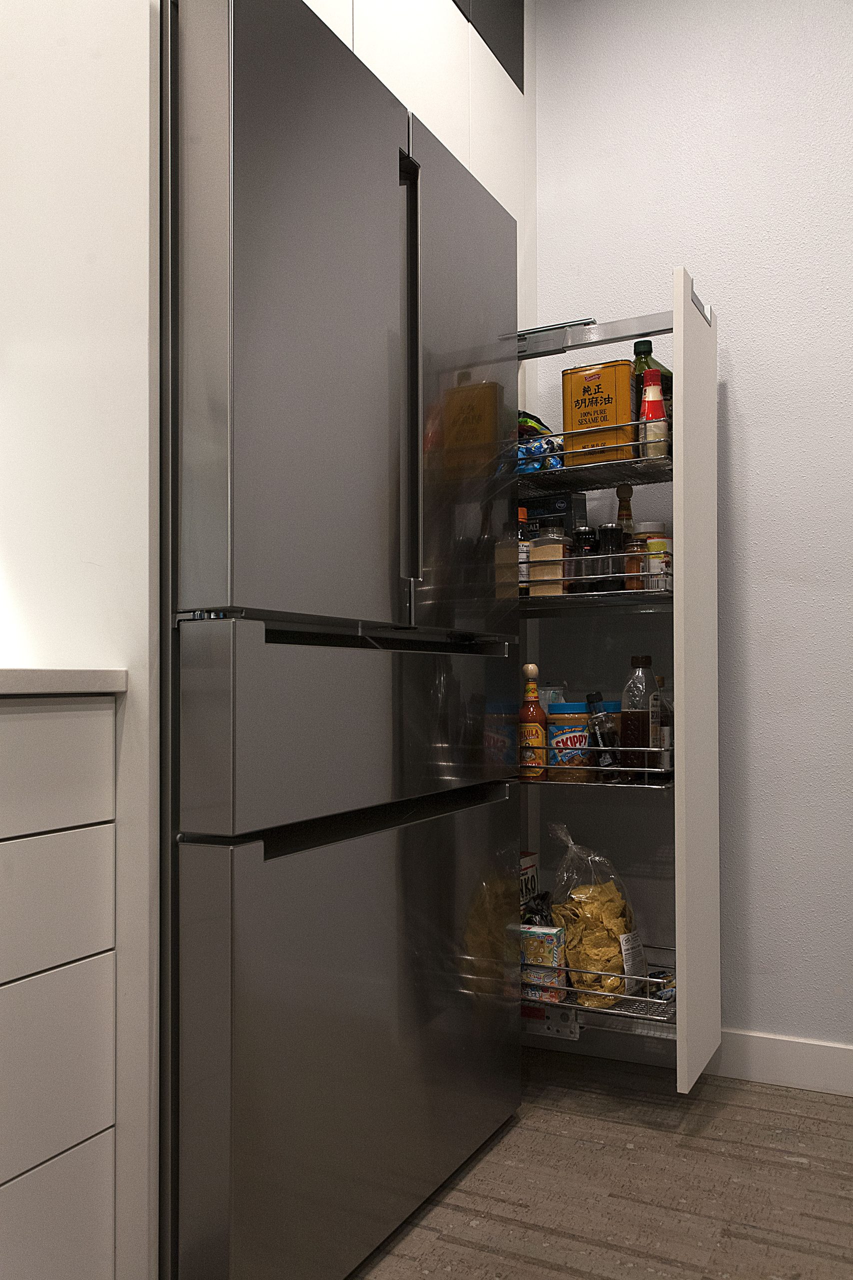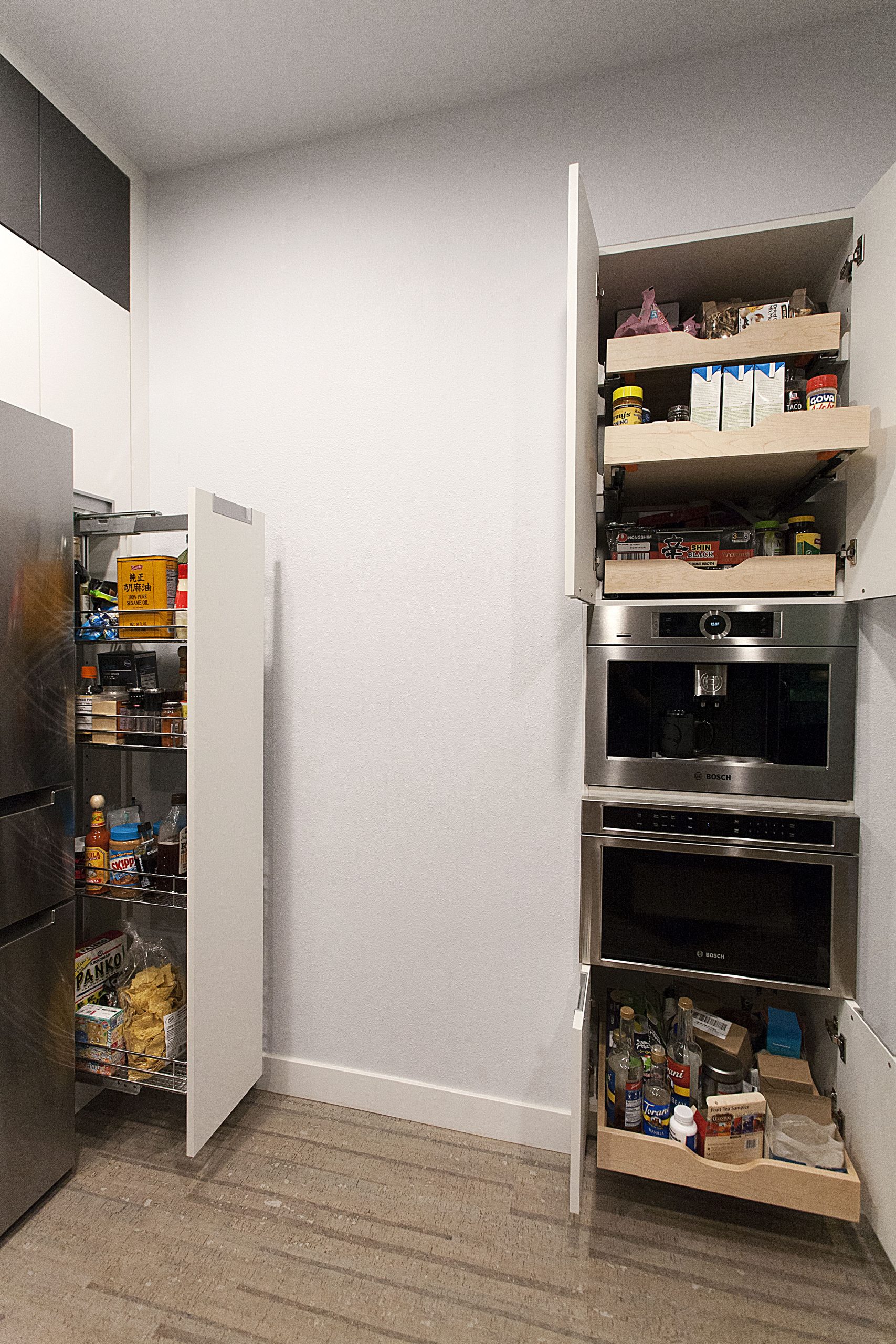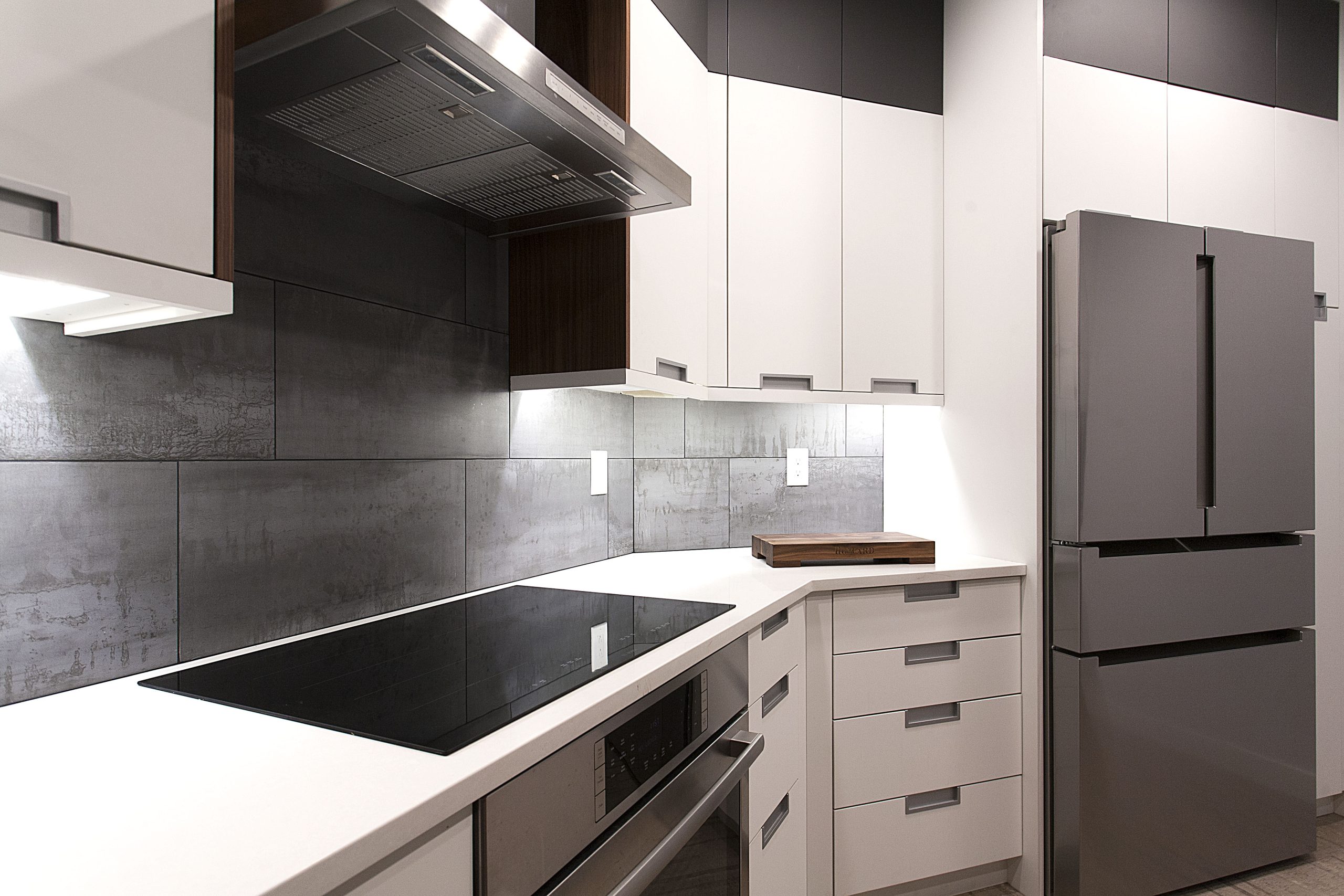 This stunning kitchen showcases a sleek, contemporary design with a sophisticated contrast of light and dark tones. The space features Sollera Fine Cabinets in the Dover door style, finished in a combination of Polaris White and Polaris Graphite. The crisp white perimeters create an airy, modern feel, while the rich graphite accents add depth and visual balance. The result is a beautifully coordinated kitchen that blends clean lines, refined finishes, and expert craftsmanship for a truly elevated space.