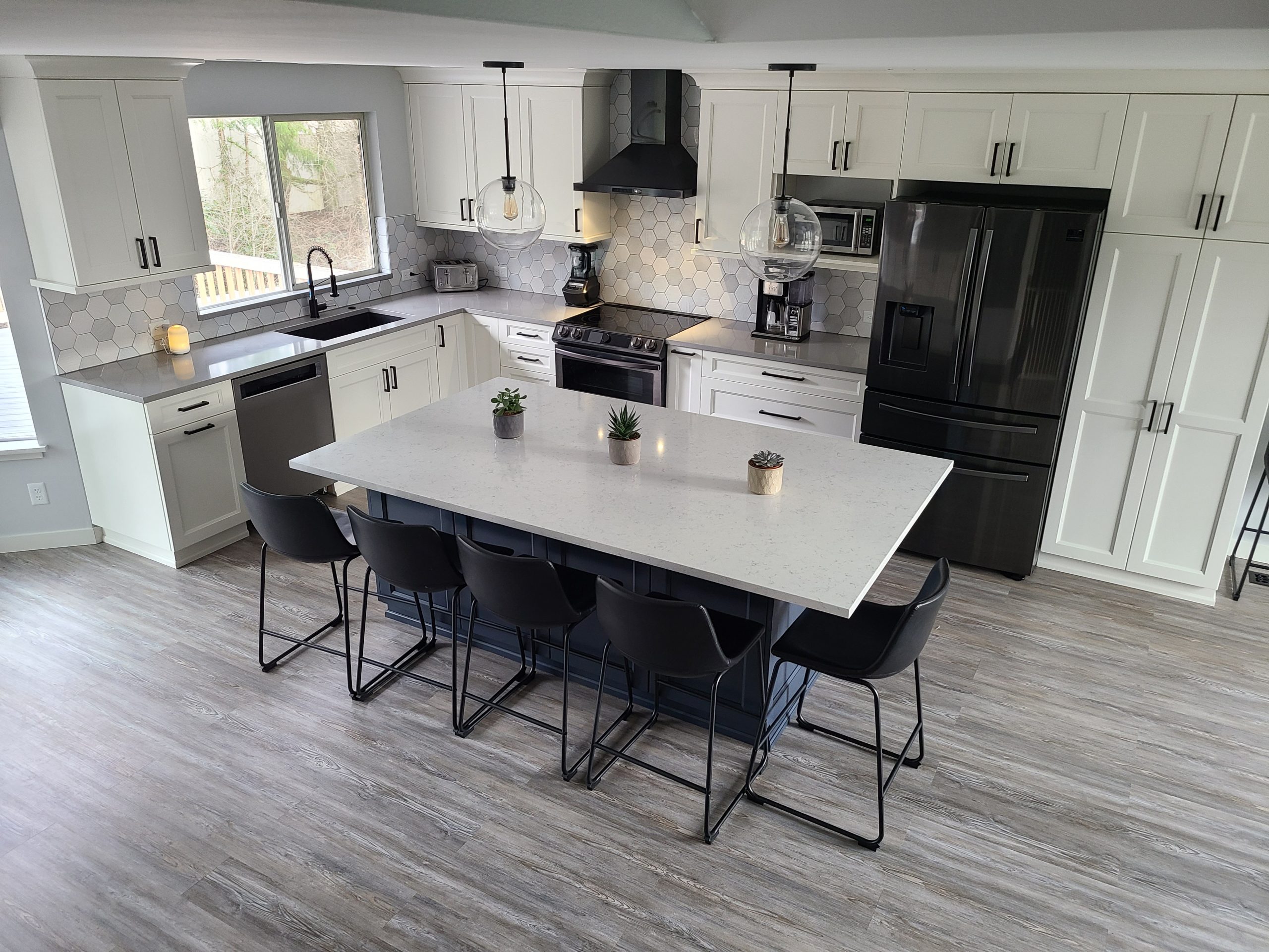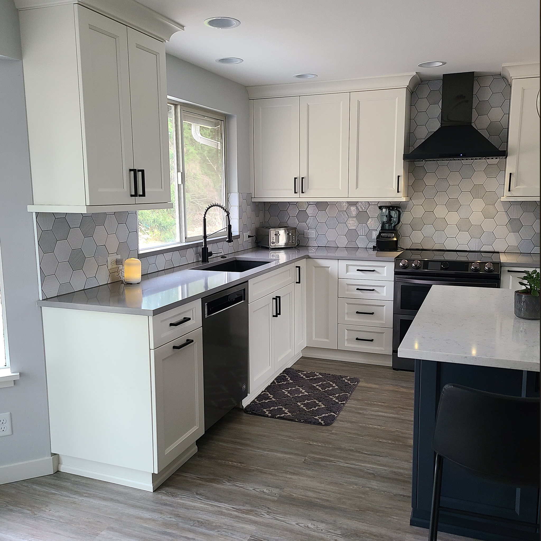 This beautifully renovated kitchen showcases the timeless craftsmanship of Sollera’s Mission door style, blending clean lines with a versatile, modern aesthetic. The perimeter cabinets in Cloud White create a bright, airy foundation, enhancing the natural light and making the space feel open and inviting. In contrast, the Hale Navy island serves as a dramatic centerpiece, adding depth and sophistication while offering generous seating and storage.