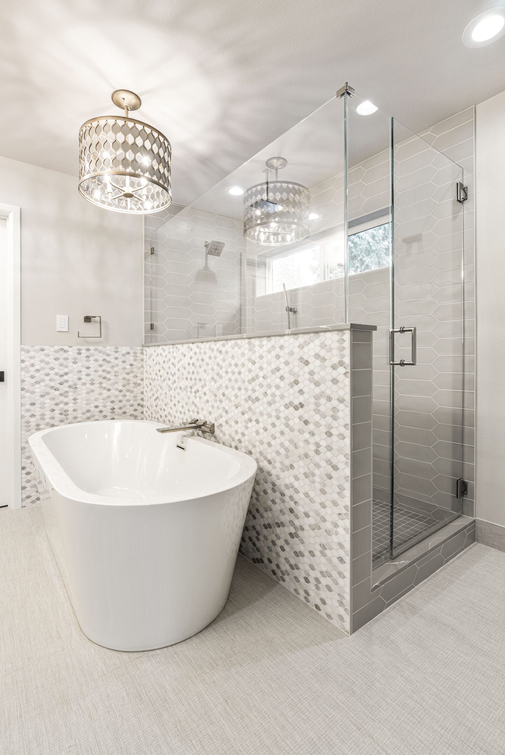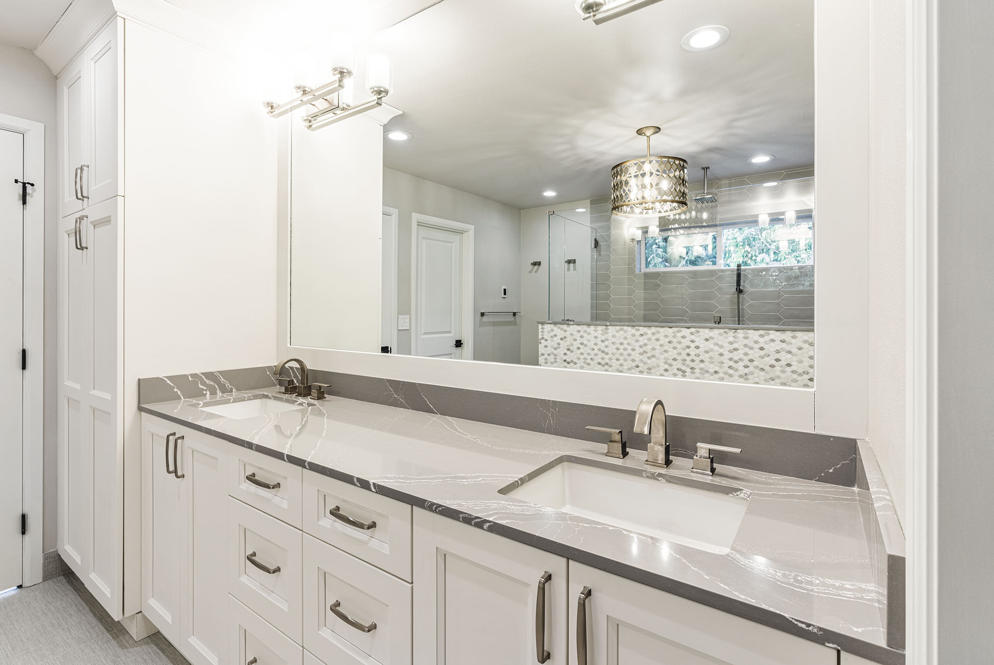 This beautifully remodeled bathroom features elegant, shaker-style cabinetry that brings a sense of calm, sophistication, and timeless design to the space. Finished in a soft, clean white, the cabinetry brightens the room and provides a refined contrast to the warm gray countertops and intricate tilework throughout the bath.