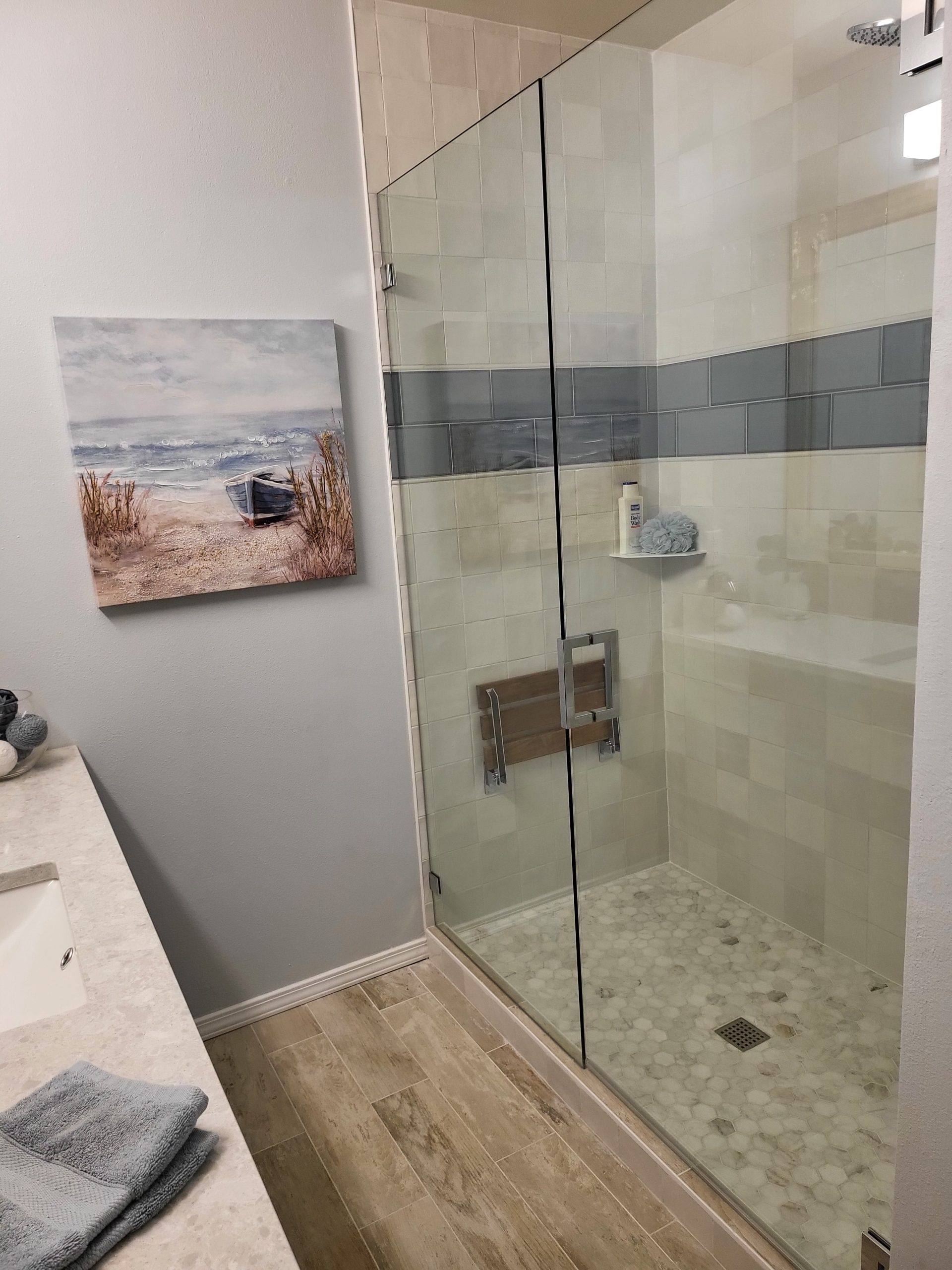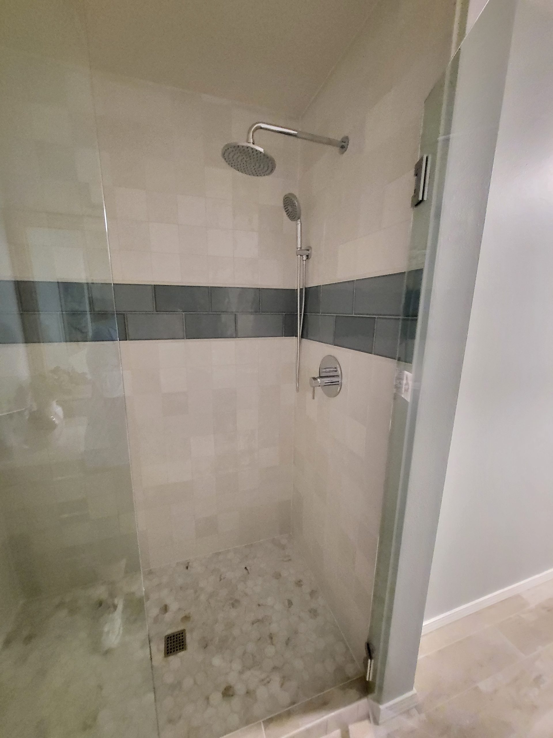 The walk-in shower showcases a soothing mix of textures: soft, glossy wall tiles paired with a bold horizontal accent band in ocean-inspired blue tones. The pebble-stone shower floor brings a natural, spa-like feel underfoot. A rain shower head and handheld fixture complete the luxurious shower experience.
