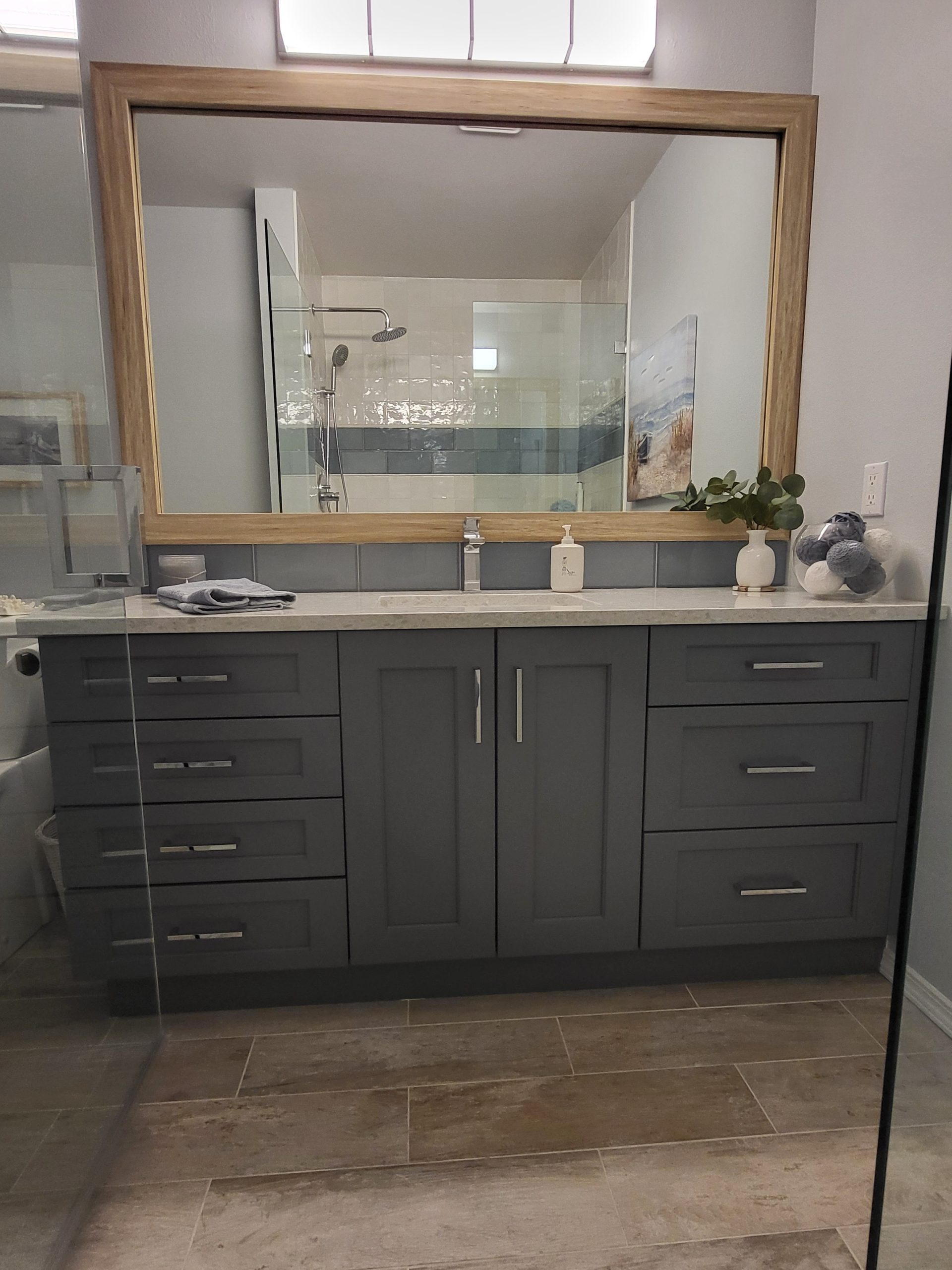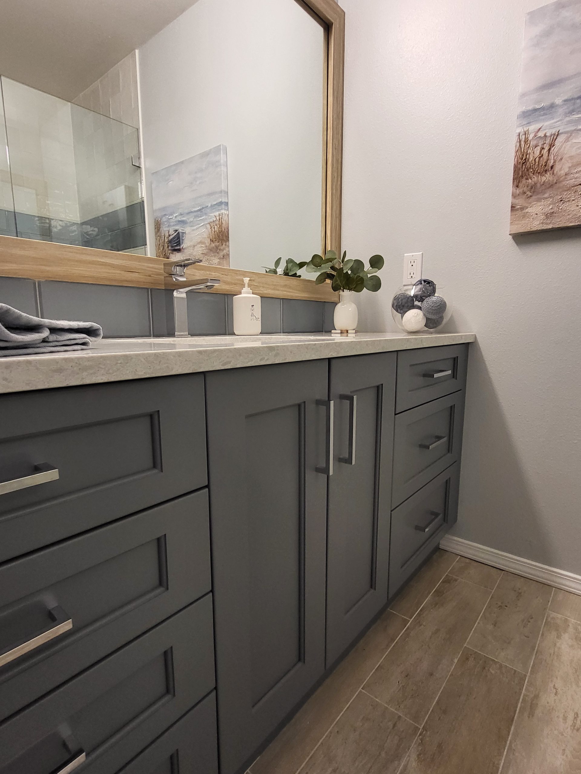This inviting bathroom blends warm, natural textures with a cool, modern palette—creating a space that feels both grounded and refreshingly serene. The custom vanity by Sollera Cabinets features the timeless Mission door style in Maple Whale Gray, a smooth, moody finish that adds depth and sophistication to the room. Its abundant drawer storage and clean, structured lines make the vanity as functional as it is beautiful.