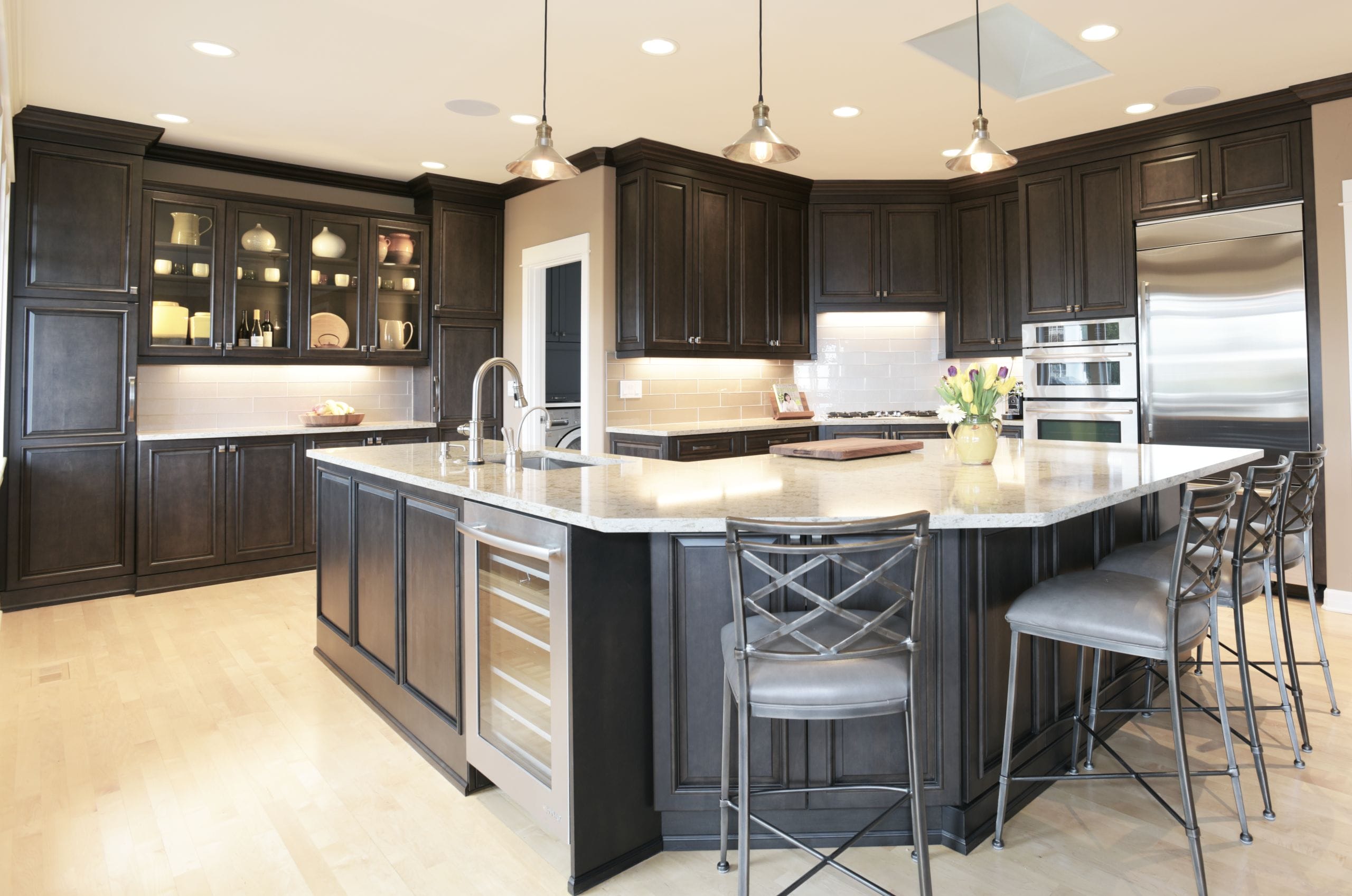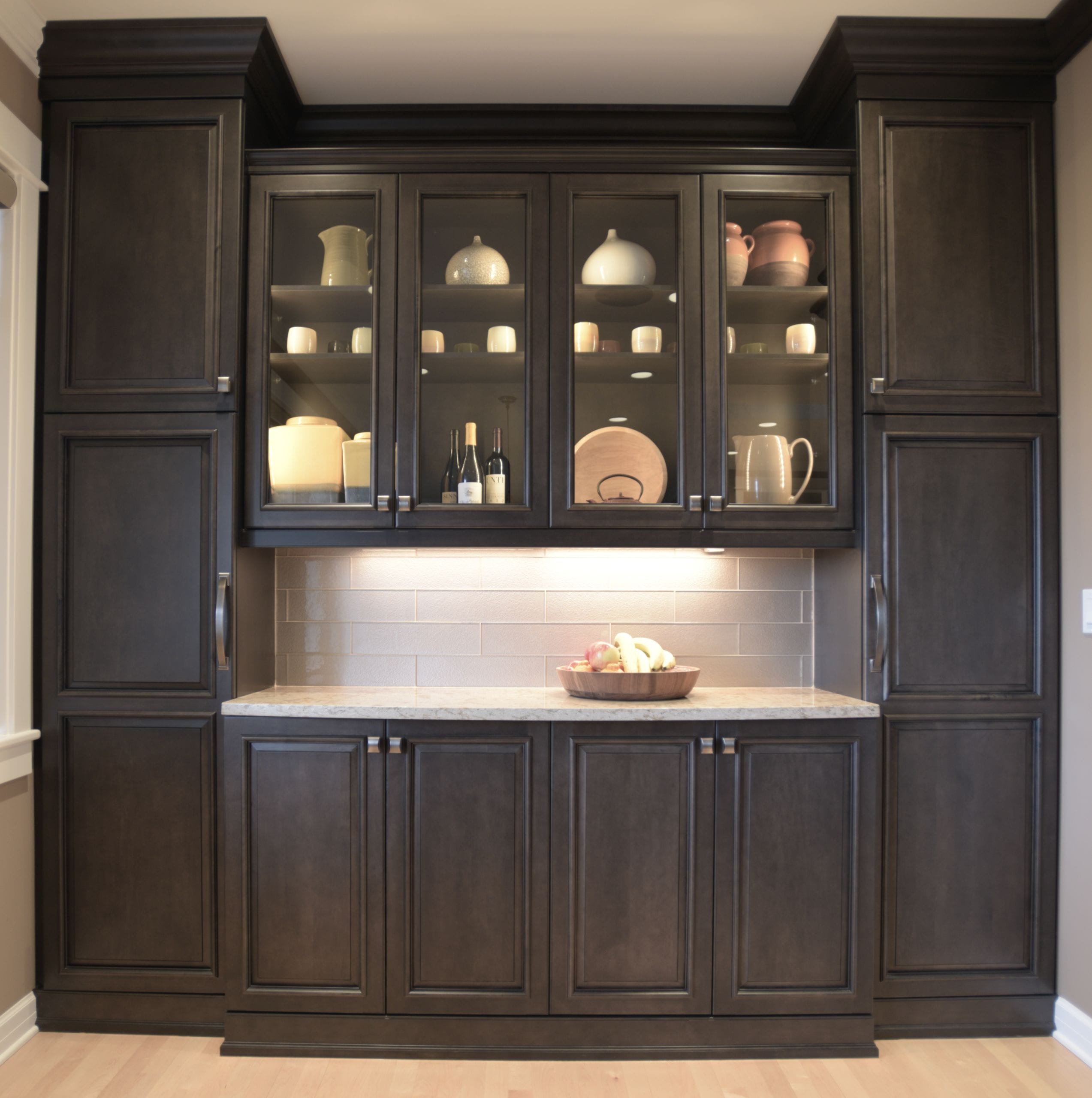 This inviting kitchen features Sollera Fine Cabinetry in the elegant Shaughnessey raised panel door style, crafted from Cherry wood in a deep Shale finish. The dark cabinetry adds warmth and sophistication, beautifully contrasted by the light quartz countertops and soft neutral backsplash. With a spacious center island, premium stainless steel appliances, and glass display cabinets that highlight curated pieces, this kitchen blends traditional charm with modern functionality. Perfect for entertaining or everyday living, it offers timeless design and exceptional craftsmanship in every detail.