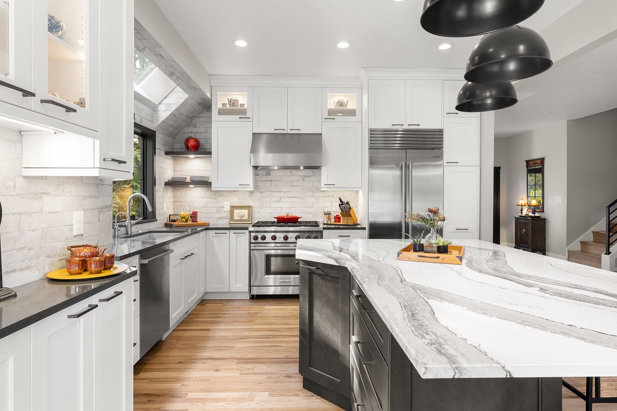 The kitchen is the true heart of this home — bright, open, and full of charm. Sollera Fine Cabinetry in classic white pairs with a rich espresso island for a timeless two-tone effect. The quartz countertops and waterfall island edge add sophistication, while a vaulted ceiling and skylight bathe the space in natural light.