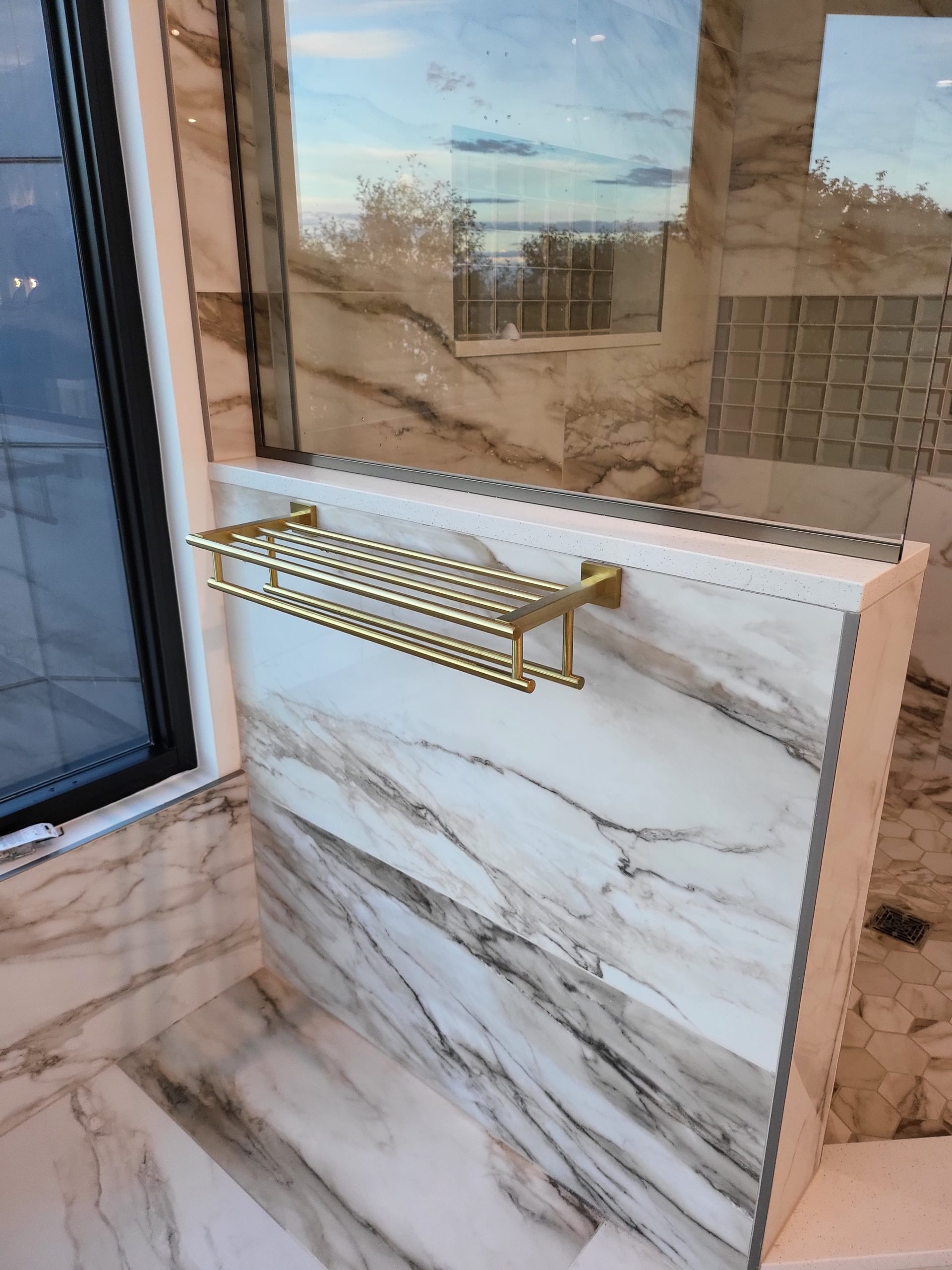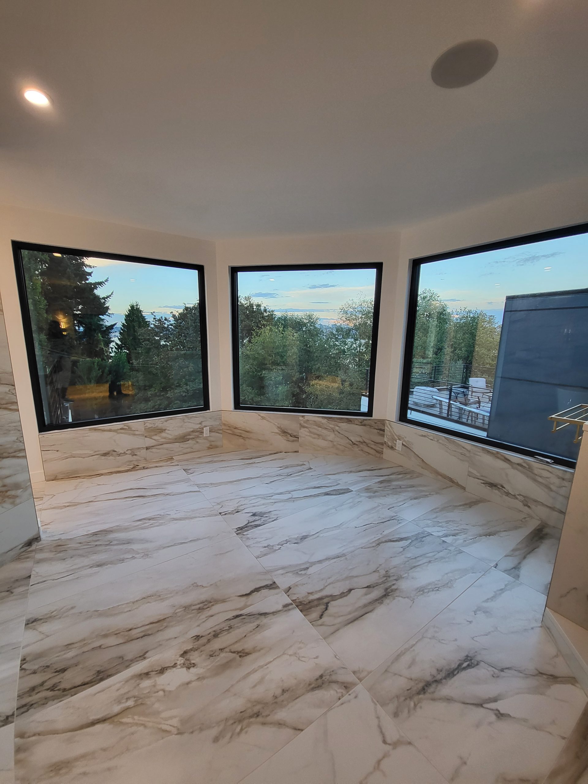 The primary bathroom is a showpiece of modern indulgence. Expansive porcelain marble-look slabs wrap the floors and walls in flowing veining, while custom Sollera cabinetry in soft gray adds depth and balance.