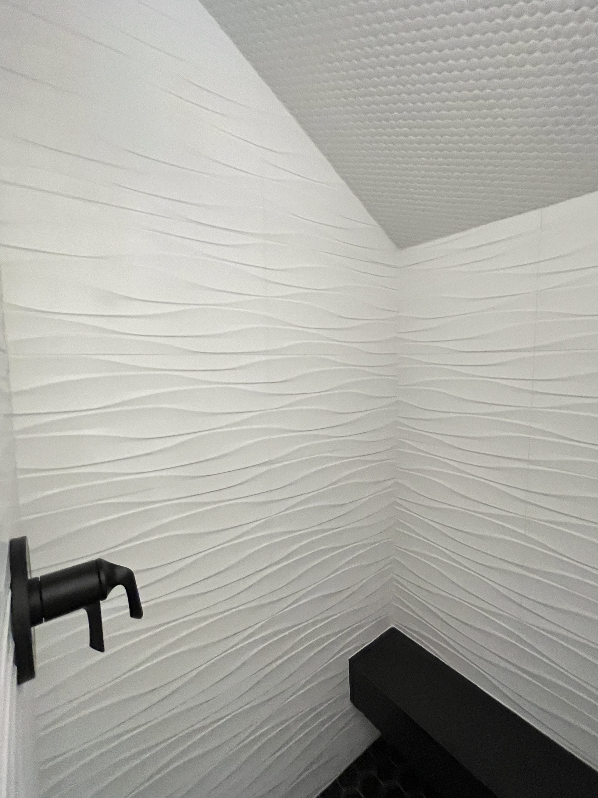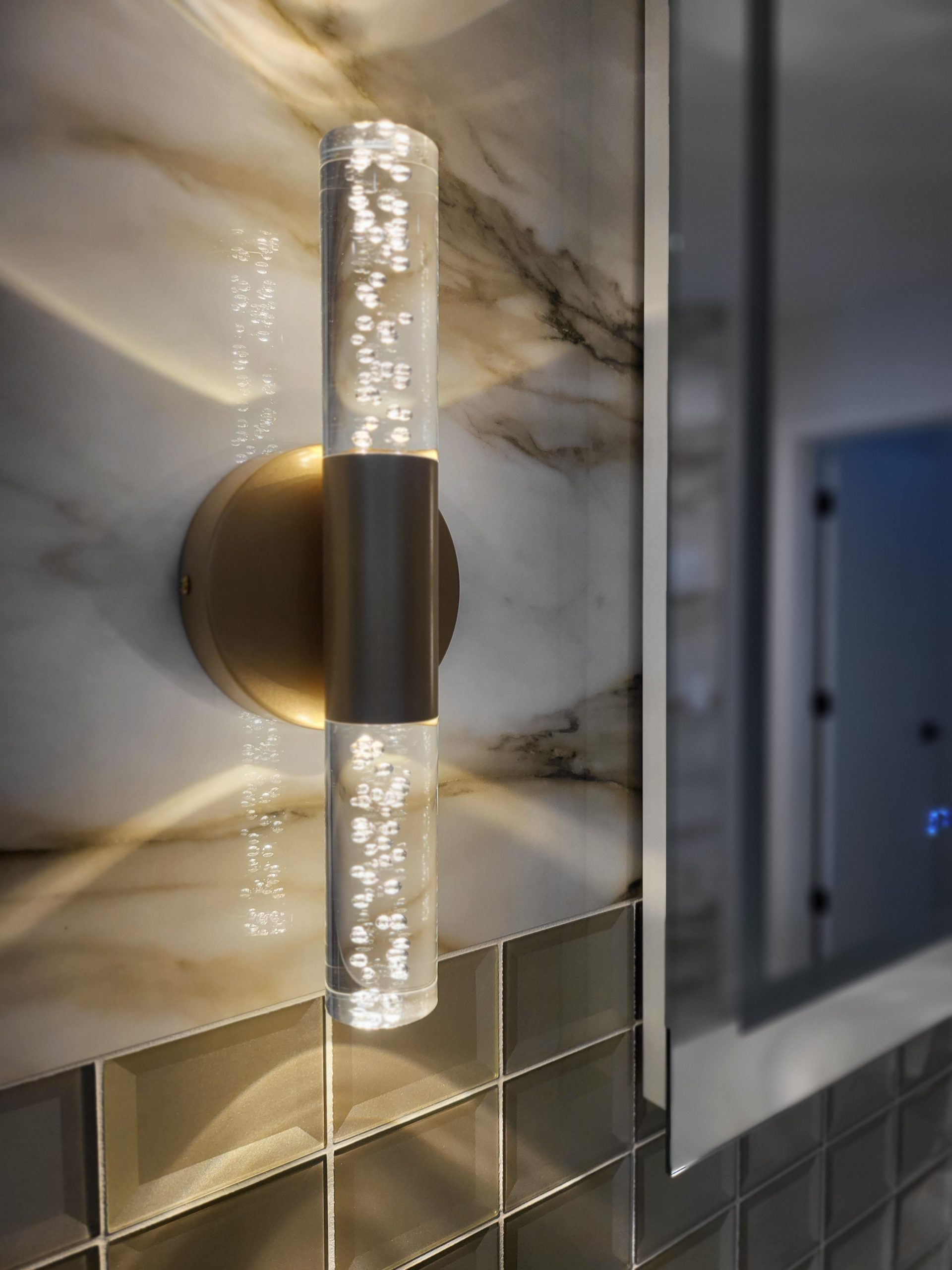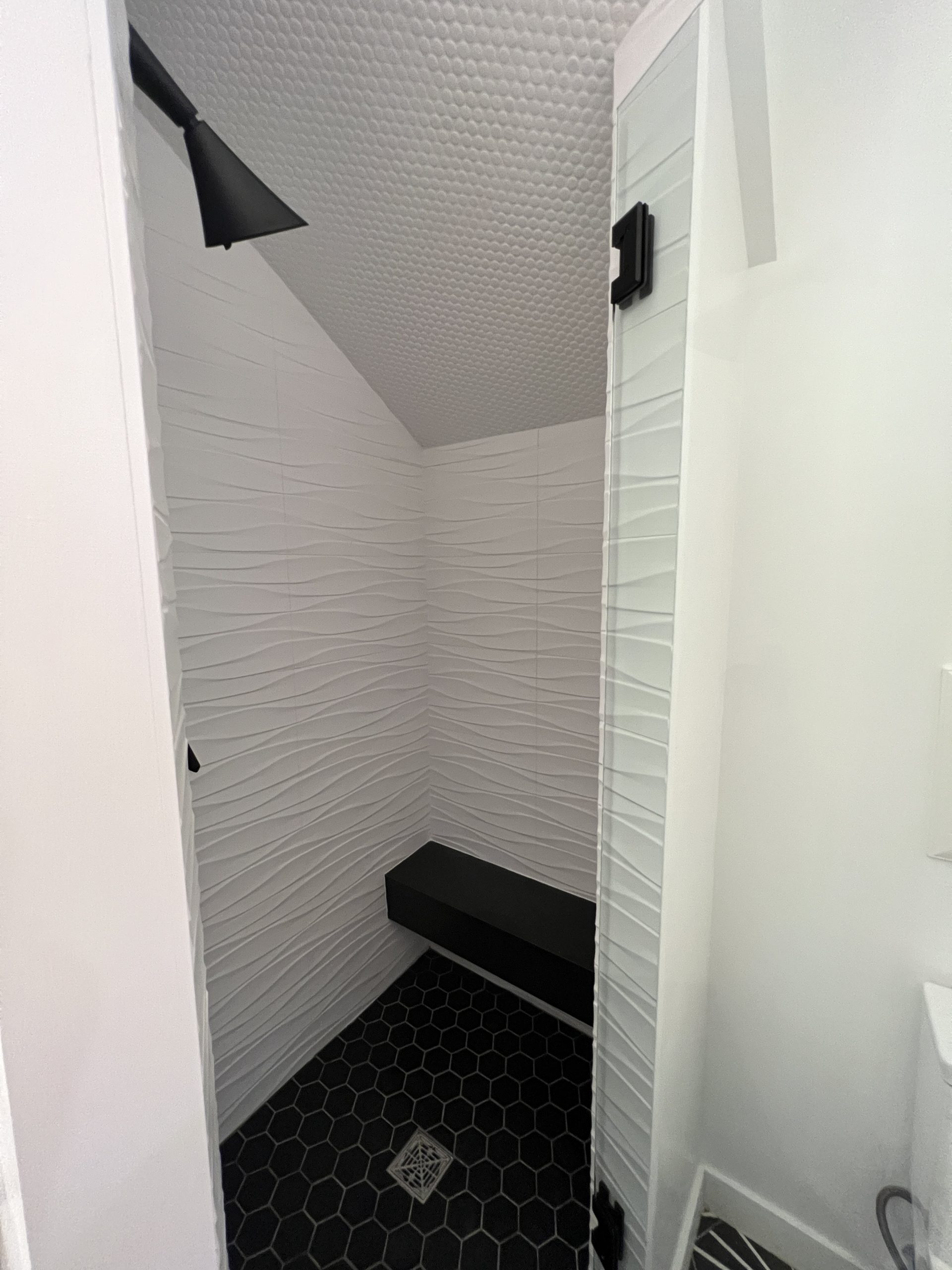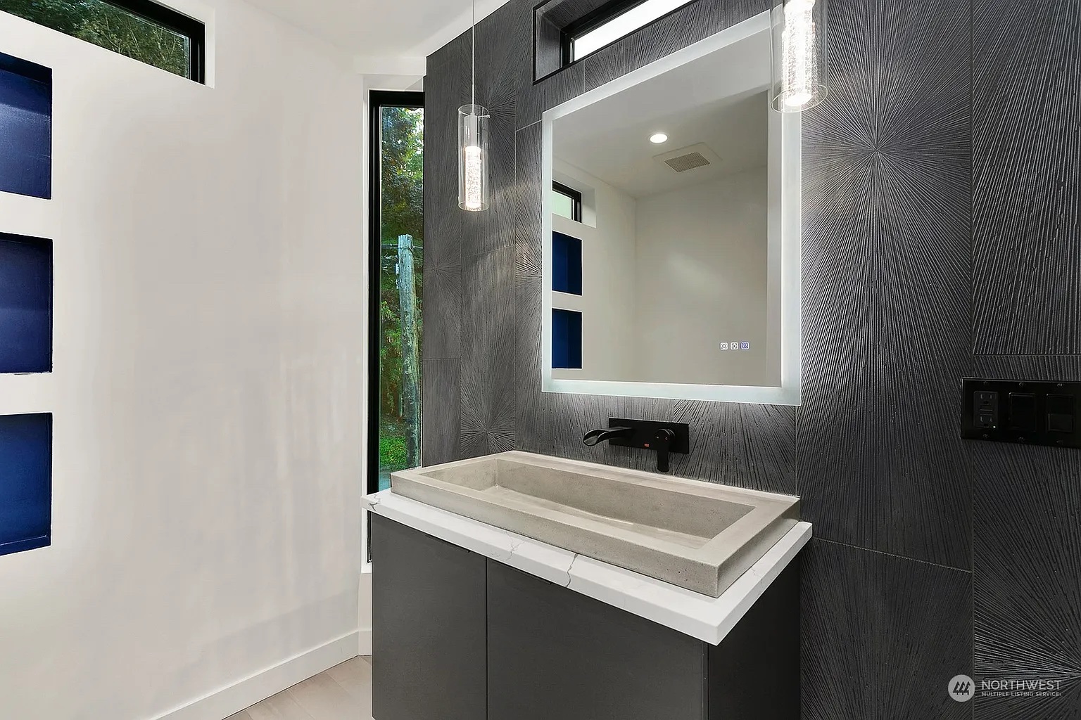 The powder bath features bold wall textures, a floating vanity, and custom lighting that creates a striking interplay of light and shadow.