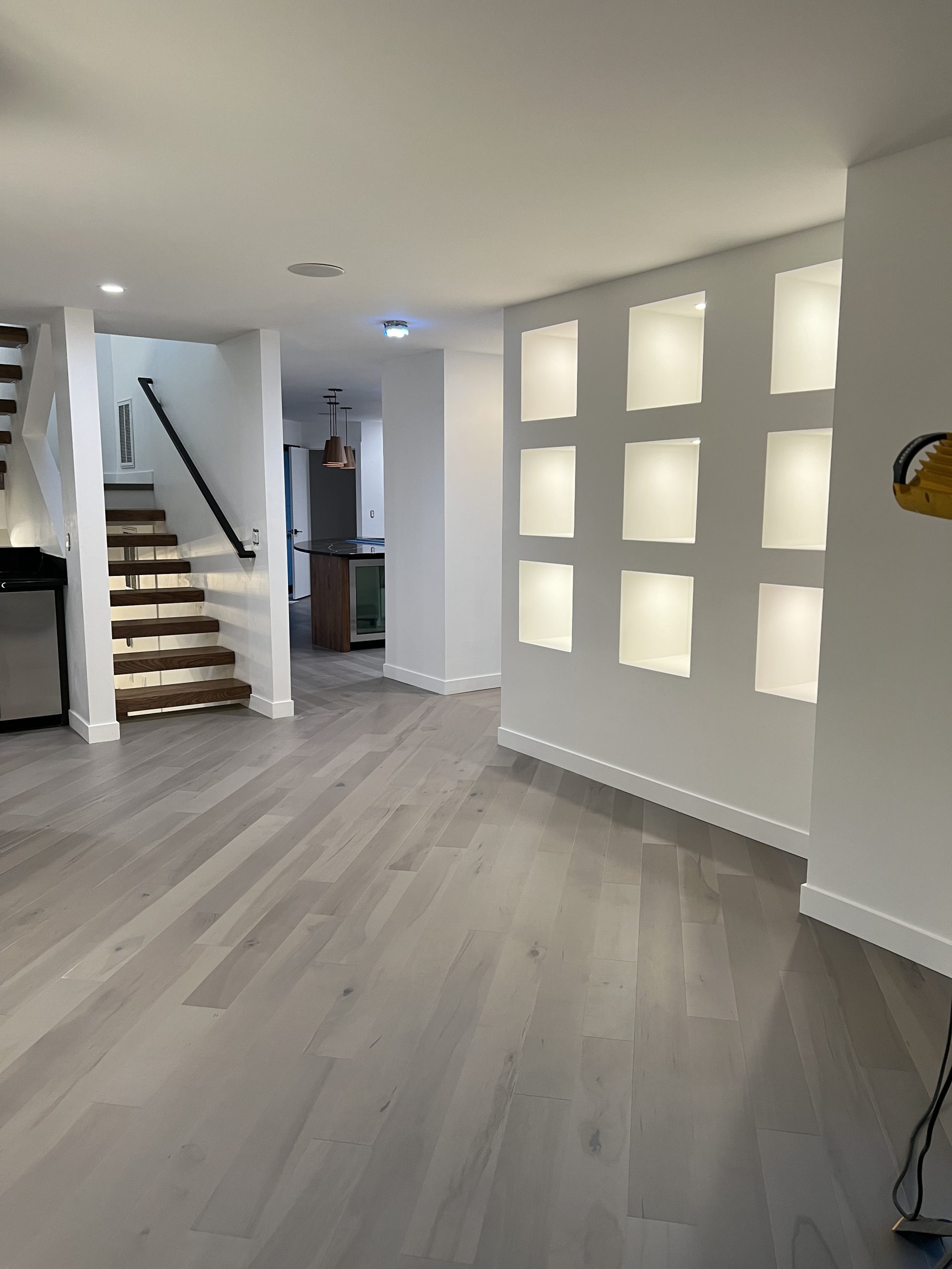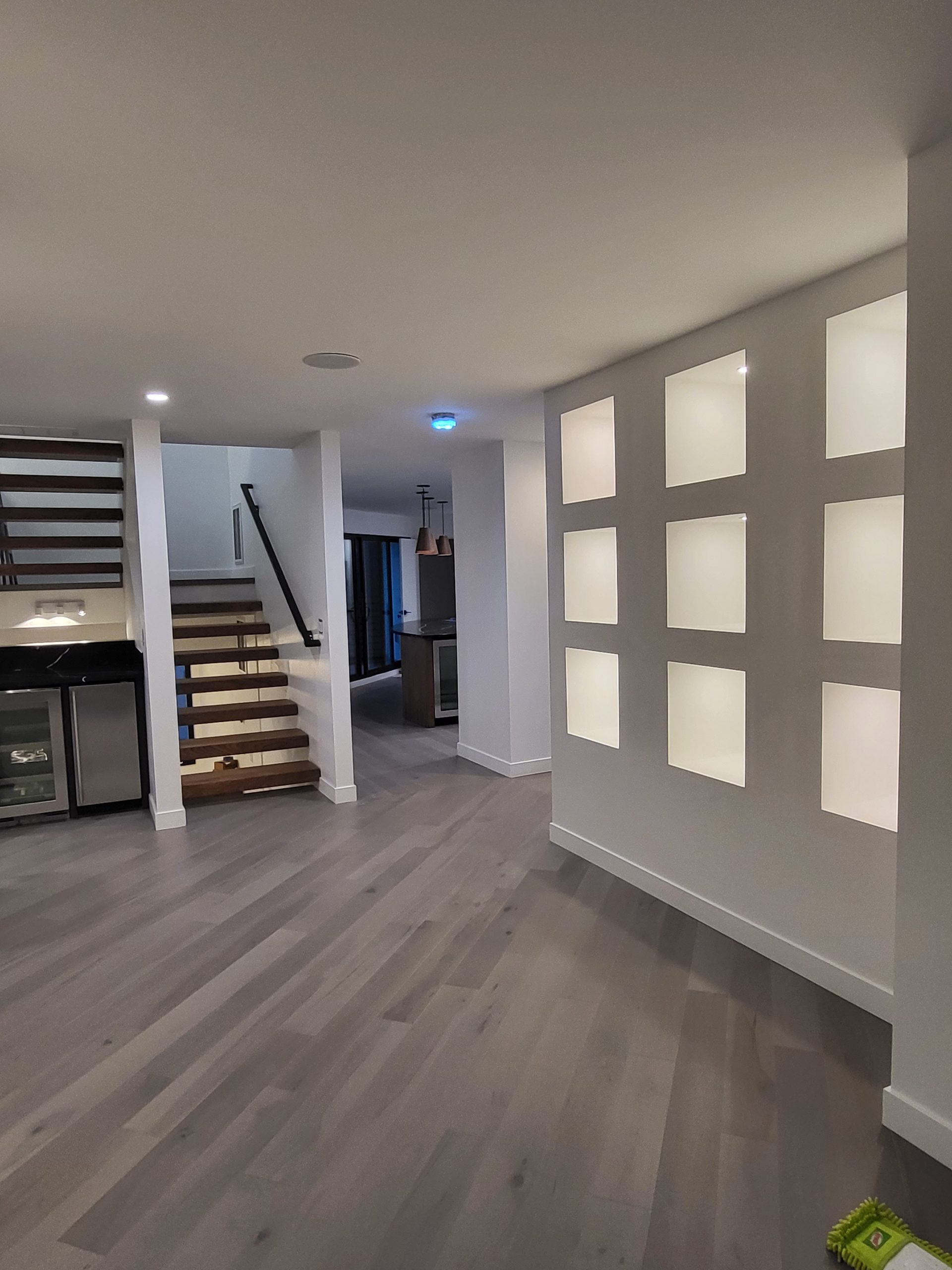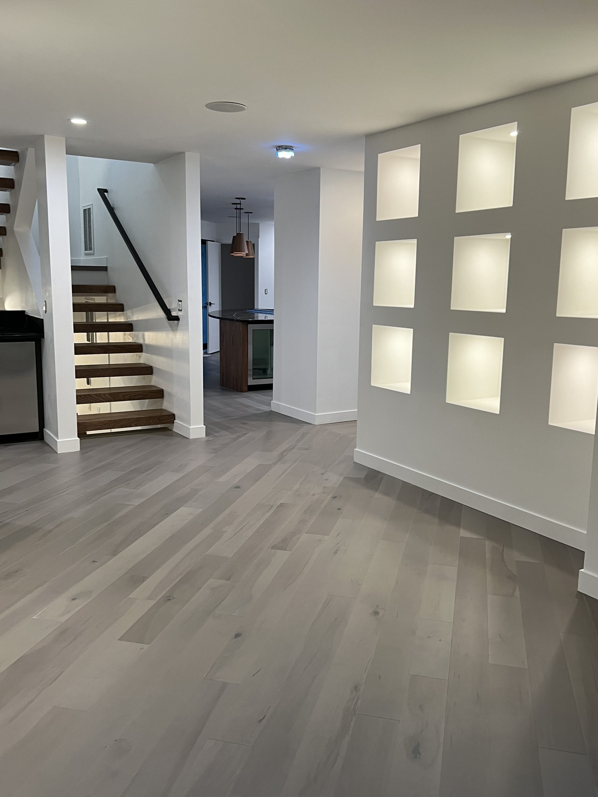 Throughout the home, cohesive design choices create visual flow — from the sculptural staircase and built-in illuminated display niches to the open-concept layout filled with natural light.