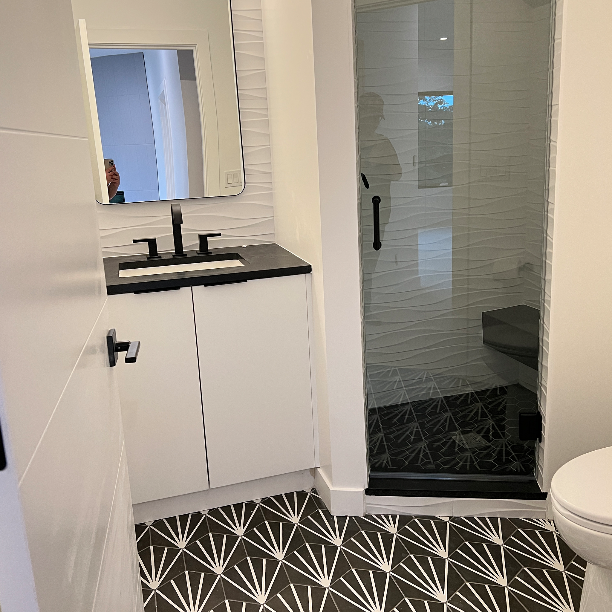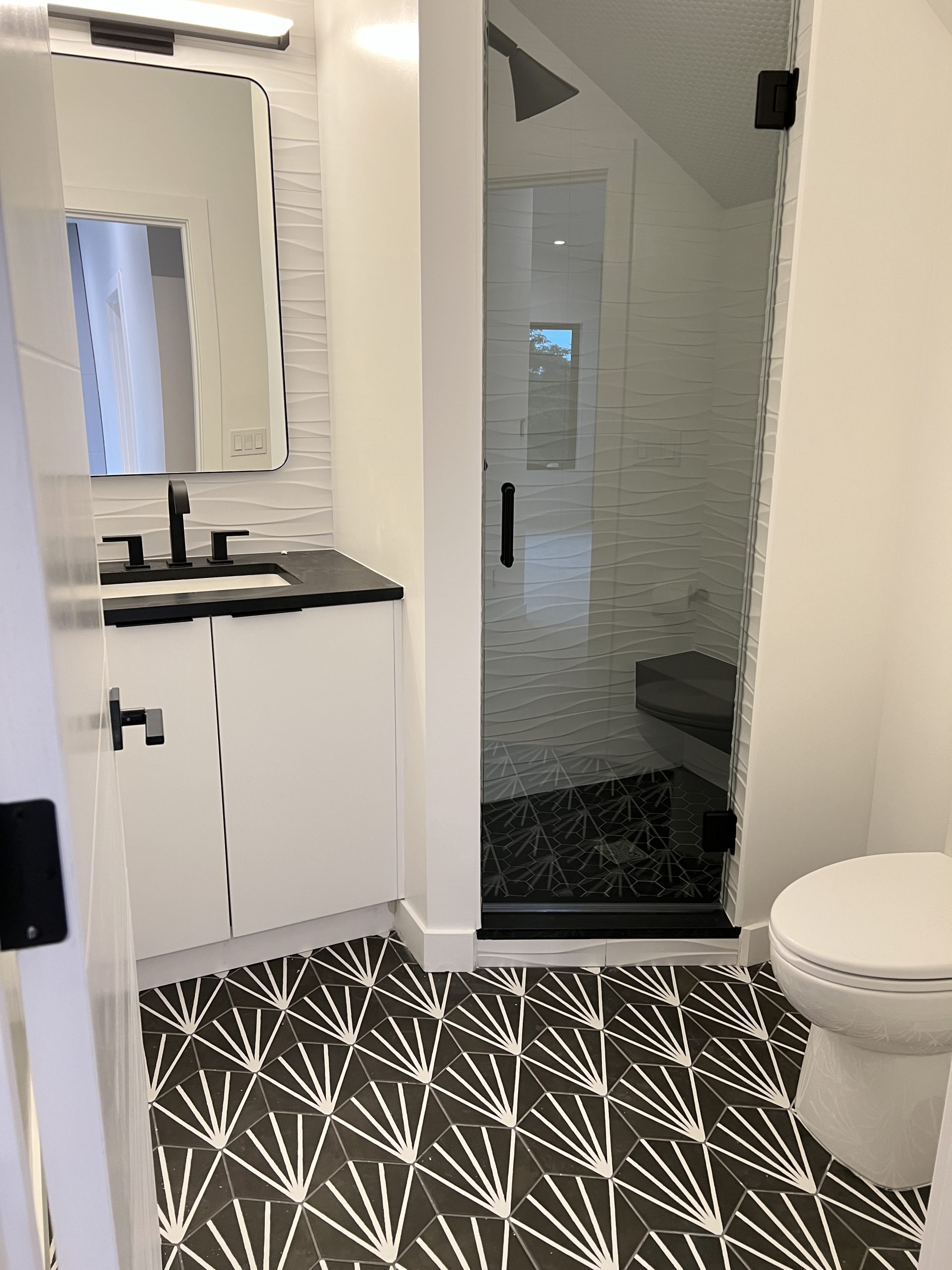 In the guest bath, playful geometric floor tiles contrast crisp white cabinetry and matte black hardware for a youthful, graphic touch.