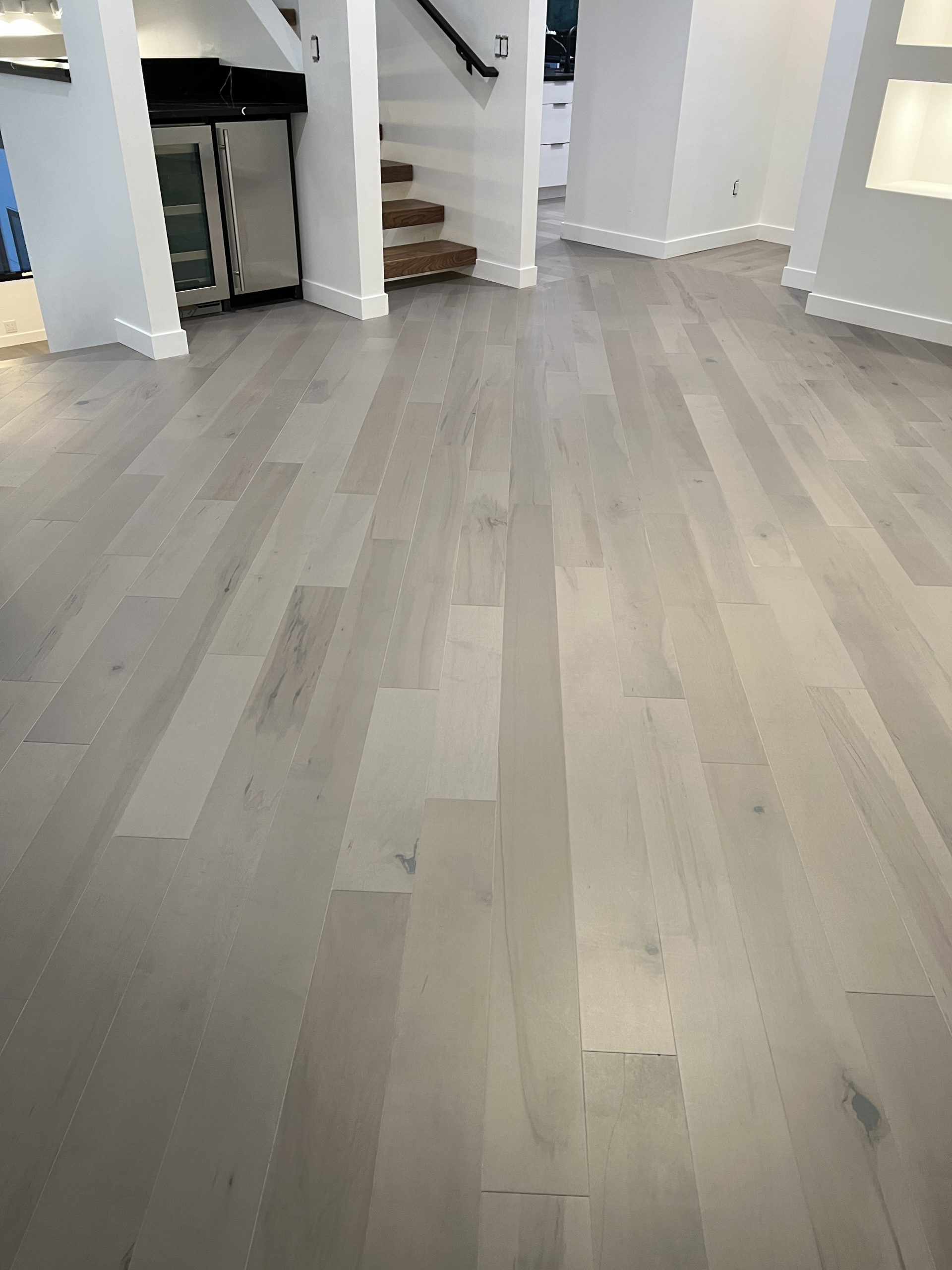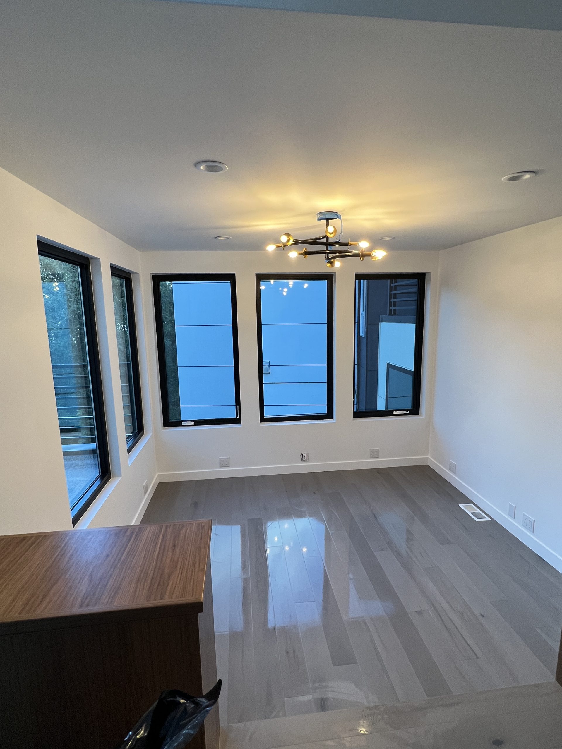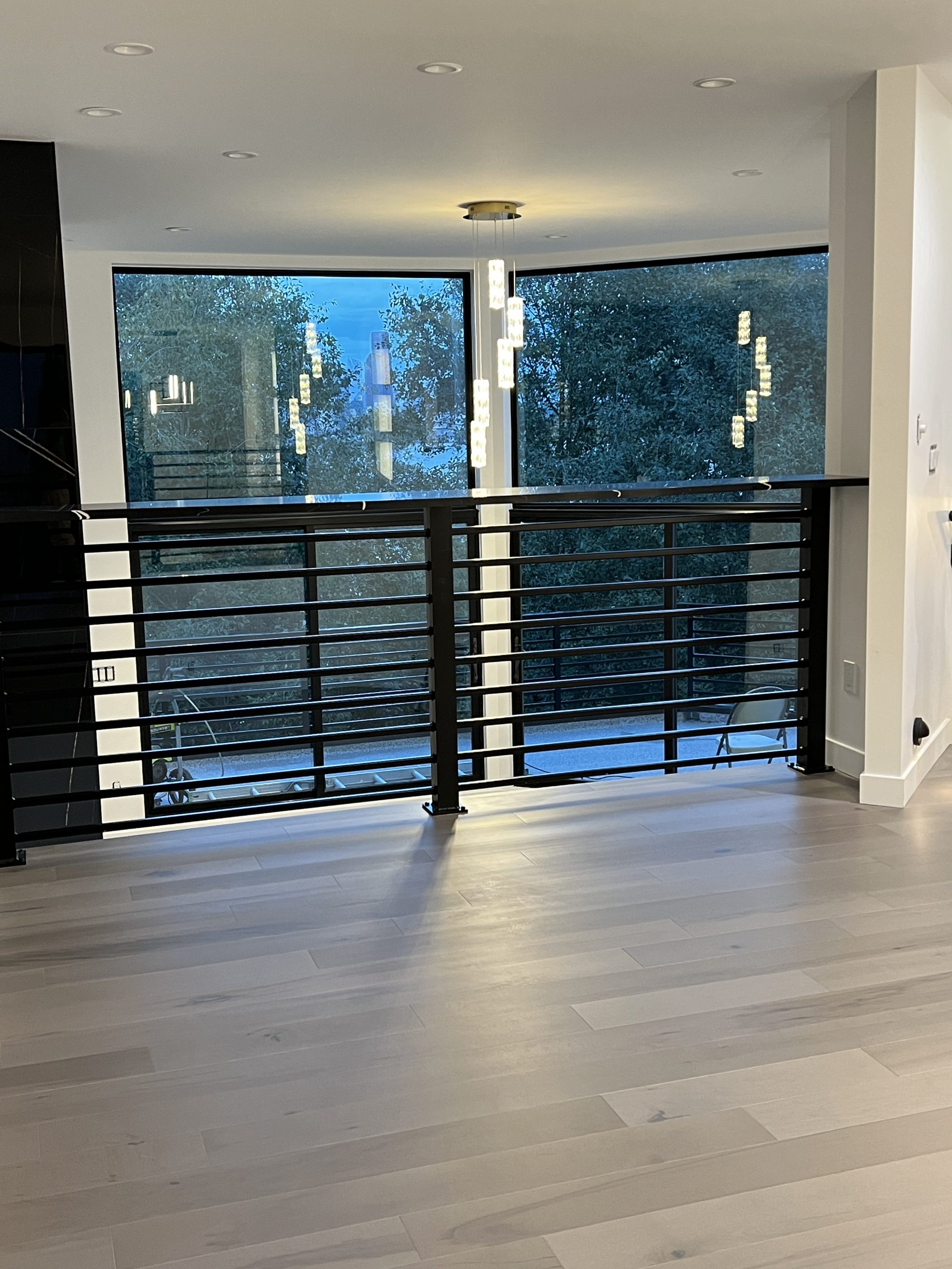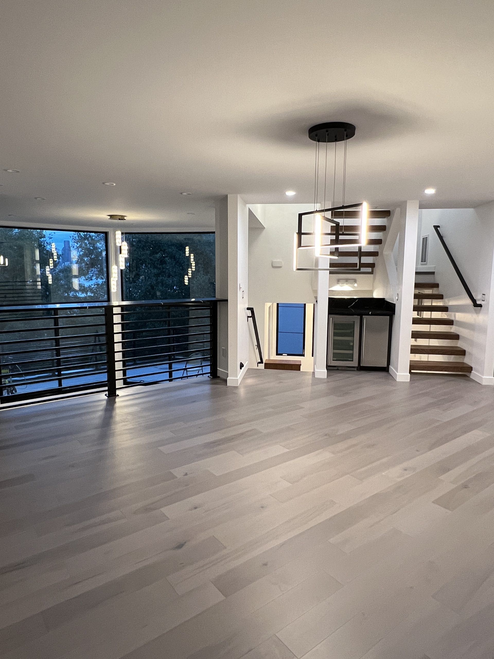 Modern pendant lighting and engineered wide-plank flooring