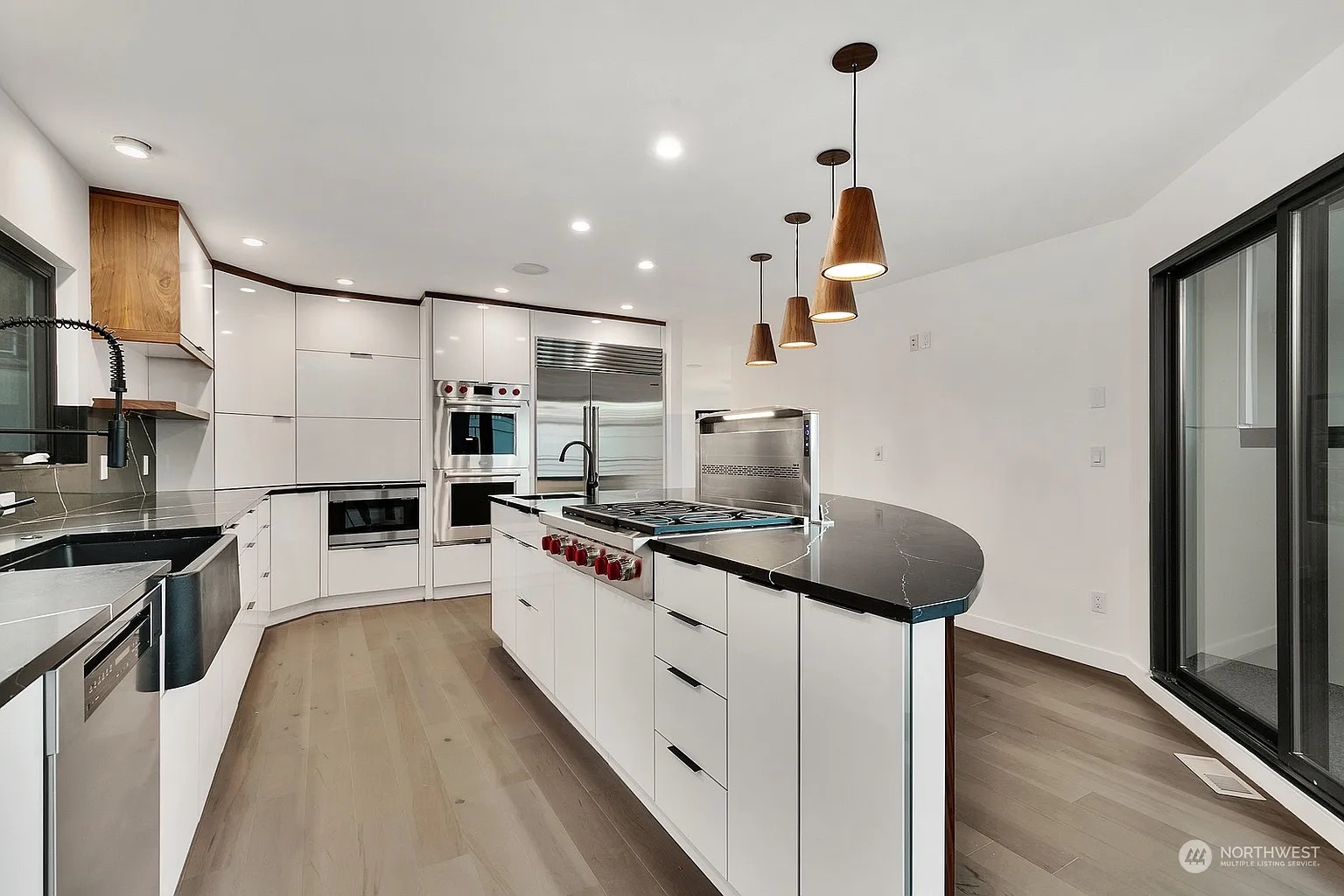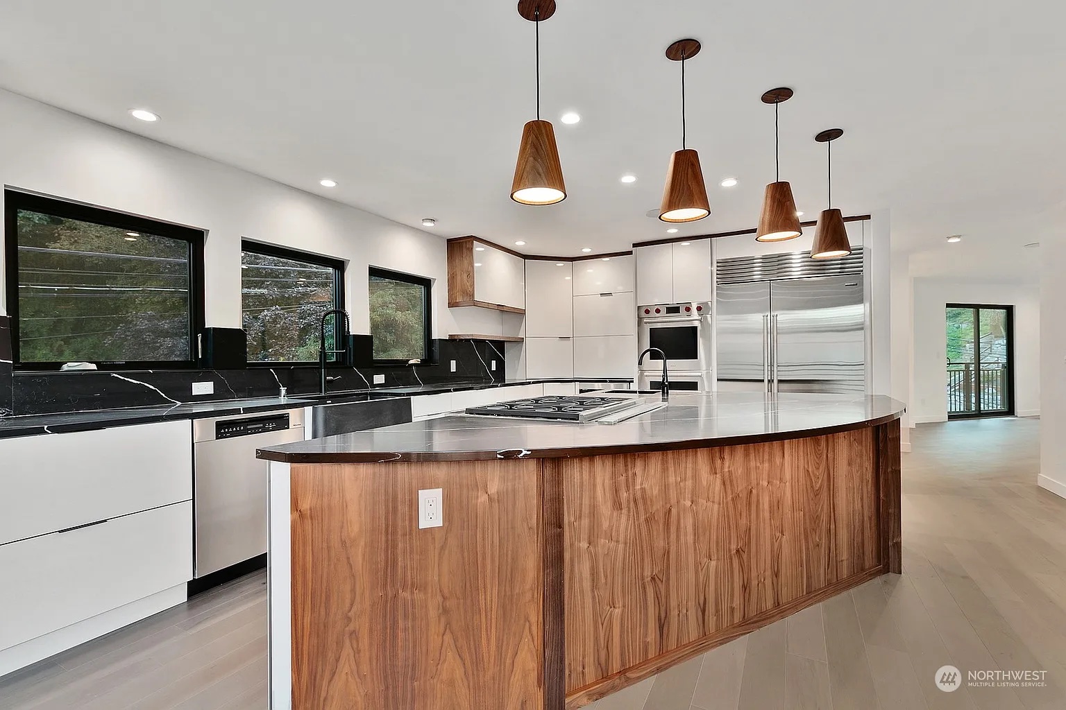 A sculpted black quartz waterfall island anchors the space, complemented by integrated Sub-Zero refrigeration, Wolf cooking appliances, and minimalist wood pendant lighting for an organic touch.