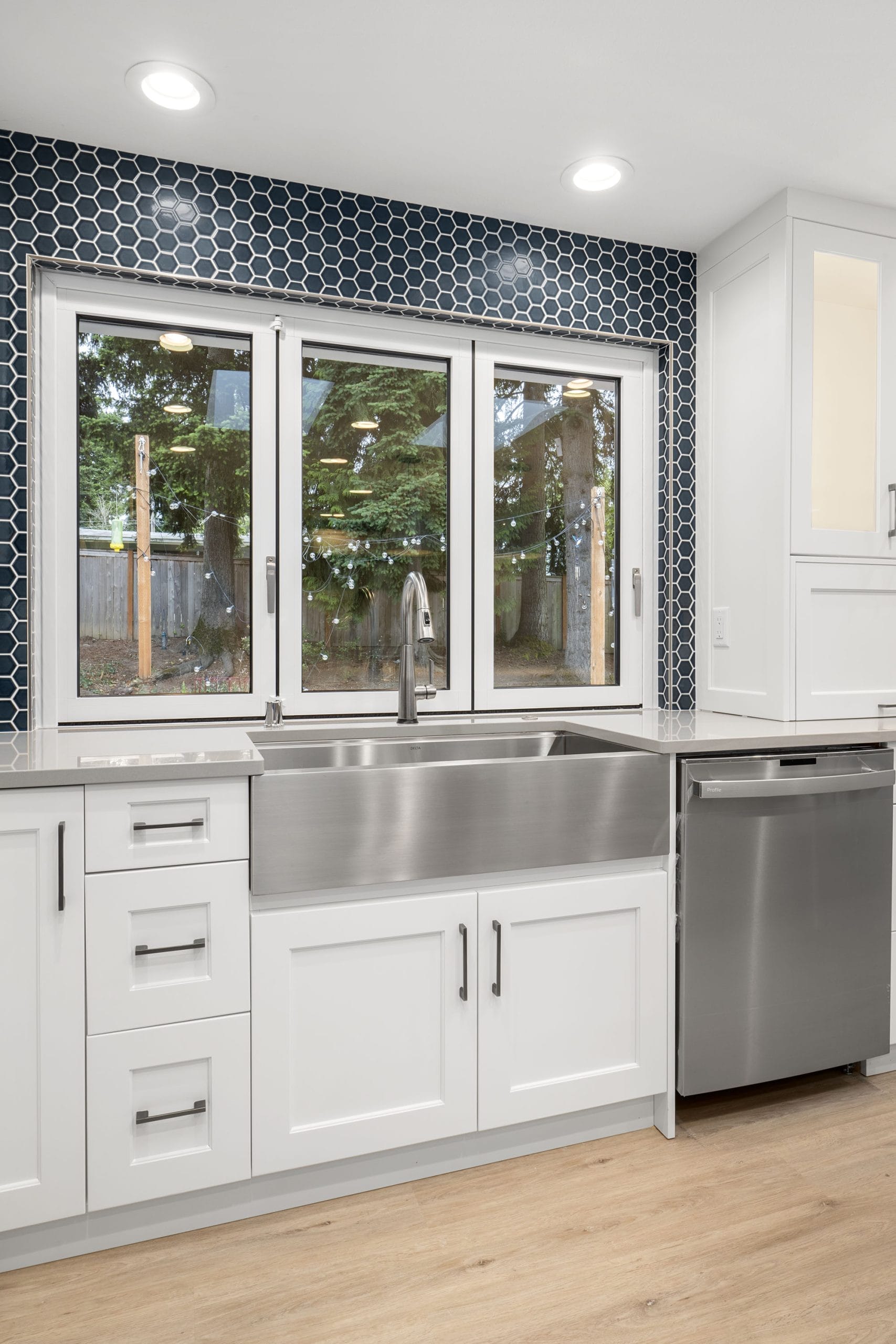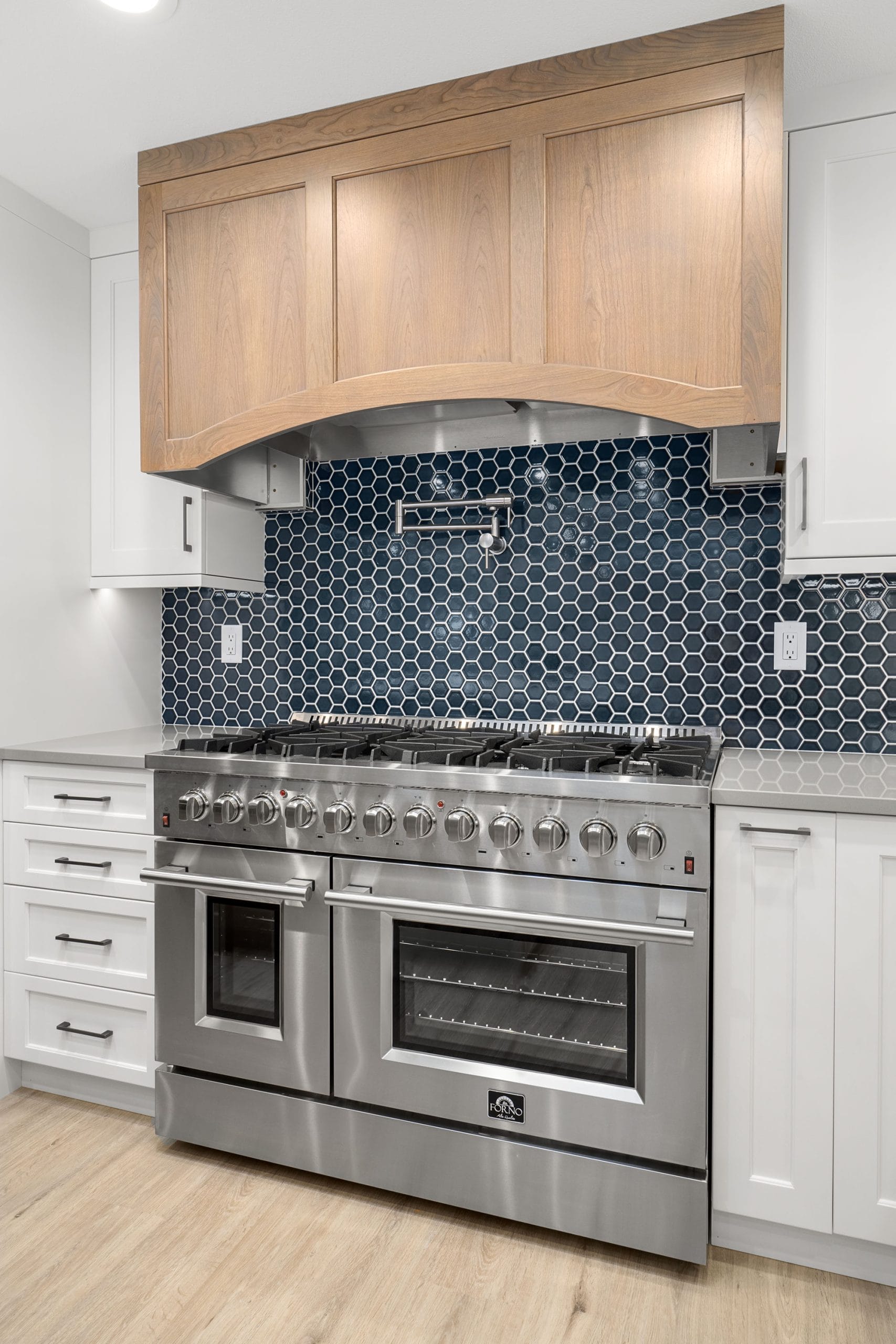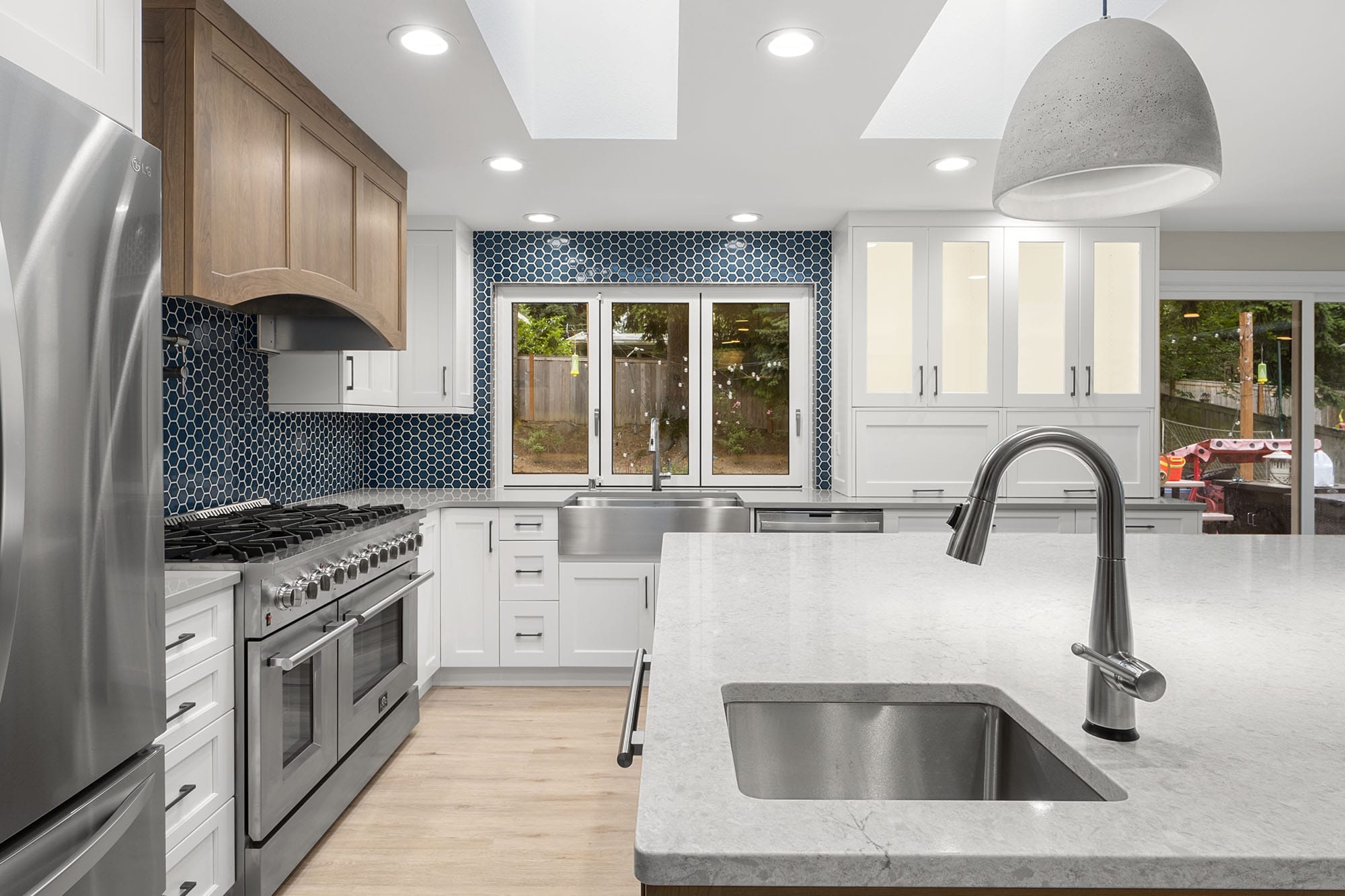 The natural wood island anchors the space with warmth and texture, while crisp white shaker cabinetry keeps the design bright and open. A deep blue hex tile backsplash adds bold contrast and a touch of personality, complemented by stainless steel appliances and a custom wood range hood.