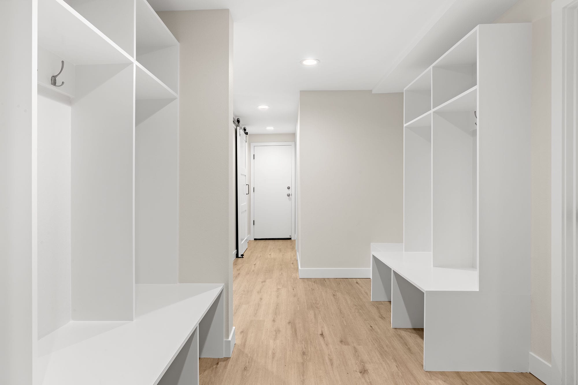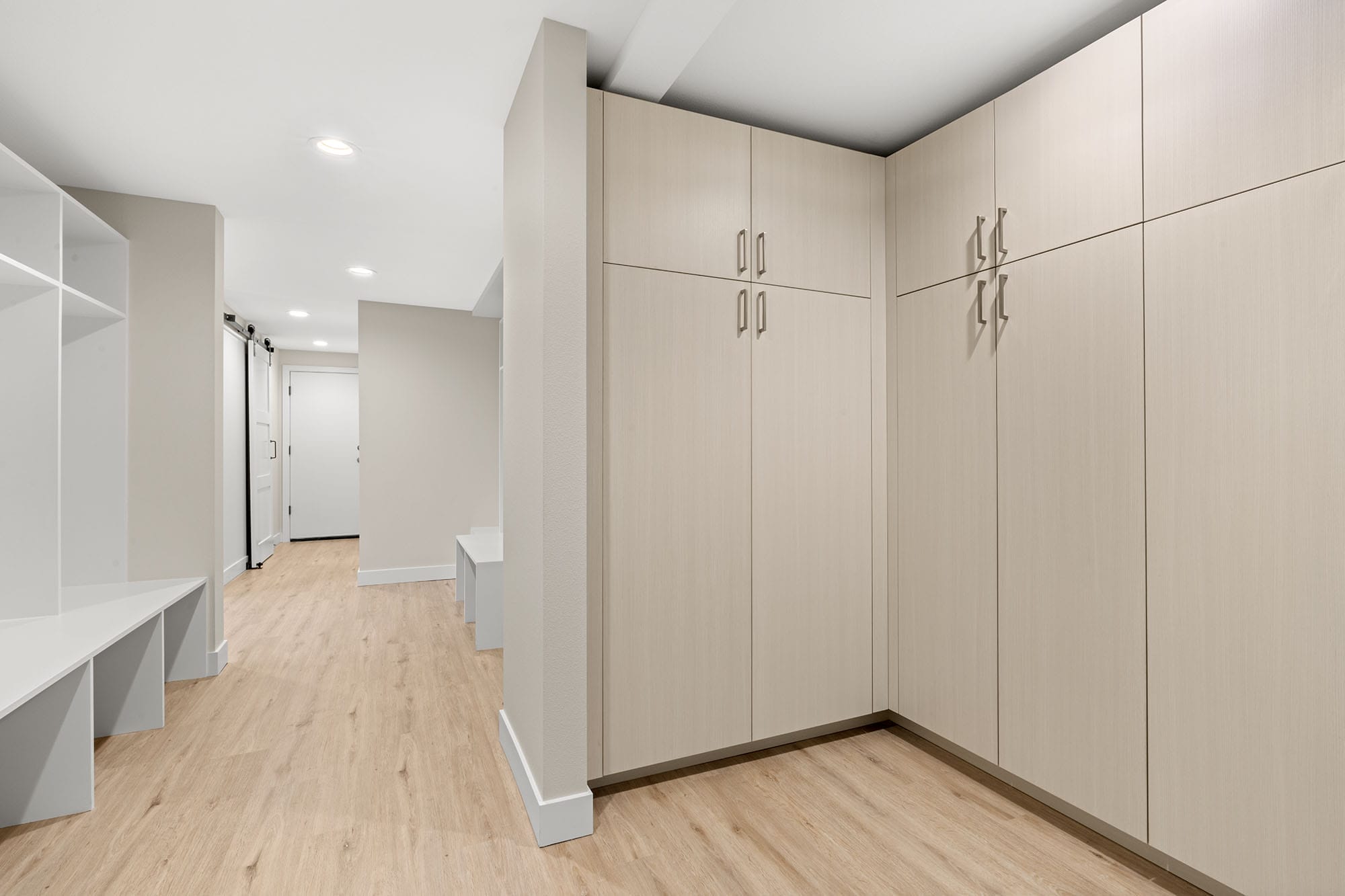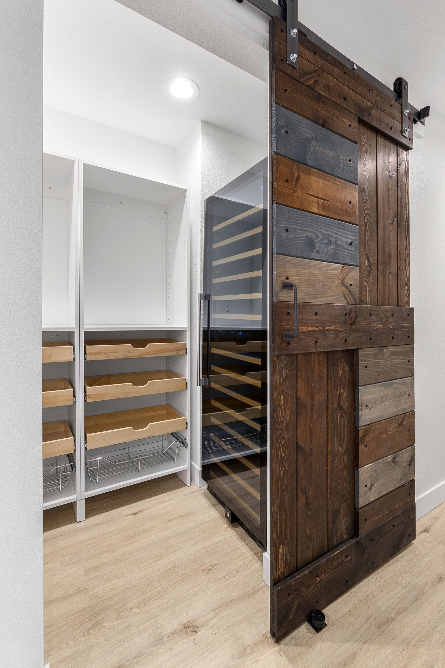 Outfitted with Sollera pull-out shelving and a wine refrigerator, this space blends rustic character with modern organization. The mixed wood tones of the barn door tie seamlessly into the home’s natural design palette.